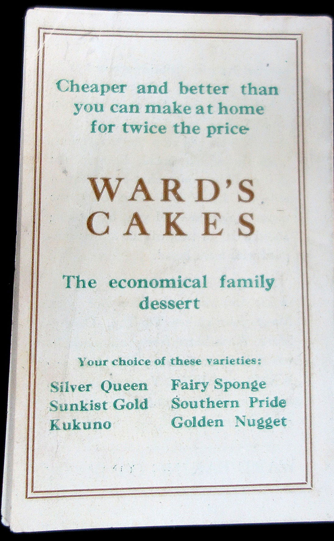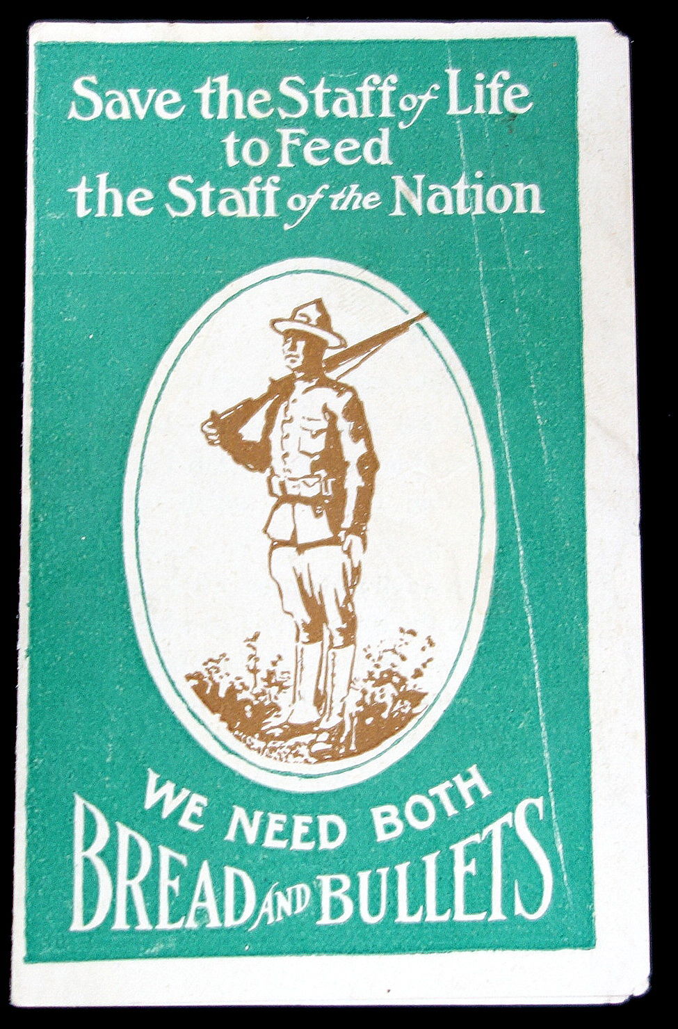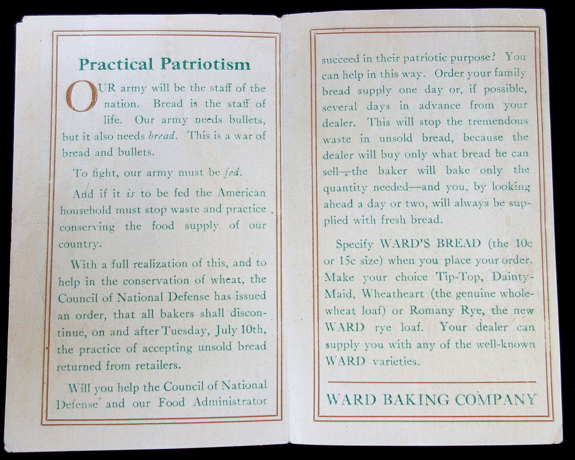 Ward Baking Company, 1915. With the slogan "We need both Bread and Bullets" across the front cover, the Ward Baking Company helped the Council of National Defense in its conservation of wheat during the World War I. This pamphlet explains the need for rationing bread on the home front. Printed in brown and green the cover depicts a soldier with a rifle over his shoulder standing in a grassy field. Measures 4" x 2 ½