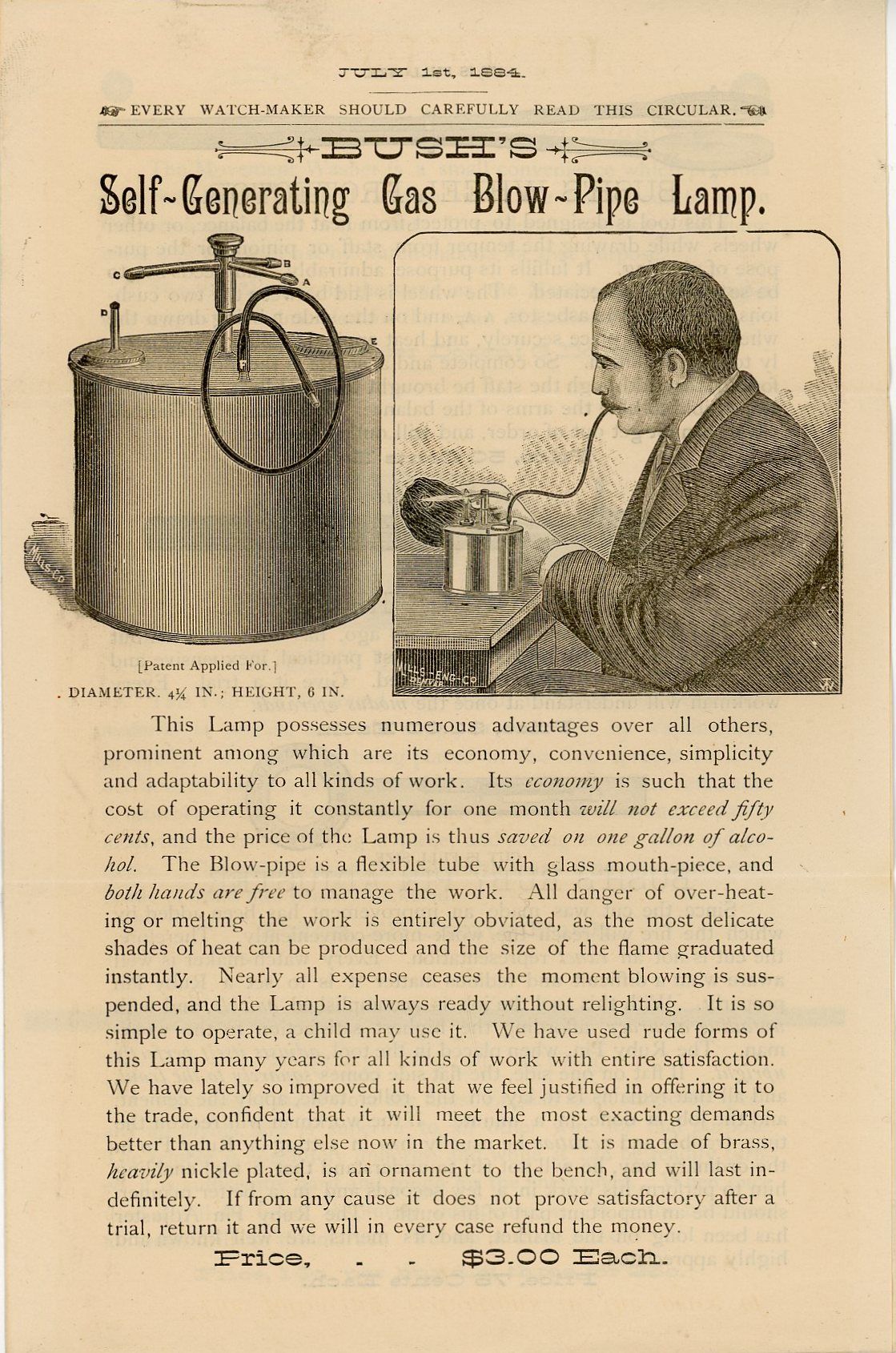 Bush's Watchmakers Catalogue Circular featuring Self- Generating Gas Blow-Pipe Lamp