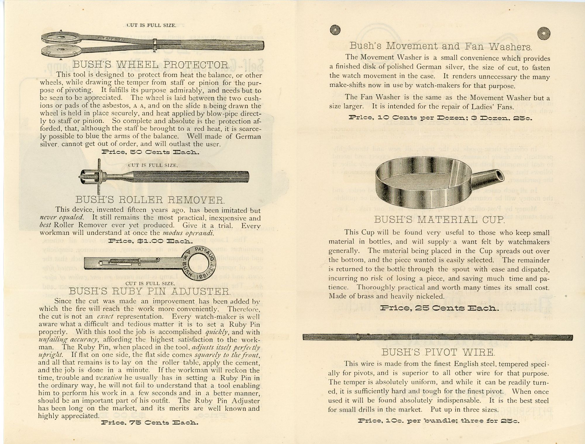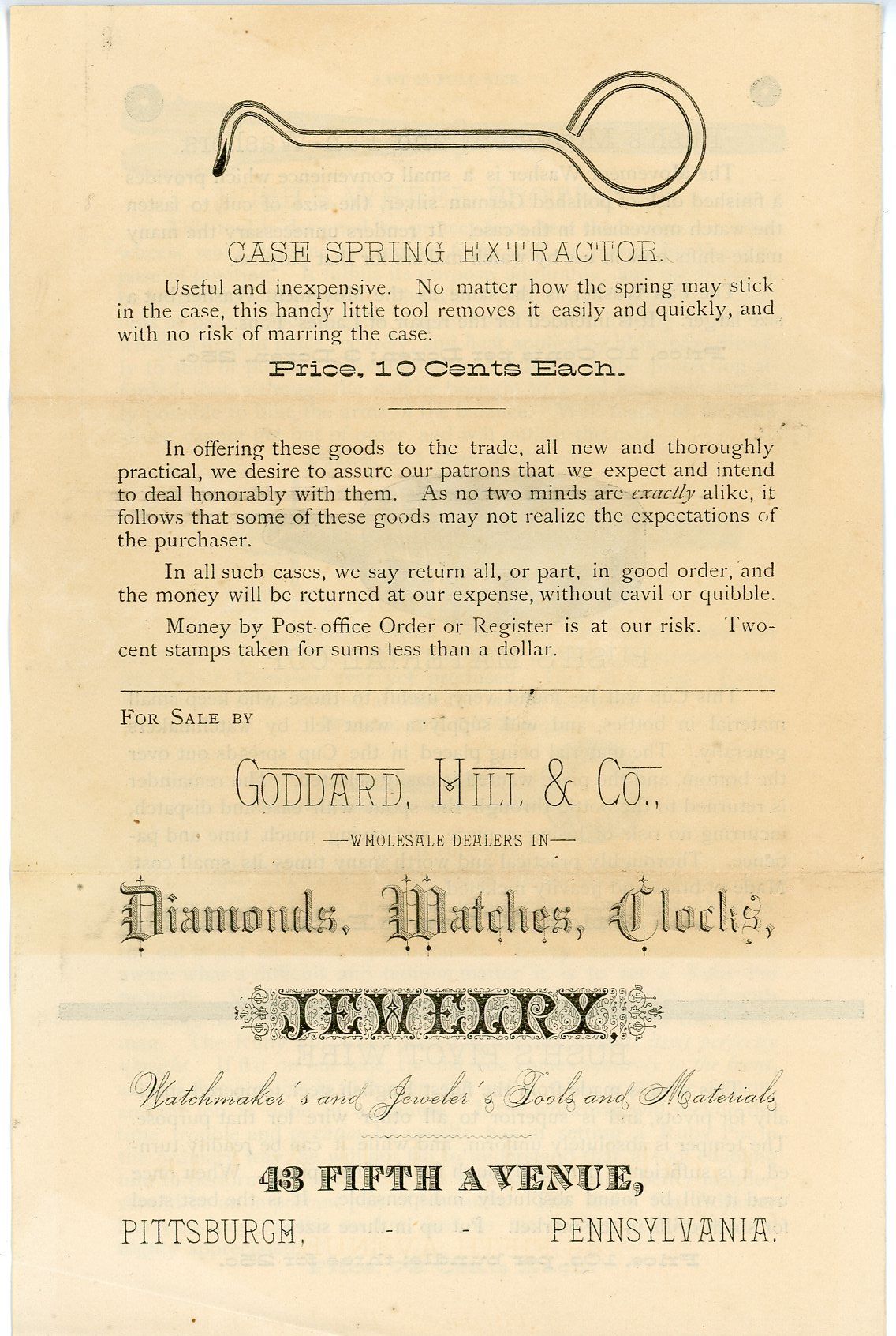 Pittsburgh, PA, 1844. A 4pp circular featuring images, narrative and pricing information on the Self-Generating Gas Blow-Pipe Lamp, Bush's Wheel Protector, Roller Remover, Ruby Pin Adjuster, Movement and Fan Washers, Material Cup, Pivot Wire and Case Spring Extractor. For sale at Goddard, Hill & Co. Jewelry. Pittsburgh, PA. Measures 8 1/2"x 5 1/2". Letterfolds.