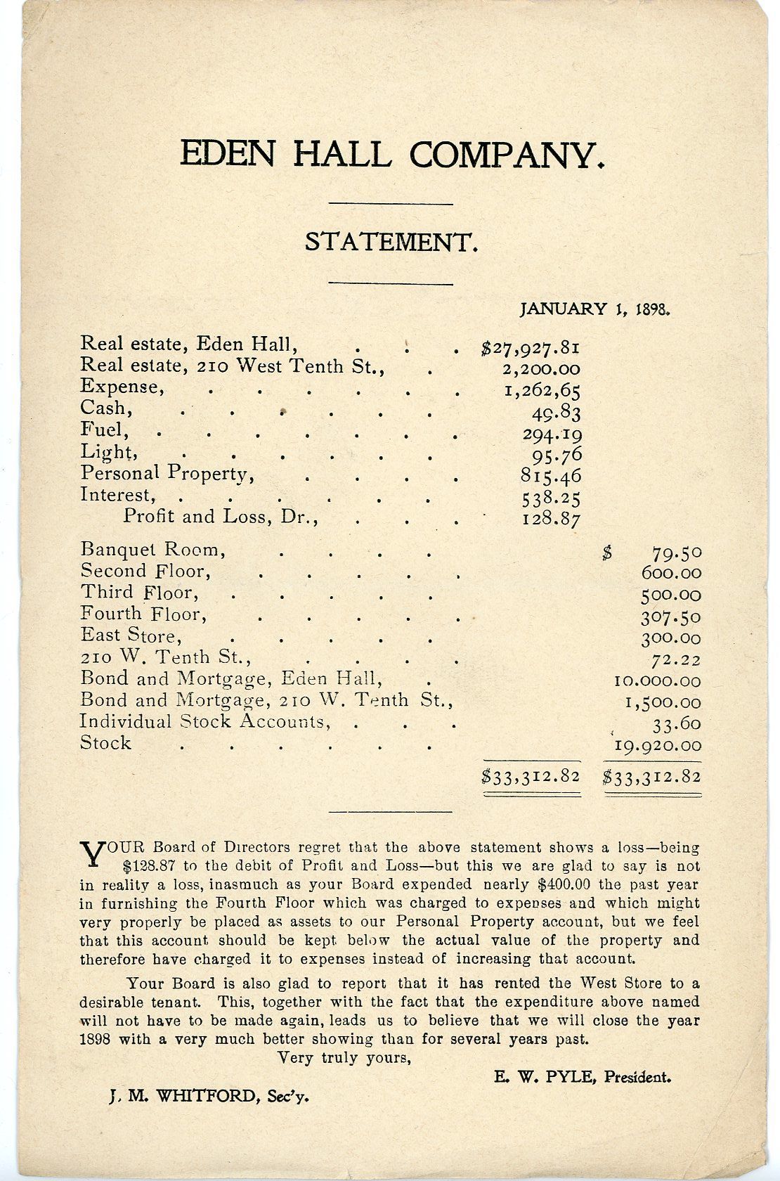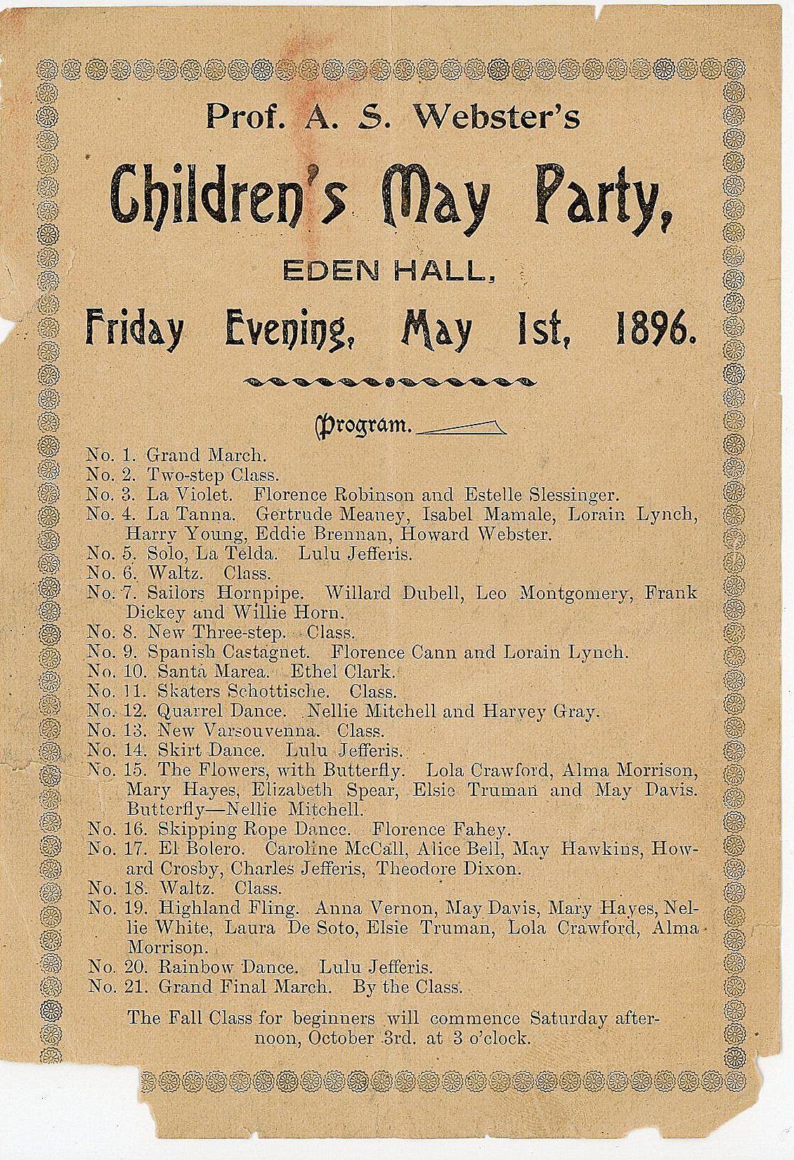 WilmingtonDE, 1896. An 8" x 5 1/2" program for the Children's May Party at Eden Hall held May 1, 1896. It includes 21 dances. At the end of the program is a note indicating Fall class for beginners will commence Oct. 3. Reverse is blank. Additionally a single sheet financial statement on Eden Hall Company Jan. 1898. Each measure approximately 8" x 5 1/2" Established in 1871 Prof. A. S. Webster's Select Dancing Academy. Located at Eden Hall in Wilmington DEL. Classes for Gentlemen, Ladies and Ladies and Children.