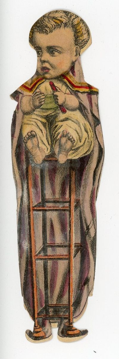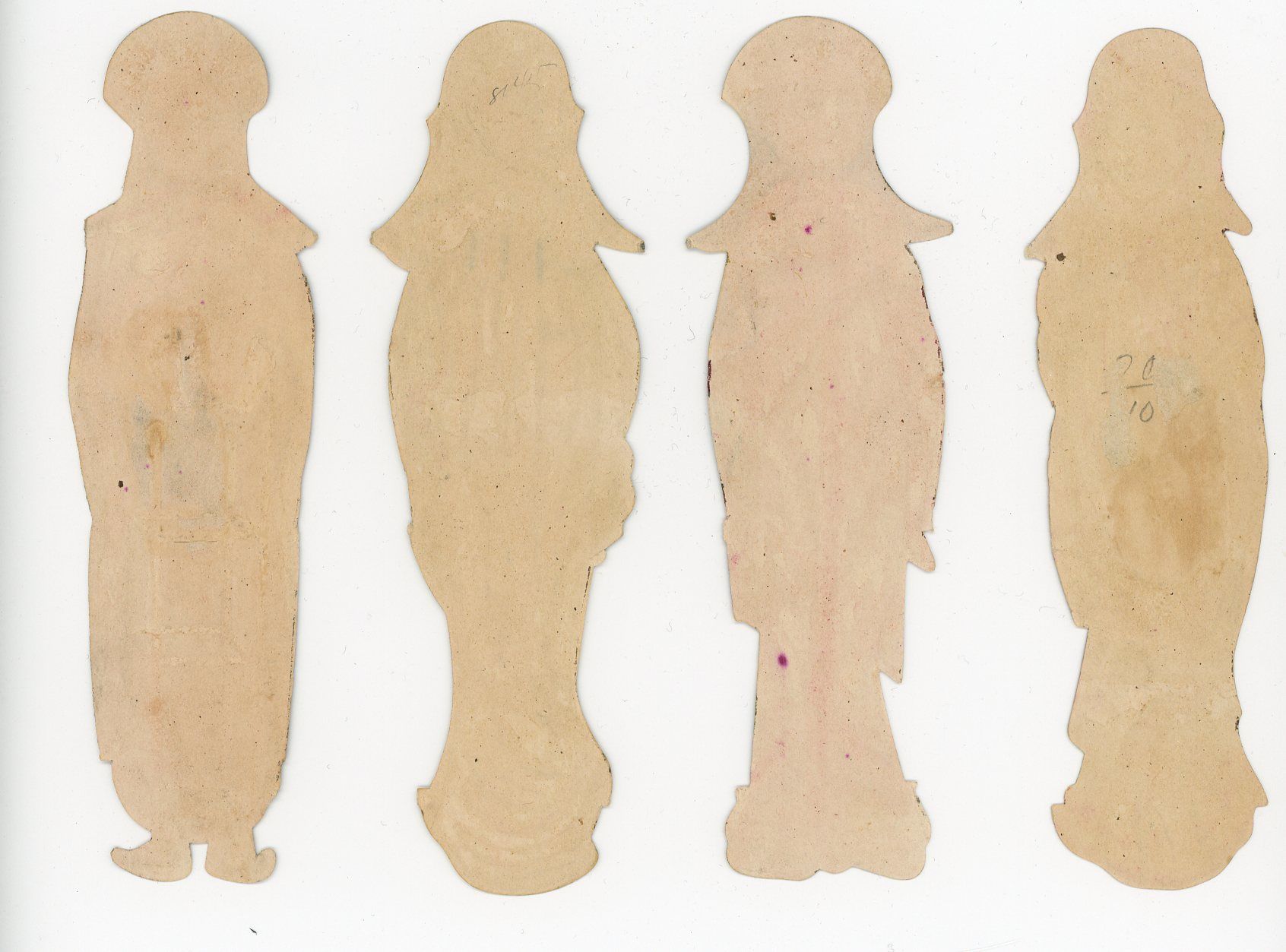 1870. Four (4) different 6" embossed die-cut Victorian scraps of infants or young toddlers. Each with a different flowing gown. Three of the four hold objects. One is in a high chair with the tails of the gown tucked under the legs of the chair. What makes these items particularly unusual is the maturity of their faces and the deep set eyes. Reverse is blank.