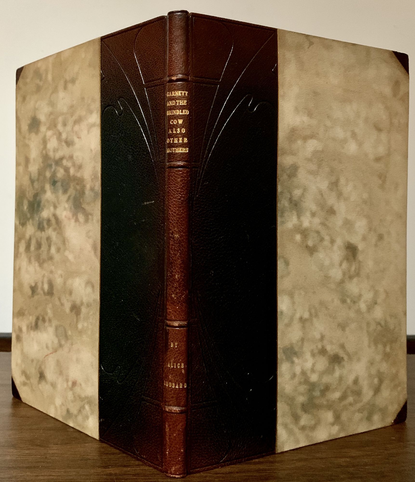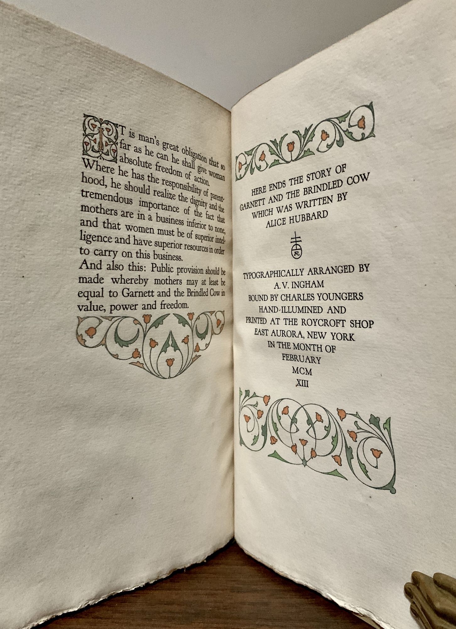 East Aurora: Roycrofters, 1913. First edition. Hardcover. Orig. half brown morocco, morocco tips, backstrip bands, Art Nouveau design in blind, lettering in gilt and marbled boards with matching endpapers. Fine. Unpaginated. 24 x 15.5 cm. Limited edition, copy 189 of 1003 signed by Alice Hubbard, all copies illumined by hand. Illustrated with photographs, latter with tissue guards. Unopened, bright, very fresh copy.