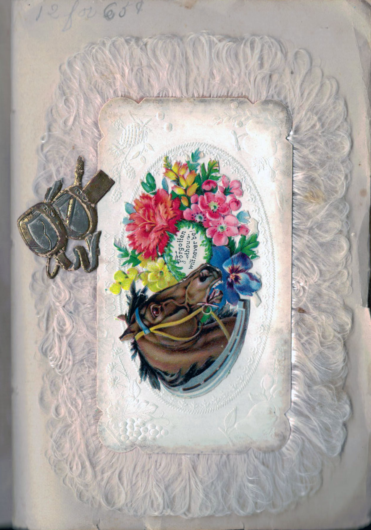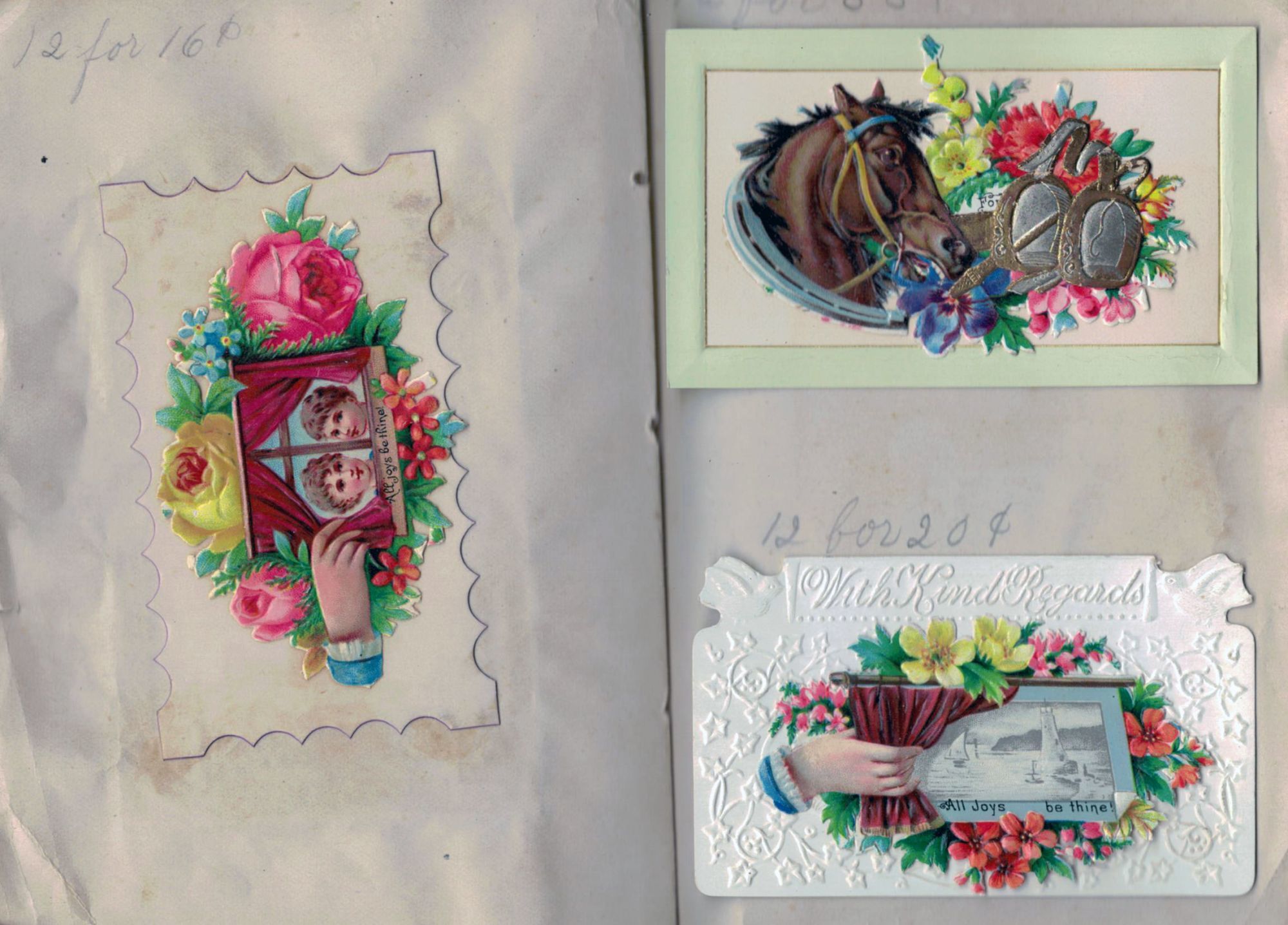 New Haven: E. H. Pardee, 1880. Hardcover. Orig. brown cloth decorated in blind with front cover lettered in gilt. Very good. 15.5 x 10 cm. More than 25 leaves with over 70 mounted, mostly chromolithographs, embossed color card samples with prices written in pencil. The images carry the Victorian sentimentality of the time; with inscriptions -- "Hope sustain thee ever, Love and best wishes, I love thee dearly, Kindest regards, Remember your friend," et al. Elaborate raised embossing in gilt and a kaleidoscope of colors with most card sizes approx. 9 x 5 cm. A few of the cards with lace embroidered frames. Edges of some paper background sheets frayed at front cover margins. Images are clean, a few quires loose.
