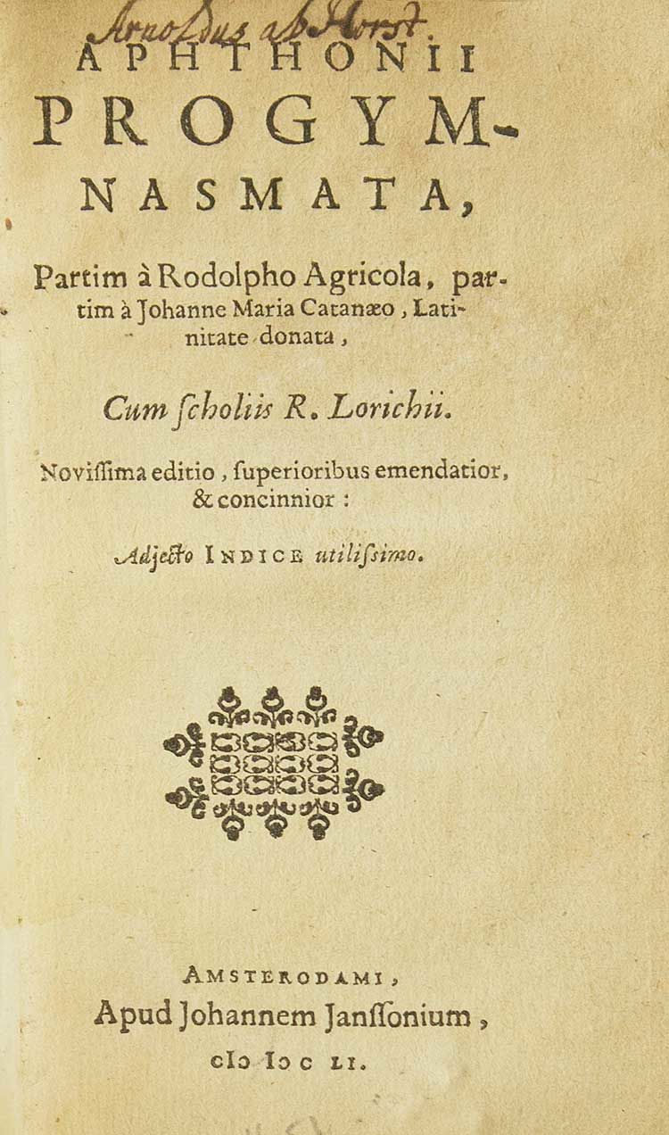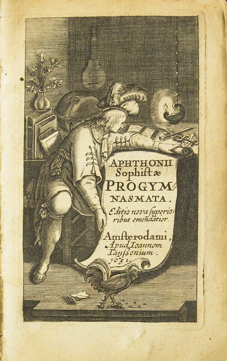 Amsterdam: Johannes Janssonius, 1651. Additional engraved pictorial title page dated 1631. 16mo. Contemporary vellum. Very good. Additional engraved pictorial title page dated 1631. 16mo. The Latin version by Agricola of this treatise by the famed rhetorician of Antioch, Aphthonius. From the library of Henryk Conwell, Bishop of Philadelphia. Provenance: Henry Conwell, Bishop of Philadelphia (bookplate)