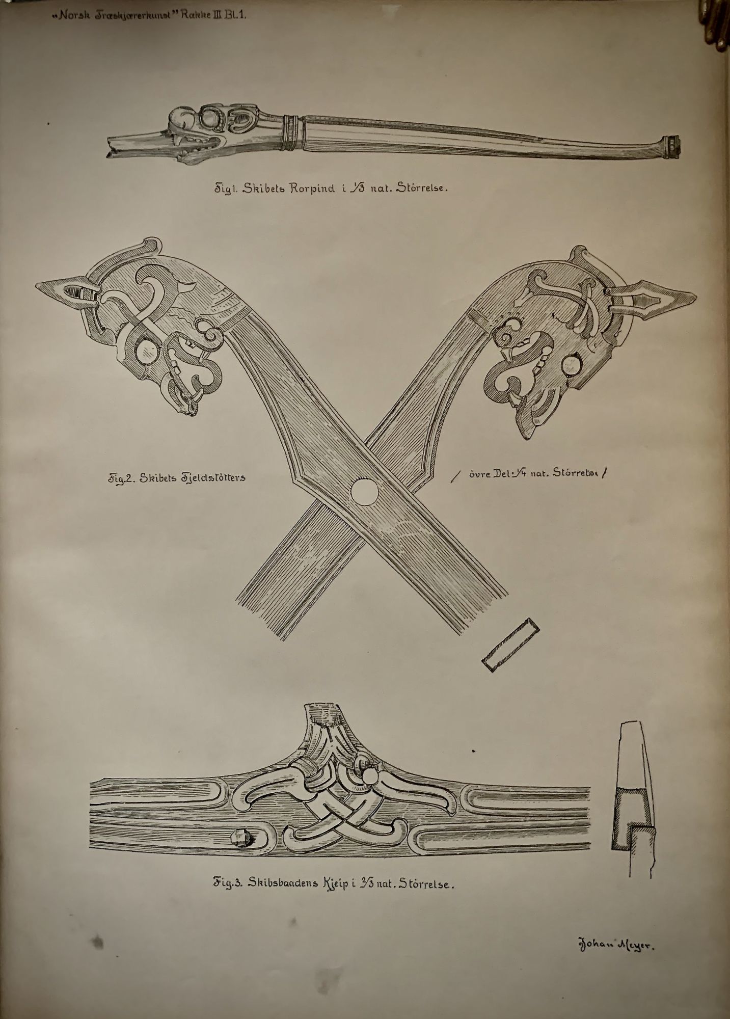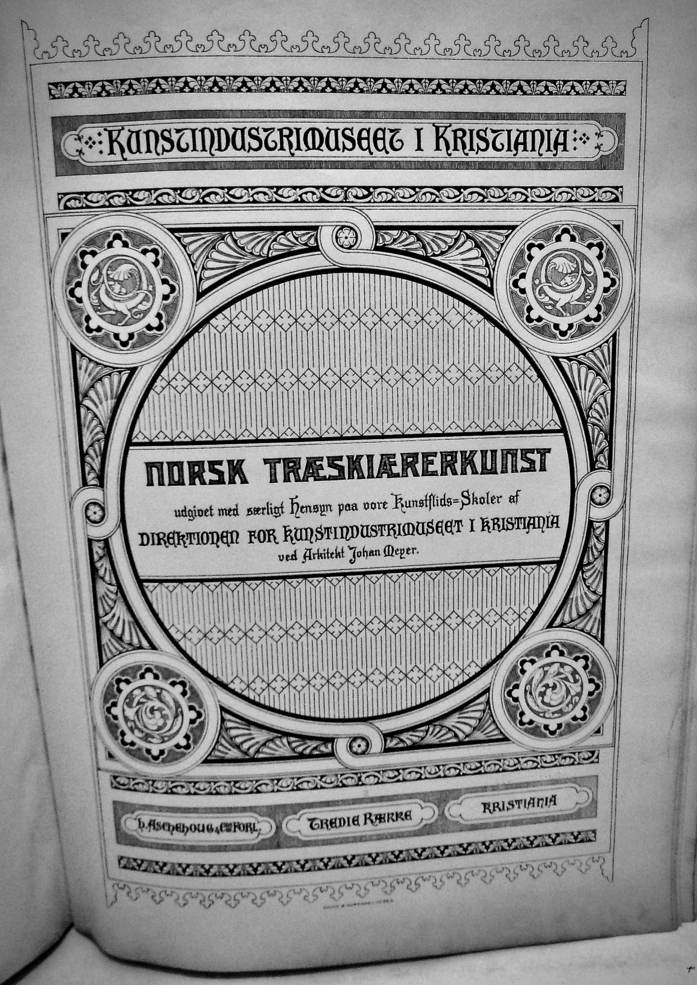 Kristiana: Aschehaug, 1905. First edition. Hardcover. Brown buckram. Very good. Folio, 57 x 42 cm. Nos. 1-3 complete, each with nine black and white multiple illustrations per page, mostl with images to scale. Woodwork examples from the early Norse period. Index of plates, text in Norwegian. Only copy located in USA at New York Public Library. Ex-lbrary, plates unmarked. Some minor nicks to plate edges, plates are clean and bright, wear to cover corners and backstrip extremities, binding tight.