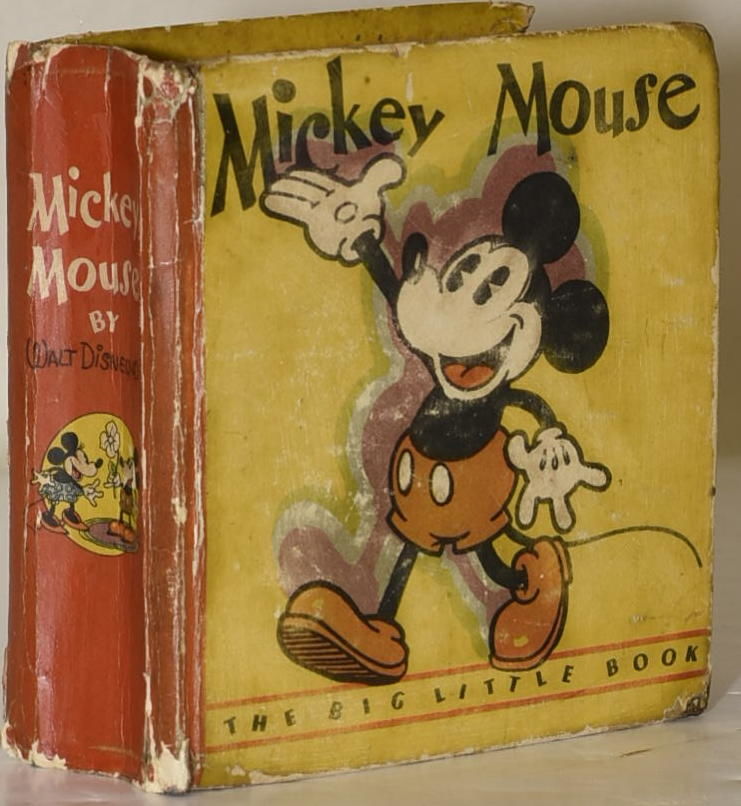 Racine, Wisconsin: Whitman Publishing Company, 1933. Second Edition. Pictorial Boards. Very Good binding. A clean copy of the Second Edition of Mickey Mouse, with the regular Mickey Mouse on the front cover. Big Little Book #717. Contains all pages, including the advertisements at the rear. The first leaf has a previous owner’s name and date written on the recto. Bound in pictorial boards with wear to the edges and corners. Spine has small closed tears to the top edge, and is curved inward but still attached and otherwise intact. Hinges have been neatly repaired with Japanese tissue by a conservator. 4 x 4.5 inches. Very Good binding.