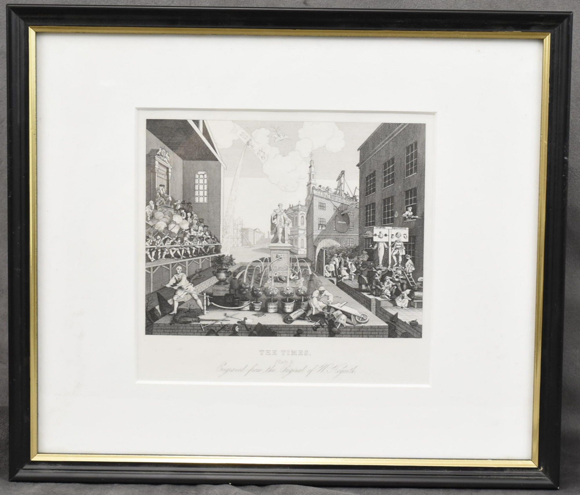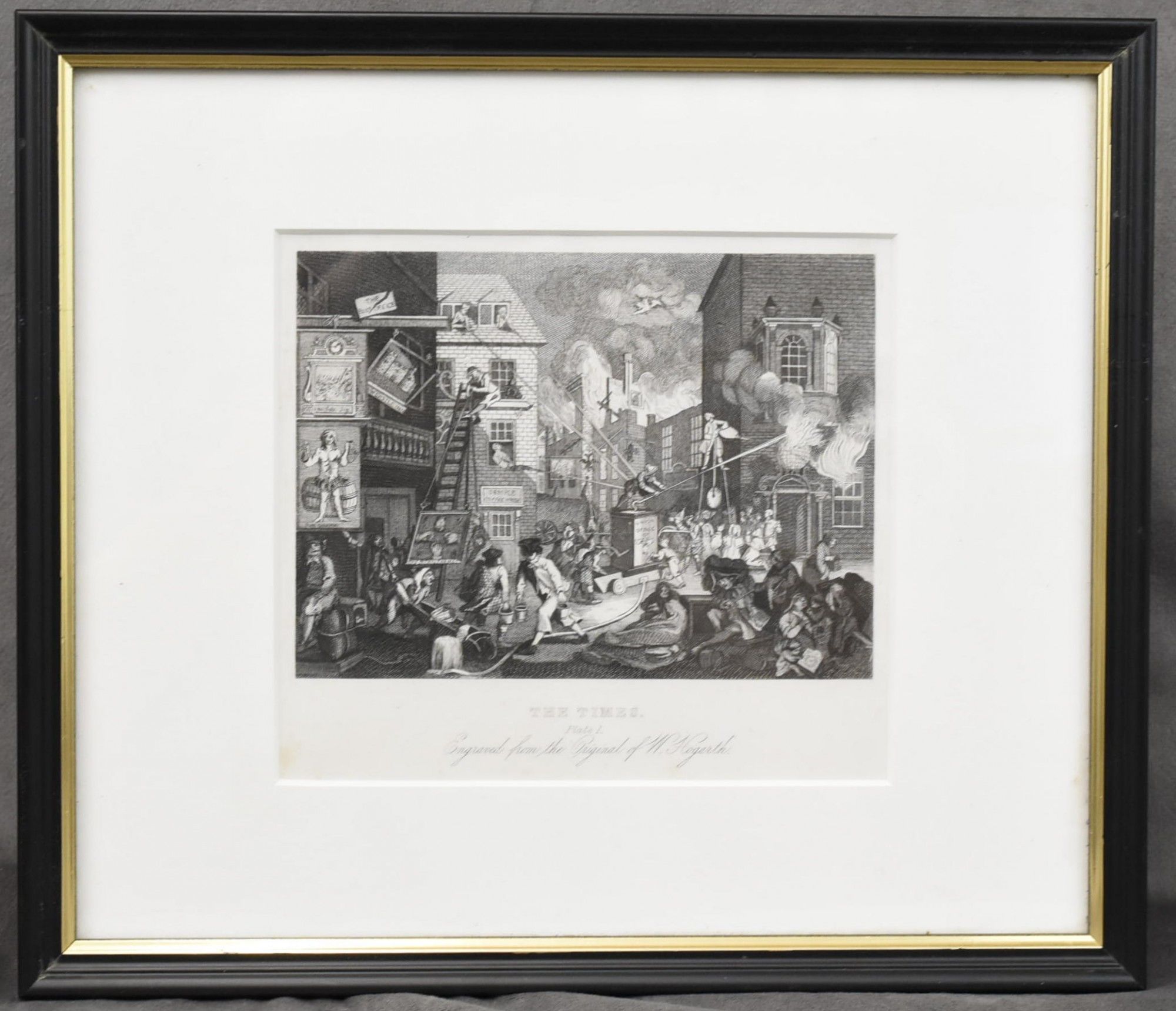 Very Good binding. Both plates of "The Times", which were originally painted and subsequently engraved by William Hogarth. Neatly framed in black with gilt fillets. Pages in protective sleeves from the 19th century book, Hogarth's Works... by John Trusler and E. F. Roberts are attached to the rear of the frames, describing and identifying the plate in question. "The Times" were a surprisingly overt and uncharacteristically political set of works by Hogarth, which support the King in his drive for peace during the Seven Years War against France. Plate I shows the leader of the House of Commons literally fanning the flames of war, as well as the Lord Mayor of London advertising slaves and tobacco from the colonies. Plate II shows the alternative, with King George III presiding over a veritable garden of peace, with his political opponents in the pillory and all right in the world. Very Good binding.