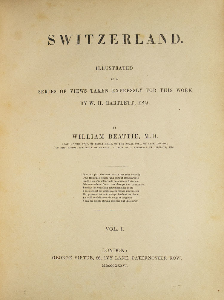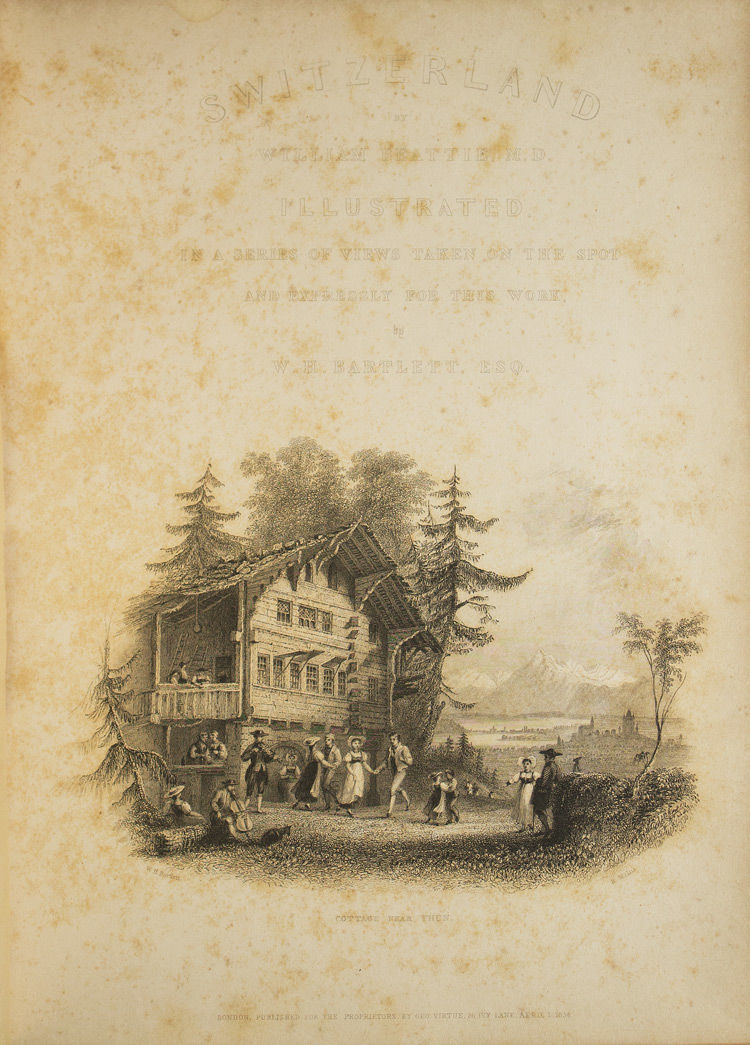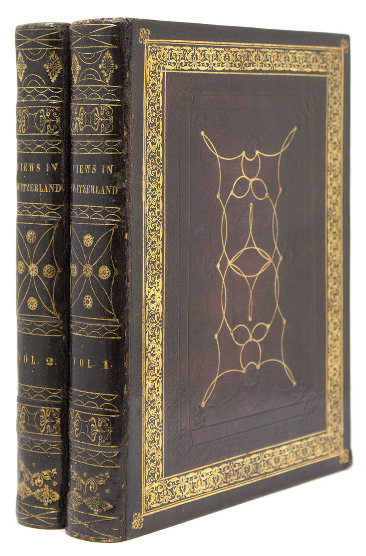 London: George Virtue, 1836. First edition. Two steel-engraved title-pages and 106 steel-engraved plates after William Henry Bartlett, one folding lithographic map. 2 vols. 4to. Contemporary purple morocco. Covers tooled to panel design with roll borders in blind and gilt, with geometric design of semicircular gouges in blind and gilt to central panel, gilt turn-ins. Light rubbing to covers, plates foxed. First edition. Two steel-engraved title-pages and 106 steel-engraved plates after William Henry Bartlett, one folding lithographic map. 2 vols. 4to. "The indefatigable Bartlett was the chief producer of volumes of steel-engraved views. For many years he ranged through two continents making or collecting drawings …. Collectors not seeking representations of familiar scenes will probably find the grandeur of his Swiss subjects most appealing" (Ray). Ray, England 65