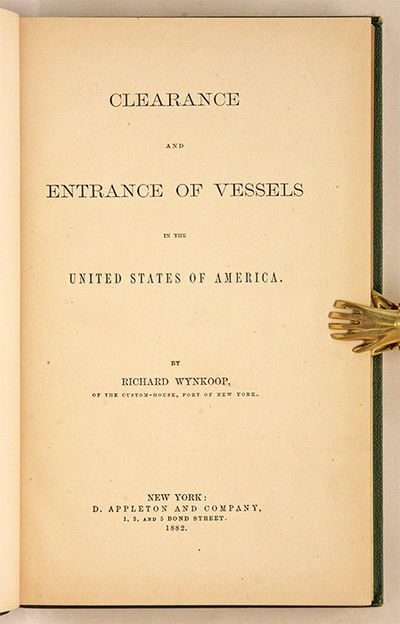 1882. Rare Nineteenth-Century American Treatise on the Clearance and Entrance of Vessels Wynkoop, Richard [1829-1913]. Clearance and Entrance of Vessels in the United States of America. New York: D. Appleton and Company, 1882. 199 pp. [With] Wynkoop, Richard. Supplement to Clearance and Entrance of Vessels [Running Title]. [New York: D. Appleton and Company], 1883. 46, [viii] pp. Includes 8-page publisher catalogue. Octavo (9" x 5-3/4"). Pebbled cloth, blind rules to boards, gilt title to spine. Light rubbing to boards, moderate rubbing to extremities with some wear to spine ends and corners, hinges starting, some toning to text, a few small marks to endleaves. A nice copy of a rare title. $500. * Second and final edition. Wynkoop was an officer at the U.S. Customs House of the Port of New York. The first edition of his treatise was published in 1881. OCLC locates no printed copies of either edition or any copies of the Supplement in any format. No editions listed in Marke or the 1909 Harvard Law Catalogue.