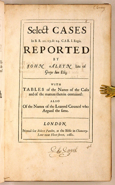 1688. Includes a Landmark Contract Case Aleyn, John. Select Cases In B.R. 22, 23, & 24. Car. I. Regis, Reported by John Aleyn Late of Greys Inn Esq; With Tables of the Names of the Cases and of the Matters Therein Contained: Also of the Names of the Learned Councel Who Argued the Same. London: Printed for Robert Pawlet, 1681. [viii], 95, [13] pp. Title page preceded by license leaf. Folio (11-3/4" x 7-1/2"). Contemporary calf, rebacked retaining spine, blind rules to boards, lettering piece to spine, neat early repair to head of spine. Light rubbing and a few minor nicks and scuffs to boards, moderate rubbing to extremities, corners bumped and somewhat worn, early armorial bookplate to front pastedown, hinges partially cracked. Moderate toning to text, somewhat heavier in places, brief early annotations to several leaves, early owner signatures to head of title page. $250. * First edition. Covers the Upper Bench 1646-1649. Wallace says this is a good set of reports and notes that it includes the landmark contract case of Paradine v. Jane, which established the principle of holding a contractor to a non-conditional obligation. A second edition of this reporter was published in 1688. Wallace, The Reporters 292f.