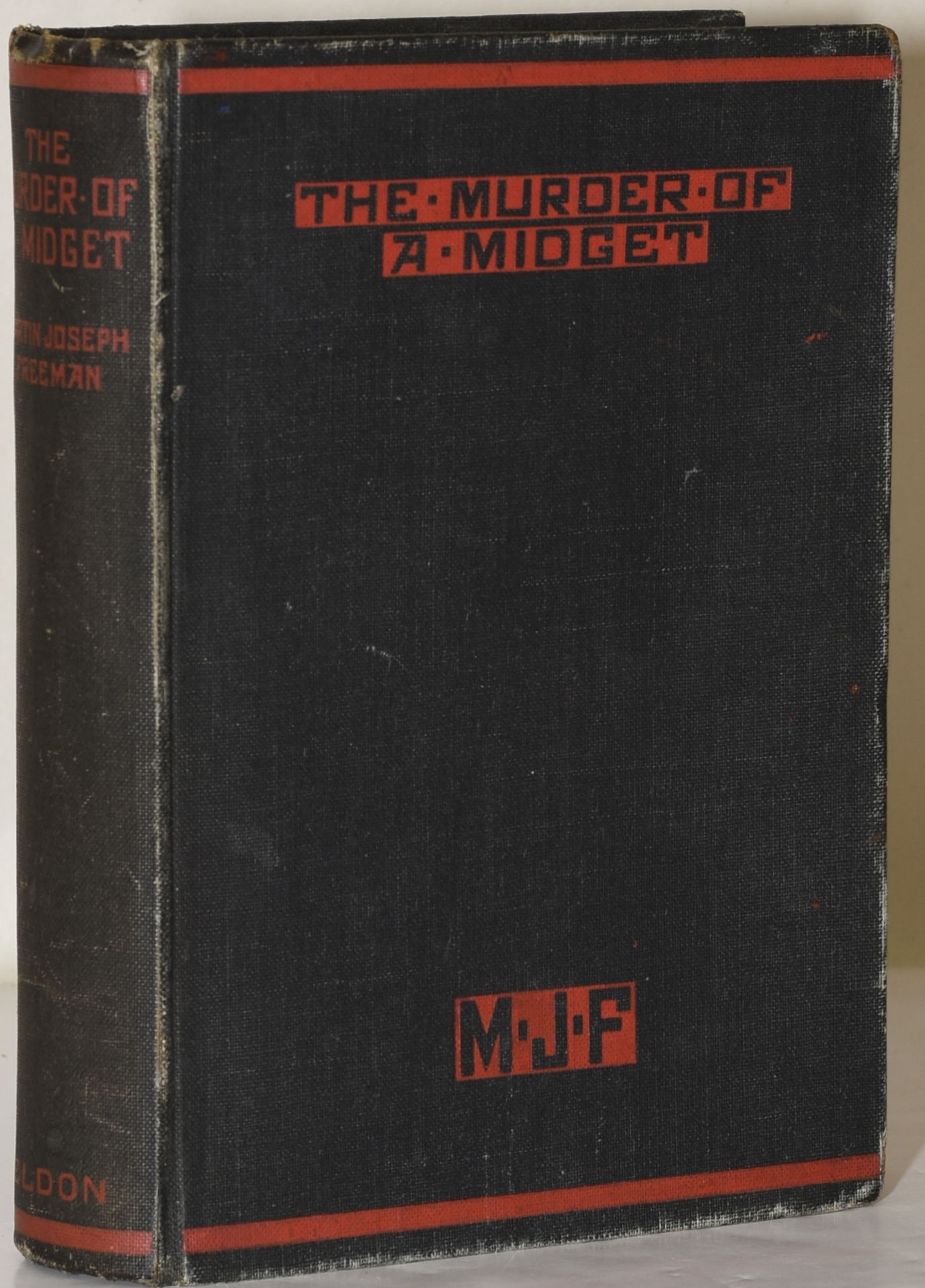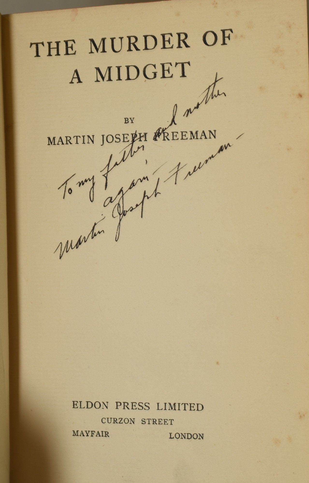 London: Eldon Press Limited, 1934. First English Edition. Hard Cover. Very Good binding. Signed. The corpse of a midget from the circus is found in a child's doll carriage -- a mystery by penned by a scholar of English literature. A presentation copy of the First English Edition of Martin Joseph Freeman's first book; inscribed by Freeman "To my father and mother" on the title page. The English Edition was published three years after the American; this copy lacking the dustjacket. Very Good binding.