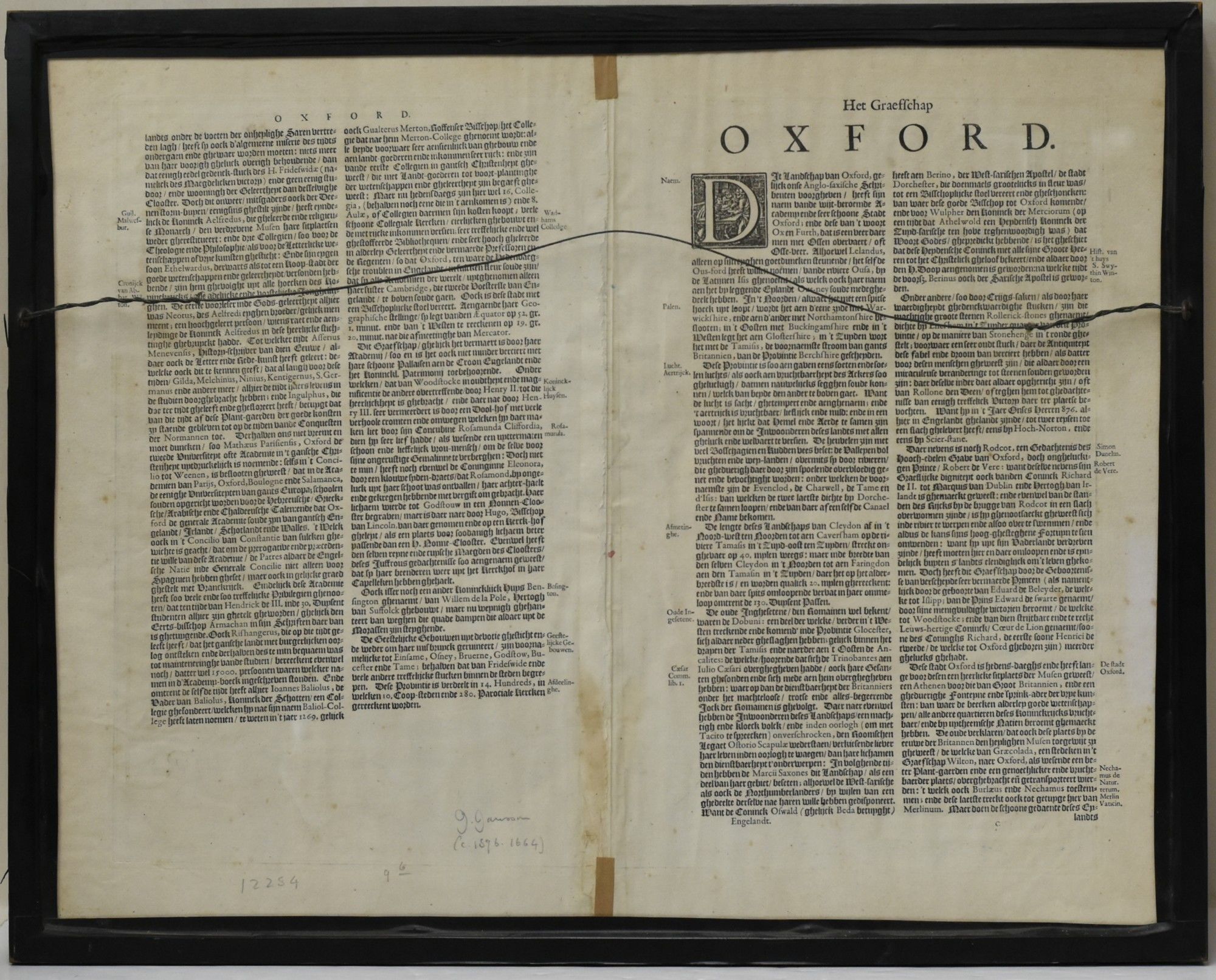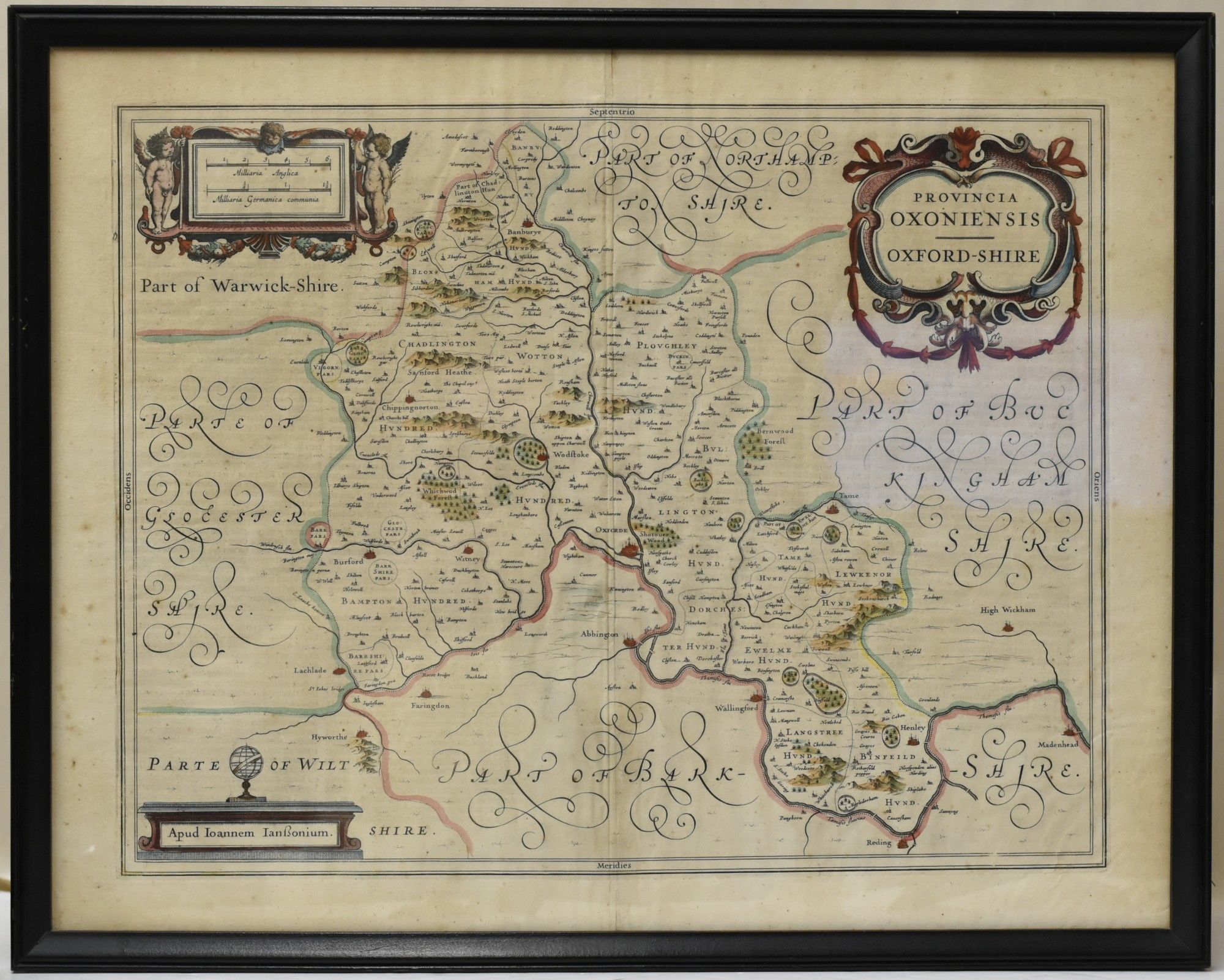 Amsterdam: Joannes Janssonius, 1644. Very Good binding. A map of Oxfordshire, with text from the atlas in Dutch and Fraktur on the verso. The map is hand-colored, with a bar scale in "Milliaria Anglica" and "Milliaria Germanica communia" in the upper left corner, decorated with garlands and cherubs; the title cartouche is in the upper right, decorated with ribbons and the face of a man placed obscurely at the bottom. Originally a two-page print from Janssonius' Nievwen Atlas... Vol. III., the plates were latter purchased first by Peter Schenk and Gerard Valk, then by John and Henry Overton. Jansson's original plates were later embellished by Schenk with longitudinal and latitudinal lines, as well as small town plans; Overton added roads to his printings. This early Jansson edition contains none of the later embellishments. Housed in a black wooden frame in Very Good condition. The map is 38 x 49 cm. Very Good binding.