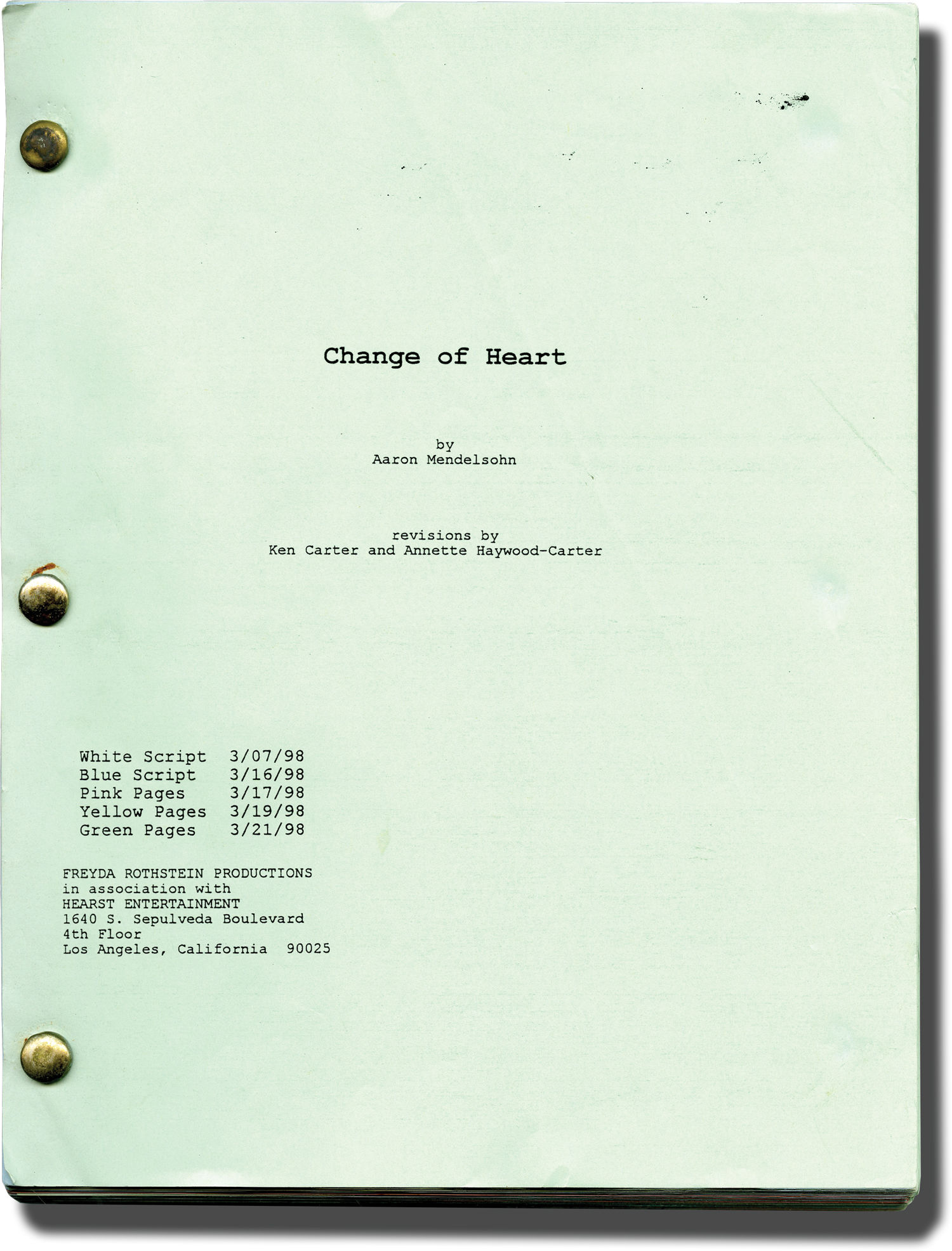 Green titled self-wrappers, dated 3/21/98, with credits for screen writers Aaron Mendelsohn, Ken Carter, and Annette Haywood-Carter. 124 leaves, with last page of text numbered 102. Xerographic duplication, with green, blue, and pink revision pages throughout, dated variously between 3/16/98 and 3/21/98. Pages Near Fine, wrapper Very Good plus, bound with three gold brads.