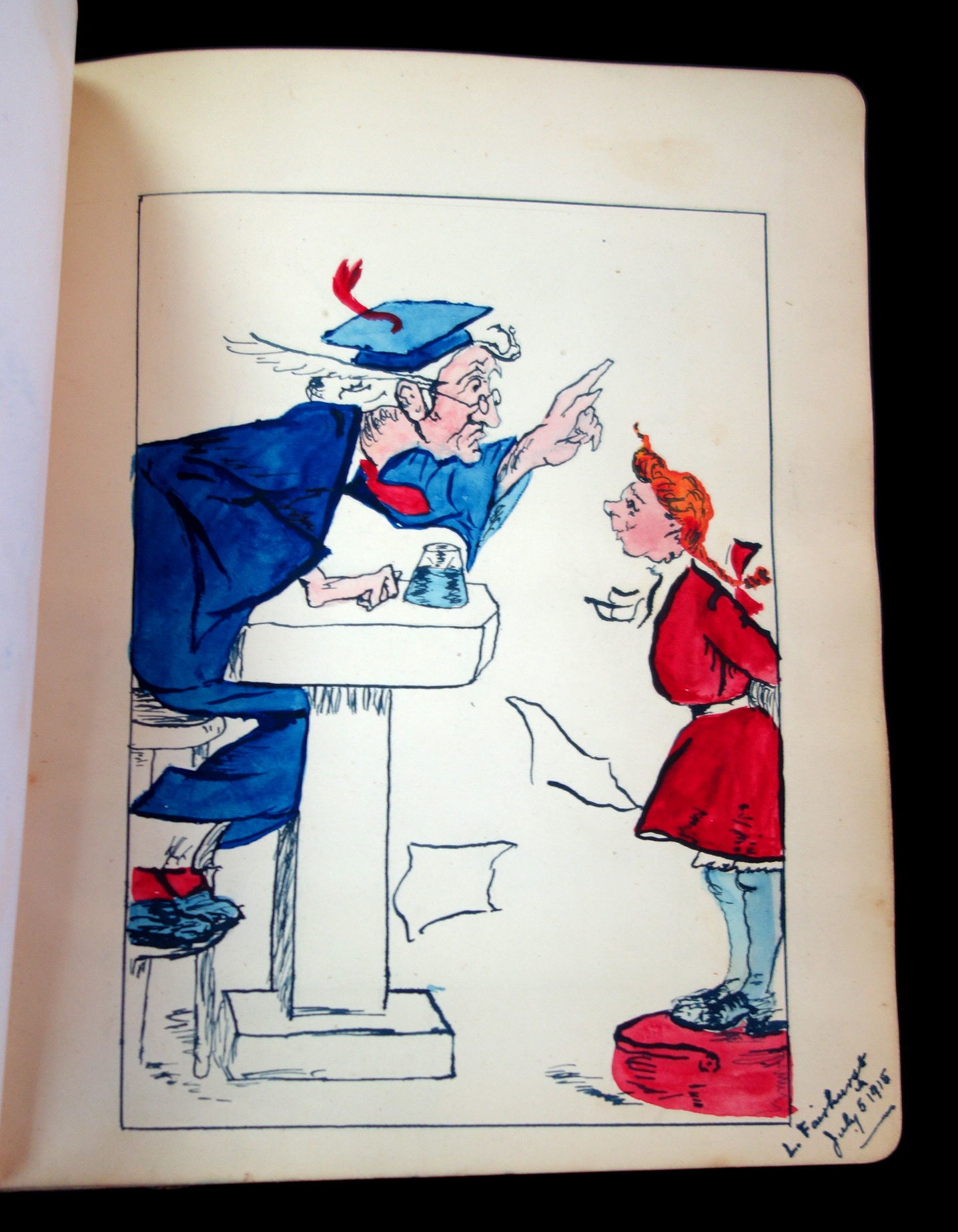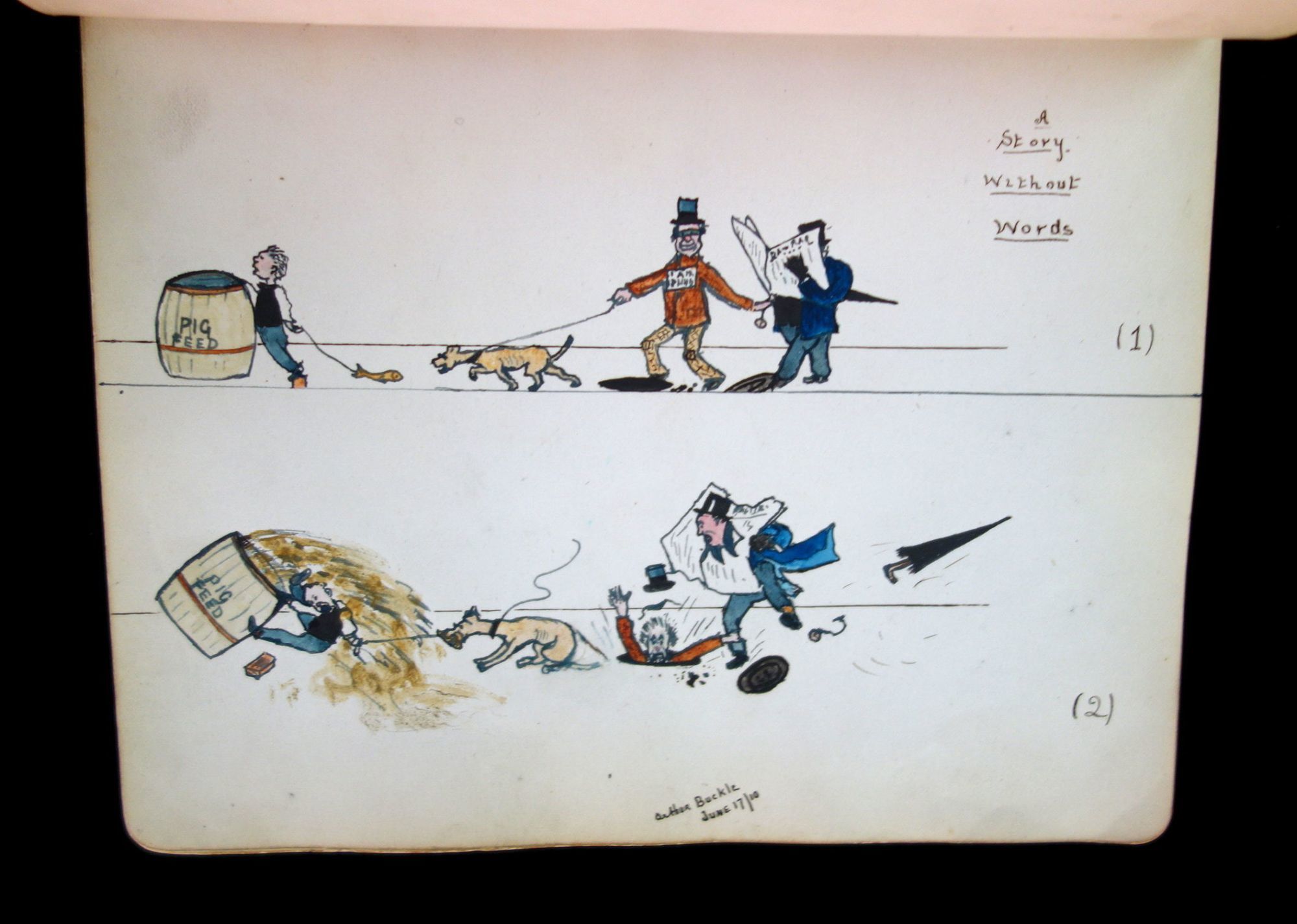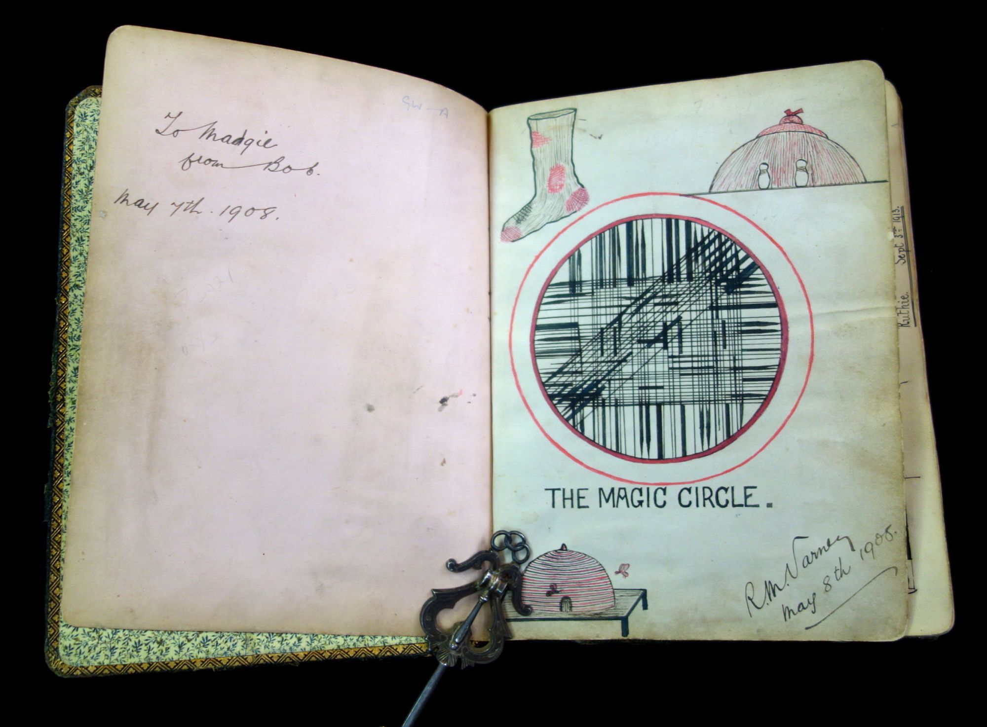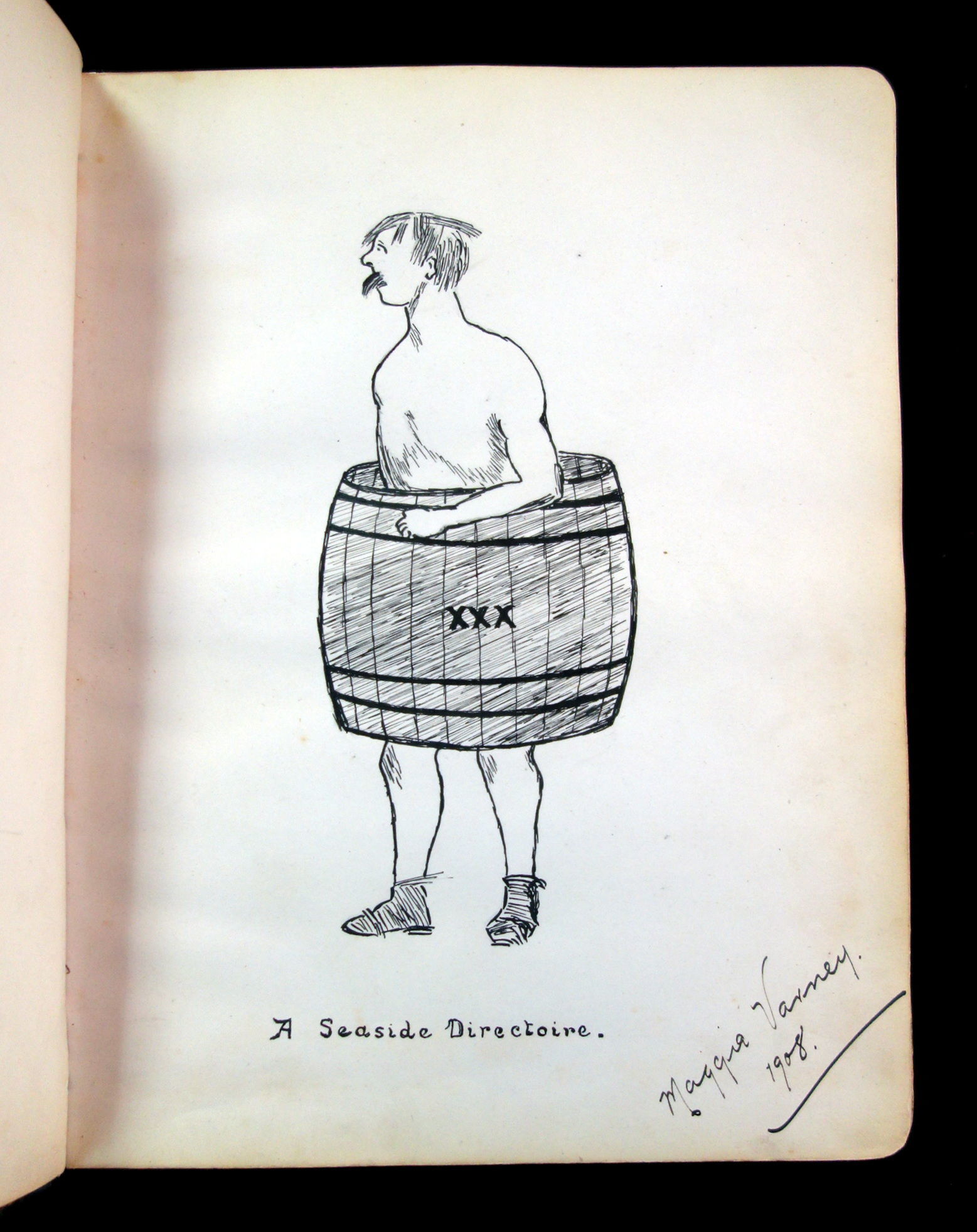 England, 1947. A humorous sketch book and friendship album owned by Madgie Varney, given to her by Bob (Robert) Varney in 1908. The album has over 65 original art work, with 3 photographs, and two music scores. Approximately 10 pieces are done either by Madgie or R M Varney. The majority of the pieces are humorous in tone, for example a drawing of two large leaves hanging on a clothes line with the caption, "First Washing Day". Some of the artwork has been pasted in, while others were drawn directly on the page. A variety of mediums were used, such as pencil, ink, and watercolor. The majority of the pieces were drawn between 1908-1910s, however there are some as late as the 1940s. There are two images from the Disney film, Snow White and the Seven Dwarfs. Measures 8 1/4" x 6 1/4"