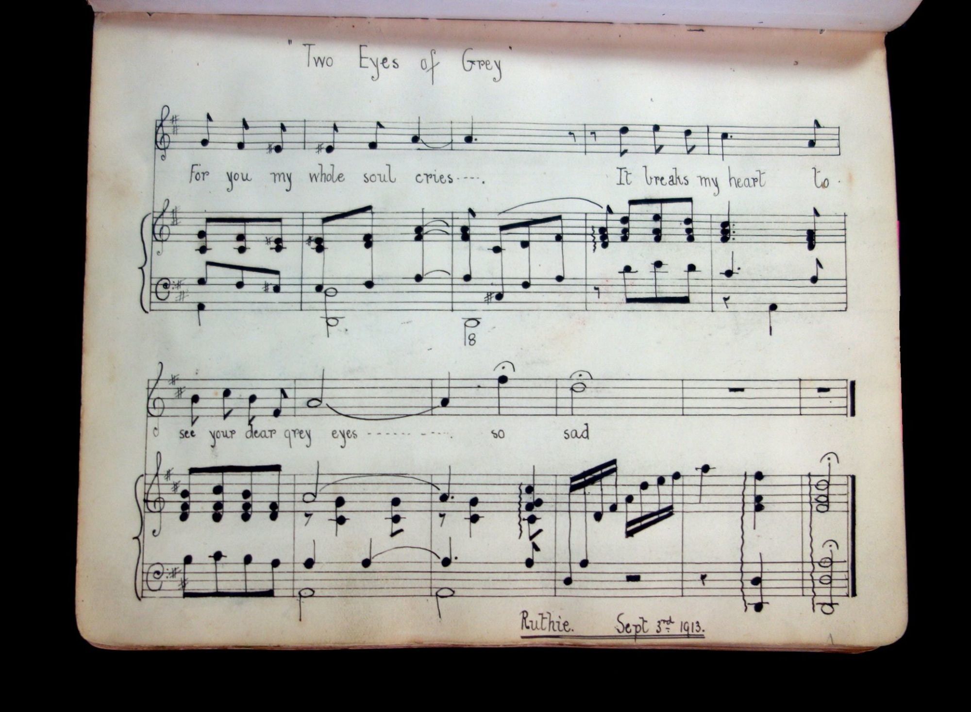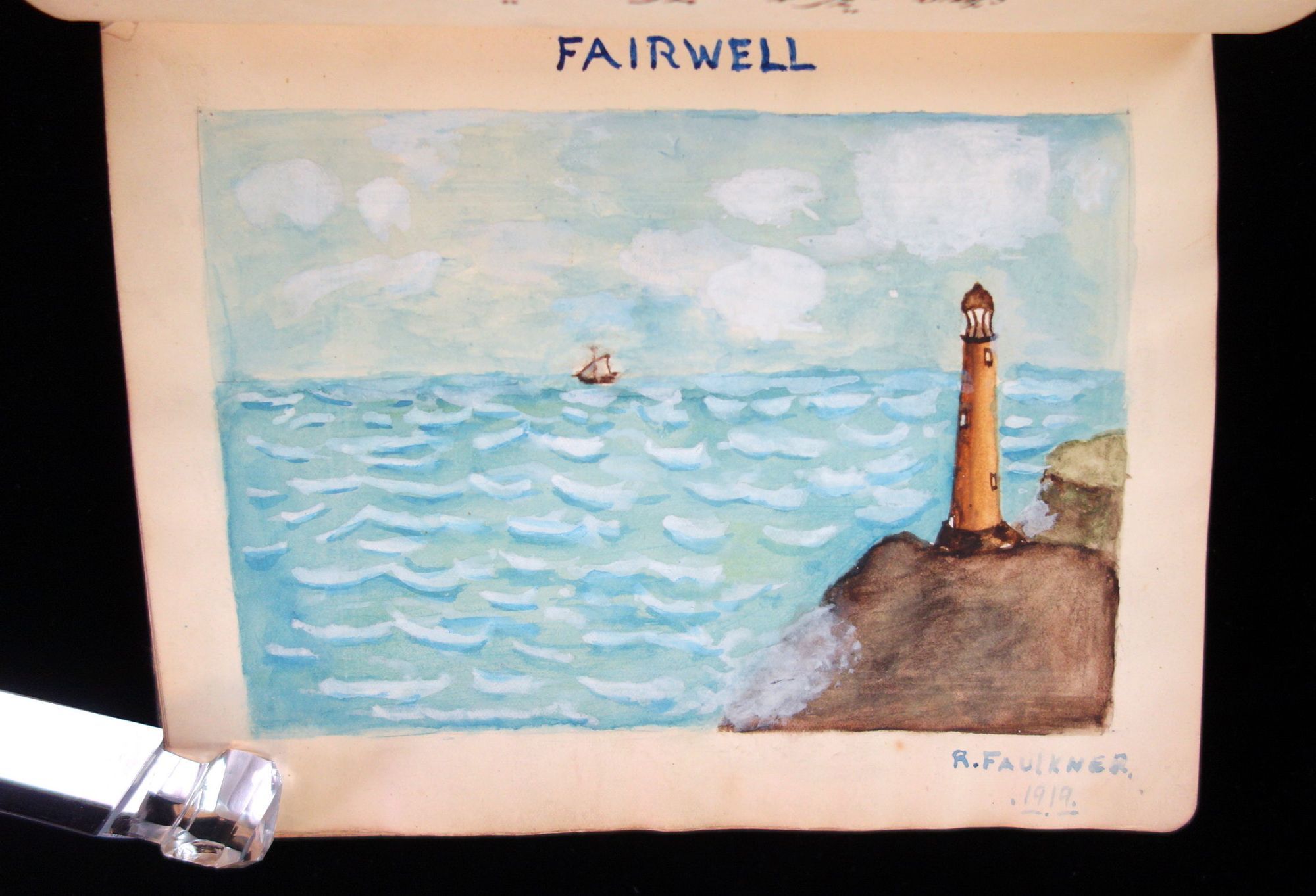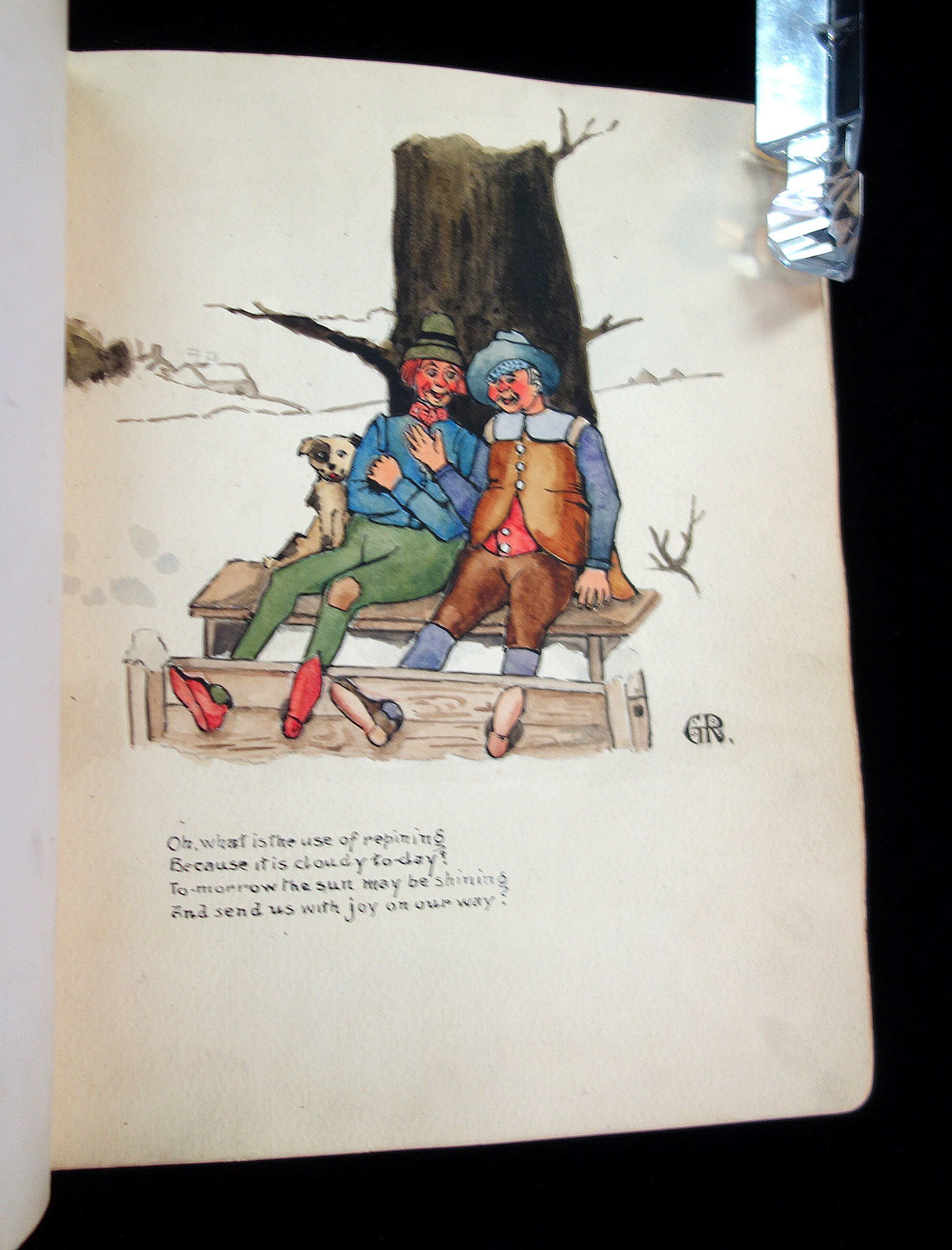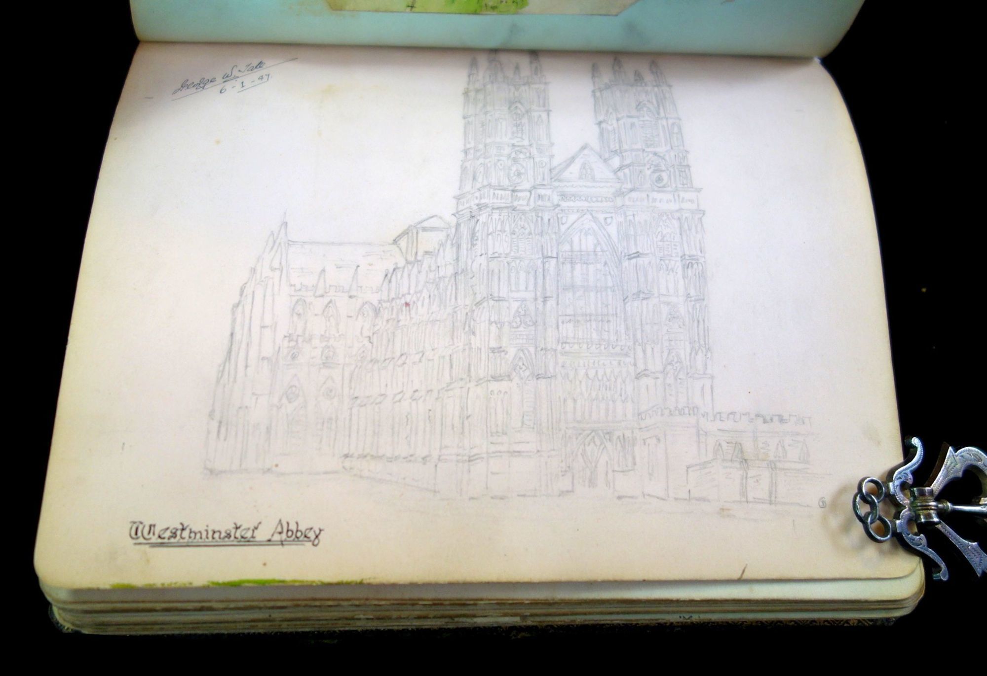 England, 1947. A humorous sketch book and friendship album owned by Madgie Varney, given to her by Bob (Robert) Varney in 1908. The album has over 65 original art work, with 3 photographs, and two music scores. Approximately 10 pieces are done either by Madgie or R M Varney. The majority of the pieces are humorous in tone, for example a drawing of two large leaves hanging on a clothes line with the caption, "First Washing Day". Some of the artwork has been pasted in, while others were drawn directly on the page. A variety of mediums were used, such as pencil, ink, and watercolor. The majority of the pieces were drawn between 1908-1910s, however there are some as late as the 1940s. There are two images from the Disney film, Snow White and the Seven Dwarfs. Measures 8 1/4" x 6 1/4"