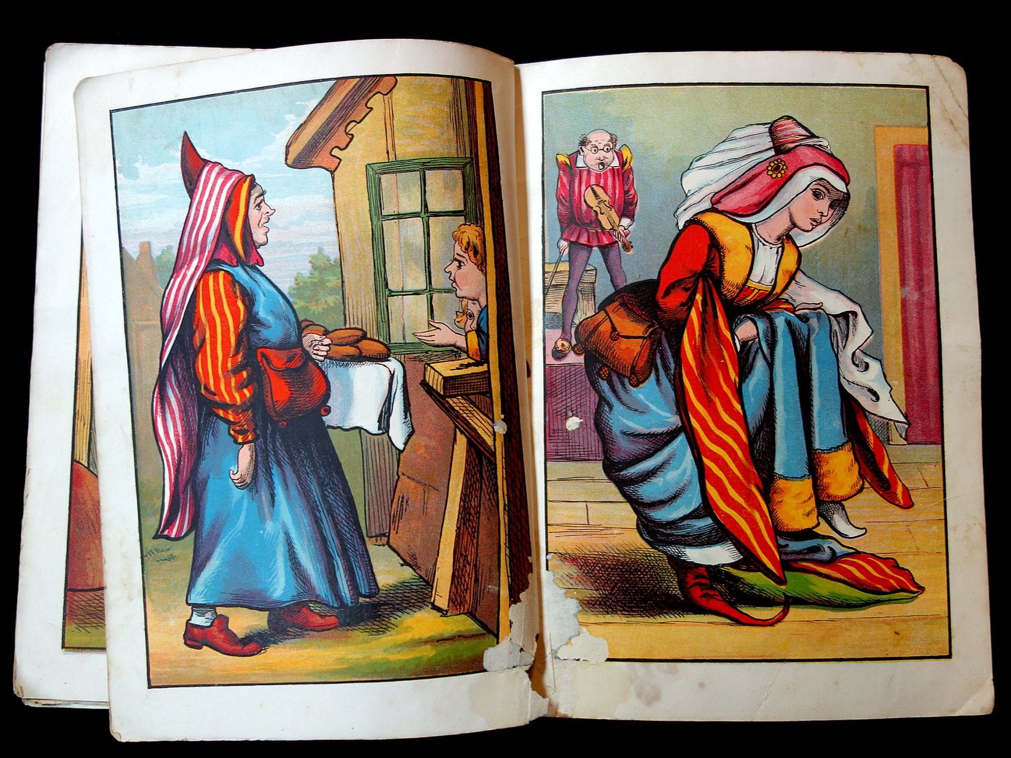 New York: McLoughlin Brothers, 1882. 16 pp (including covers) The book contains several nursery rhymes as well as corresponding imagery. Some of the rhymes included are Little Tom Tucker, Hot Cross Buns, and Peter White. Six full-page and one double color illustrations. Many of the illustrations are novelties (having several subjects in one picture). Dated through advertisements on back that were new items in the McLoughlin 1882 catalogue. A part of the Grandmother Goose Series. Measures 10 1/2" x 7 1/2" Covers partially detached. Moderate cover wear. Toning. Missing surface litho on bottom of some pages along backstrip due to the fact that they were stuck together (one still is). Inscription on front cover from previous owner. Toning and soiling due to age.