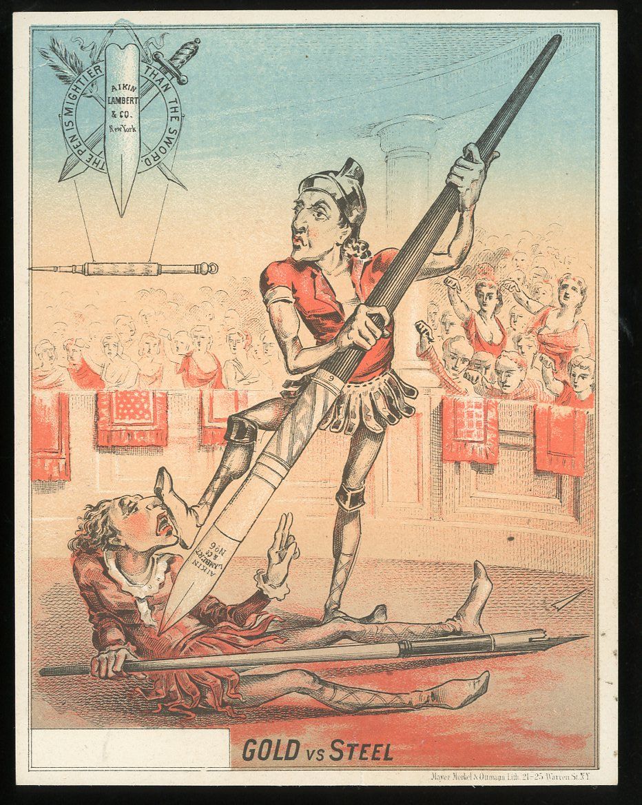 New York: Meyer, Merkel & Ottmann. A 5 5/8" x 4 3/8" proof for Aikin Lambert & Co. New York. Logo in upper left corner "Pen is Mightier than the Sword". Scene depicts gladiators in the Coliseum dueling with pens instead of sword. Layered color, almost appears as split-fountain. Gold vs. Steel at base Reverse is blank.