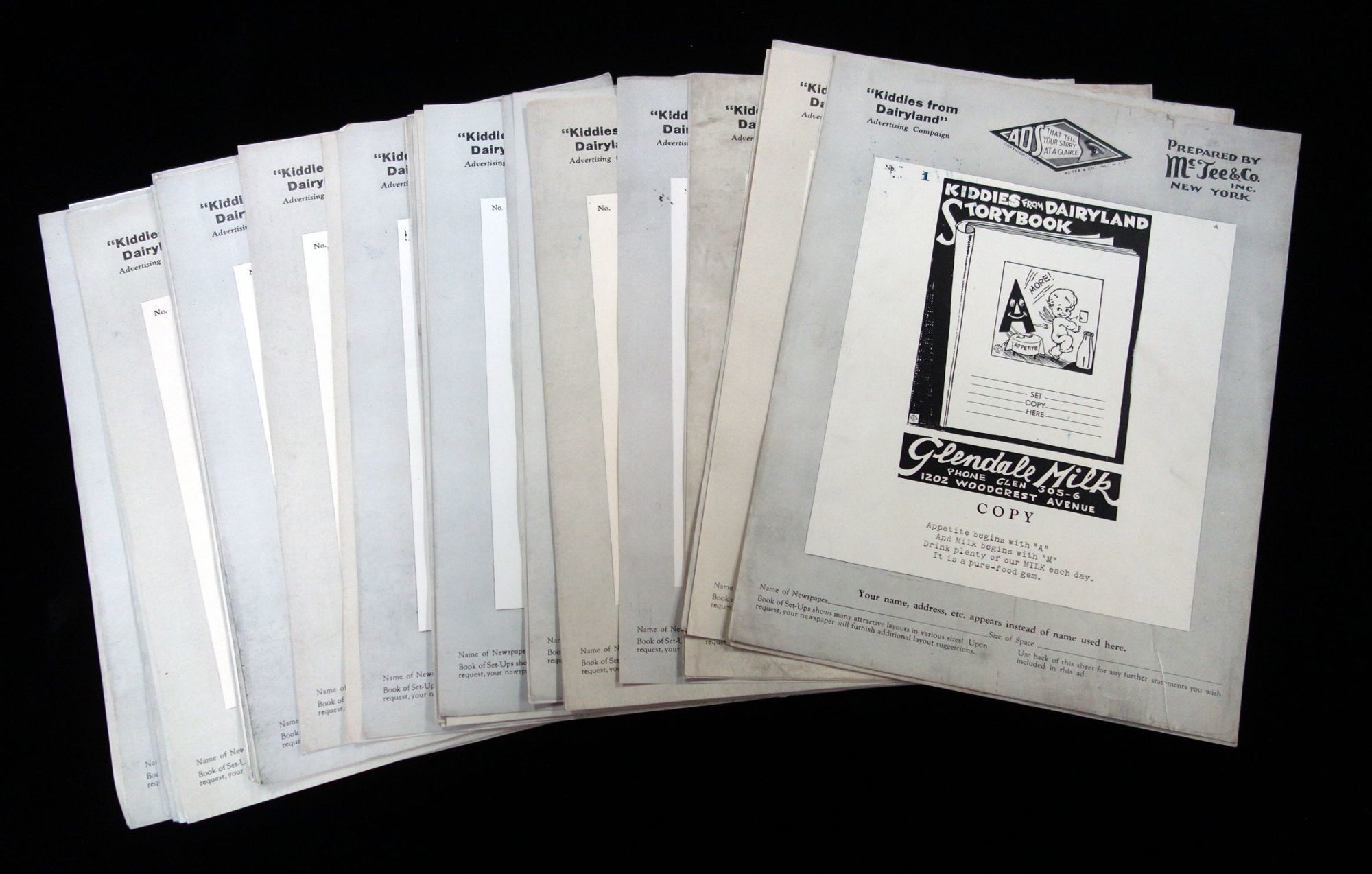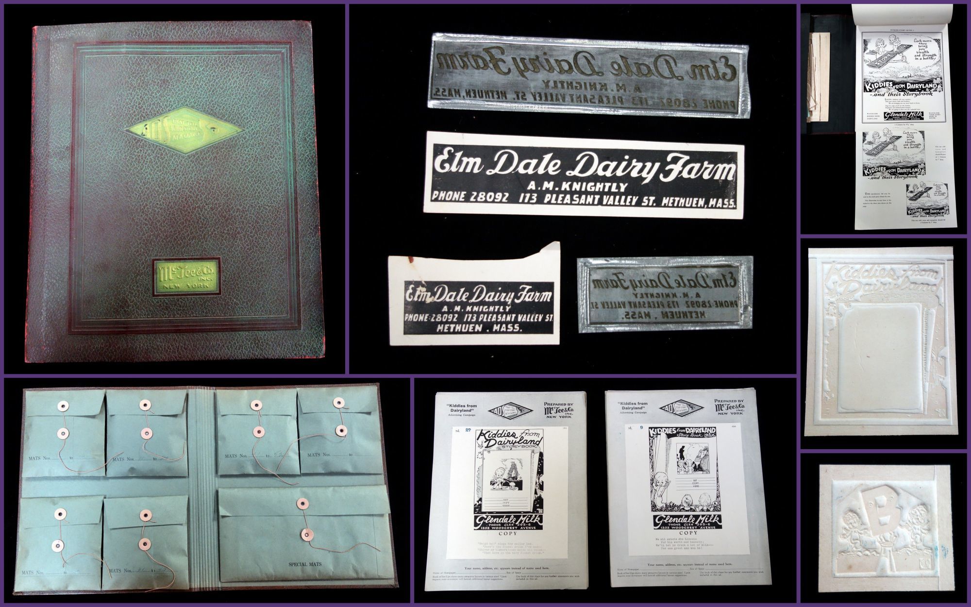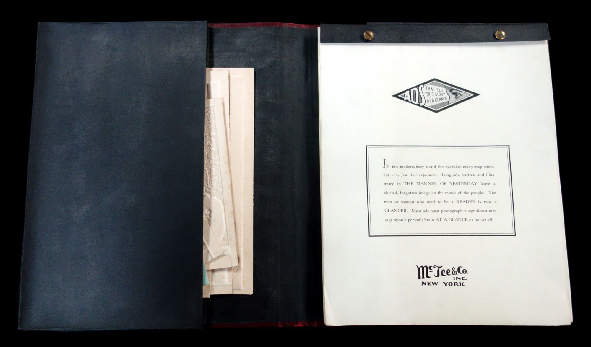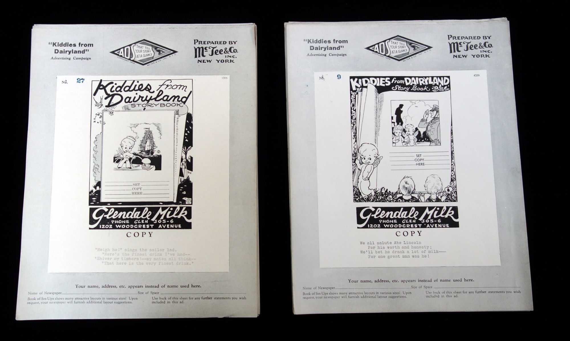 McTee & Company was New York based advertising firm run by John Bevans, a novelist poet and advertising man, who produced ads that both "that tell your story at a glance" and will "entertain and inform them, [to] keep your name before the public." The campaign was called "Kiddies in Dairyland" which was a storybook for Glendale Milk customers. This portfolio comes in two folders. The first contains a description of the ad campaign with fold-out pages, 52 pages of illustrations of the campaign with various details, letter from the Contact Department of Mc Tee & Company, a coupon book, and 6 blind embossing stock plates. The second portfolio contains seven pockets with a total of 62 blind embossing stock plates of various sizes (the majority are 2 1/2" x 2 1/2"), and two metal printing plates with their corresponding samples. Measures 12 1/2" x 11" (folders), 9 1/4" x 9 (largest blind embossing stock plate)
