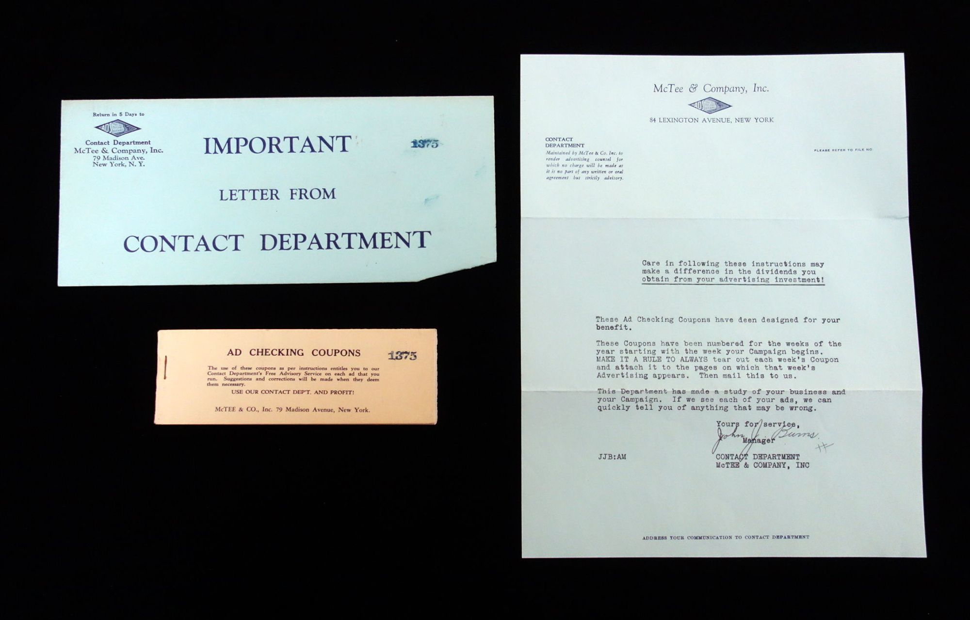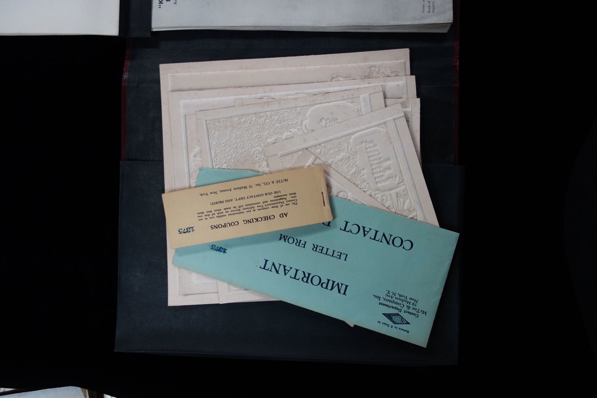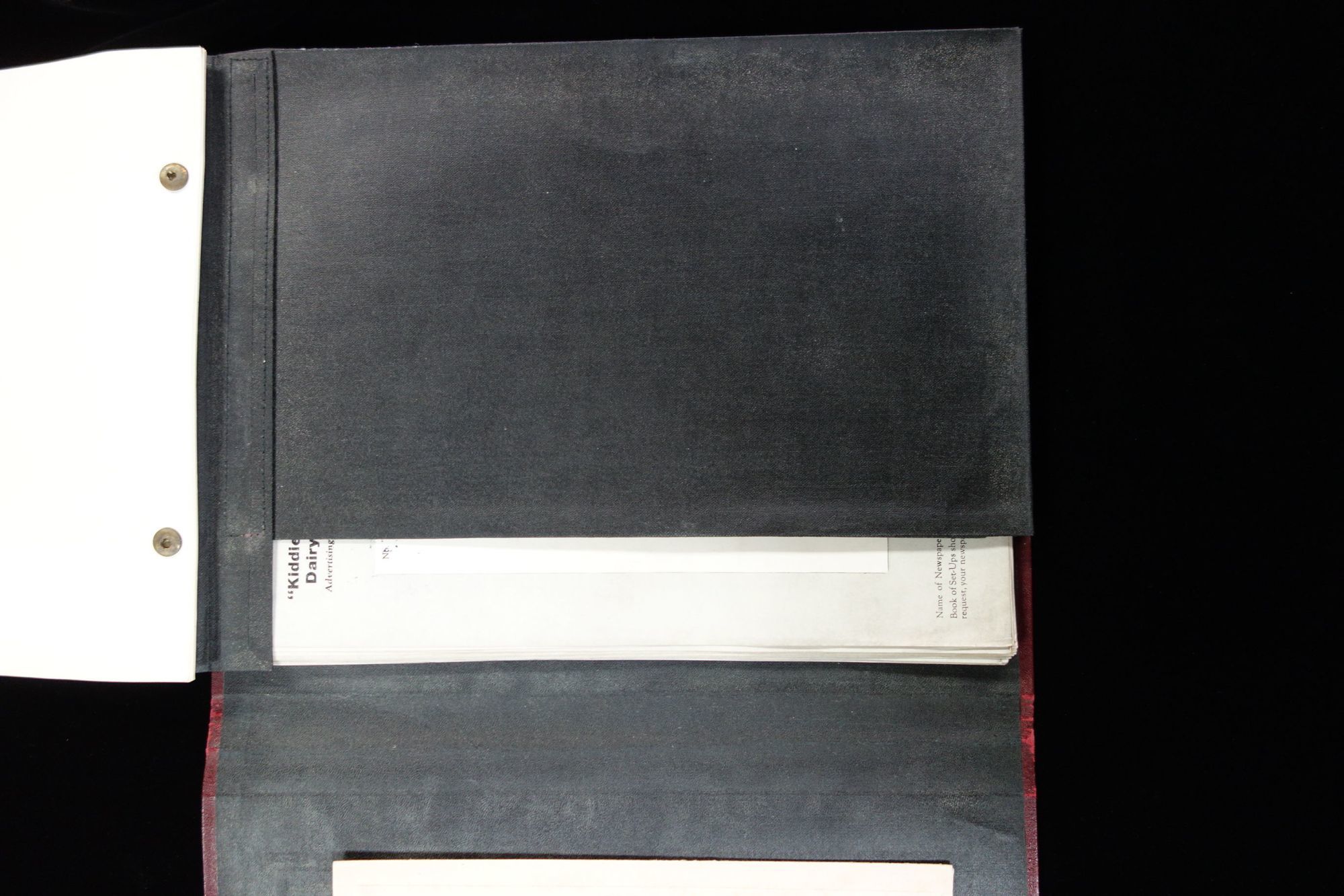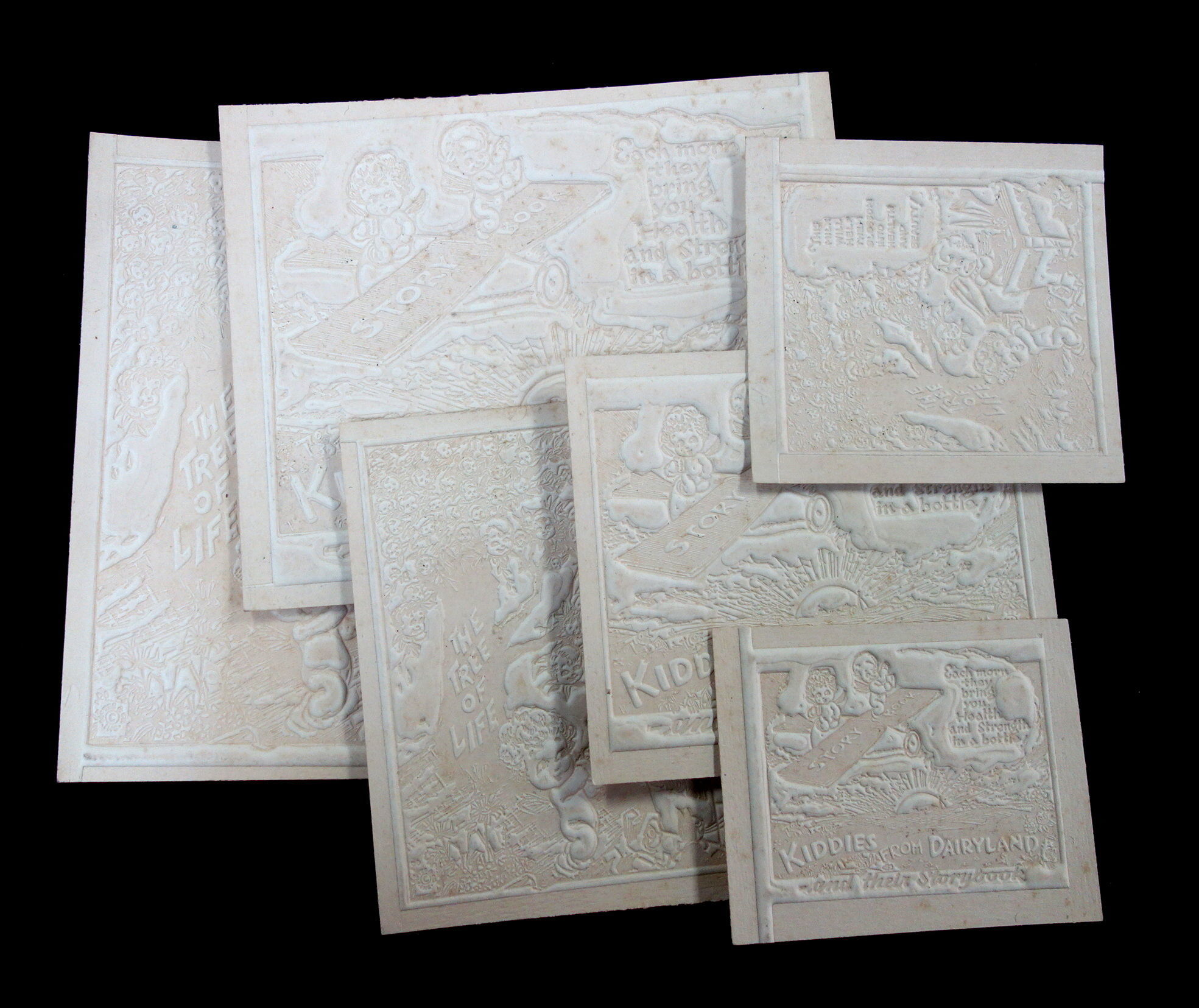 McTee & Company was New York based advertising firm run by John Bevans, a novelist poet and advertising man, who produced ads that both "that tell your story at a glance" and will "entertain and inform them, [to] keep your name before the public." The campaign was called "Kiddies in Dairyland" which was a storybook for Glendale Milk customers. This portfolio comes in two folders. The first contains a description of the ad campaign with fold-out pages, 52 pages of illustrations of the campaign with various details, letter from the Contact Department of Mc Tee & Company, a coupon book, and 6 blind embossing stock plates. The second portfolio contains seven pockets with a total of 62 blind embossing stock plates of various sizes (the majority are 2 1/2" x 2 1/2"), and two metal printing plates with their corresponding samples. Measures 12 1/2" x 11" (folders), 9 1/4" x 9 (largest blind embossing stock plate)