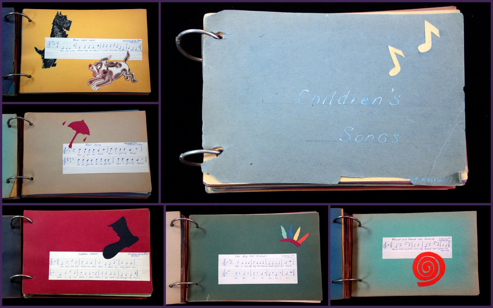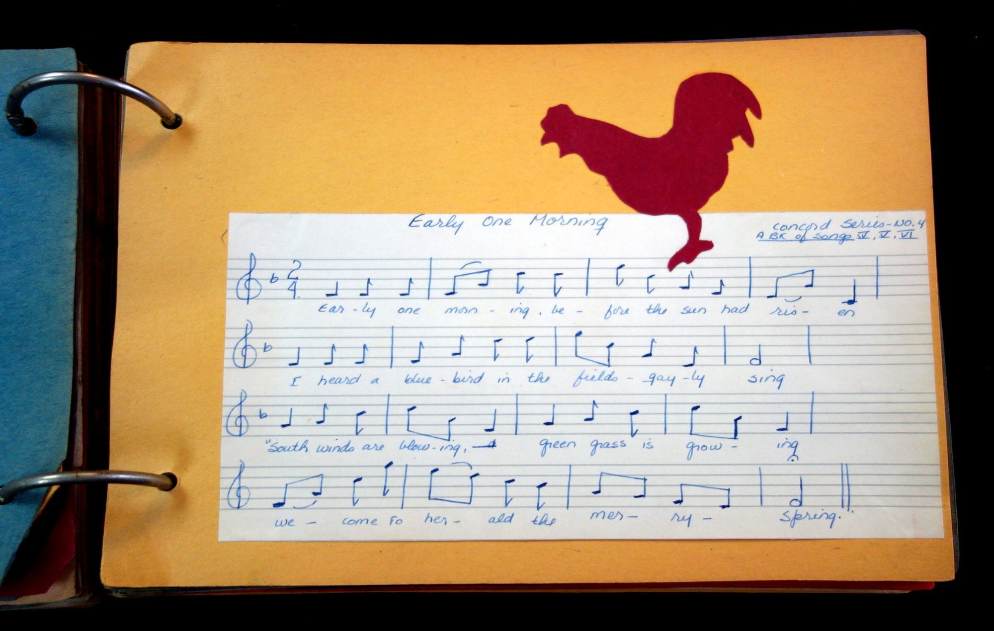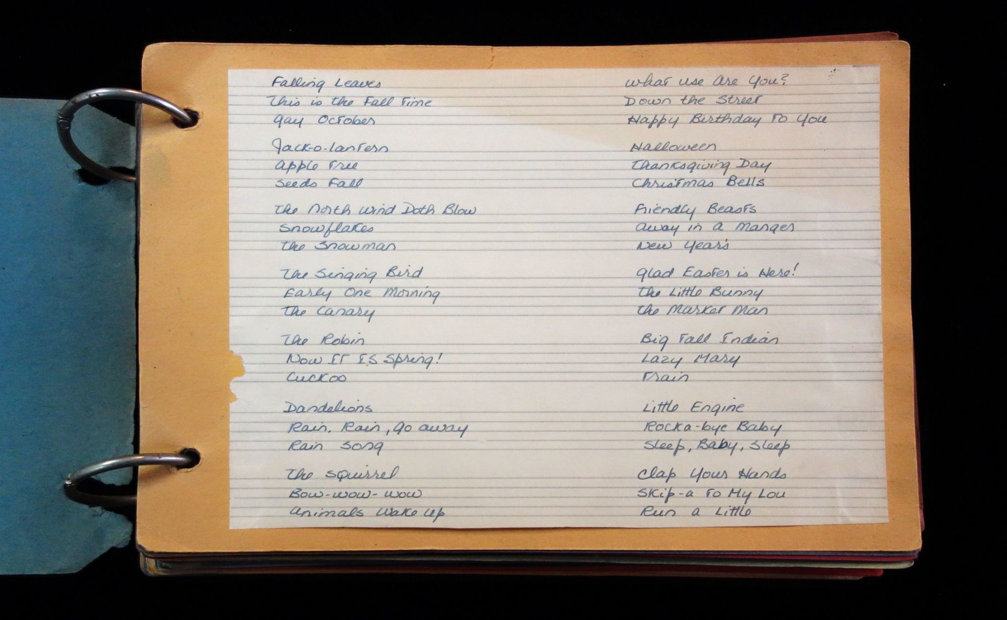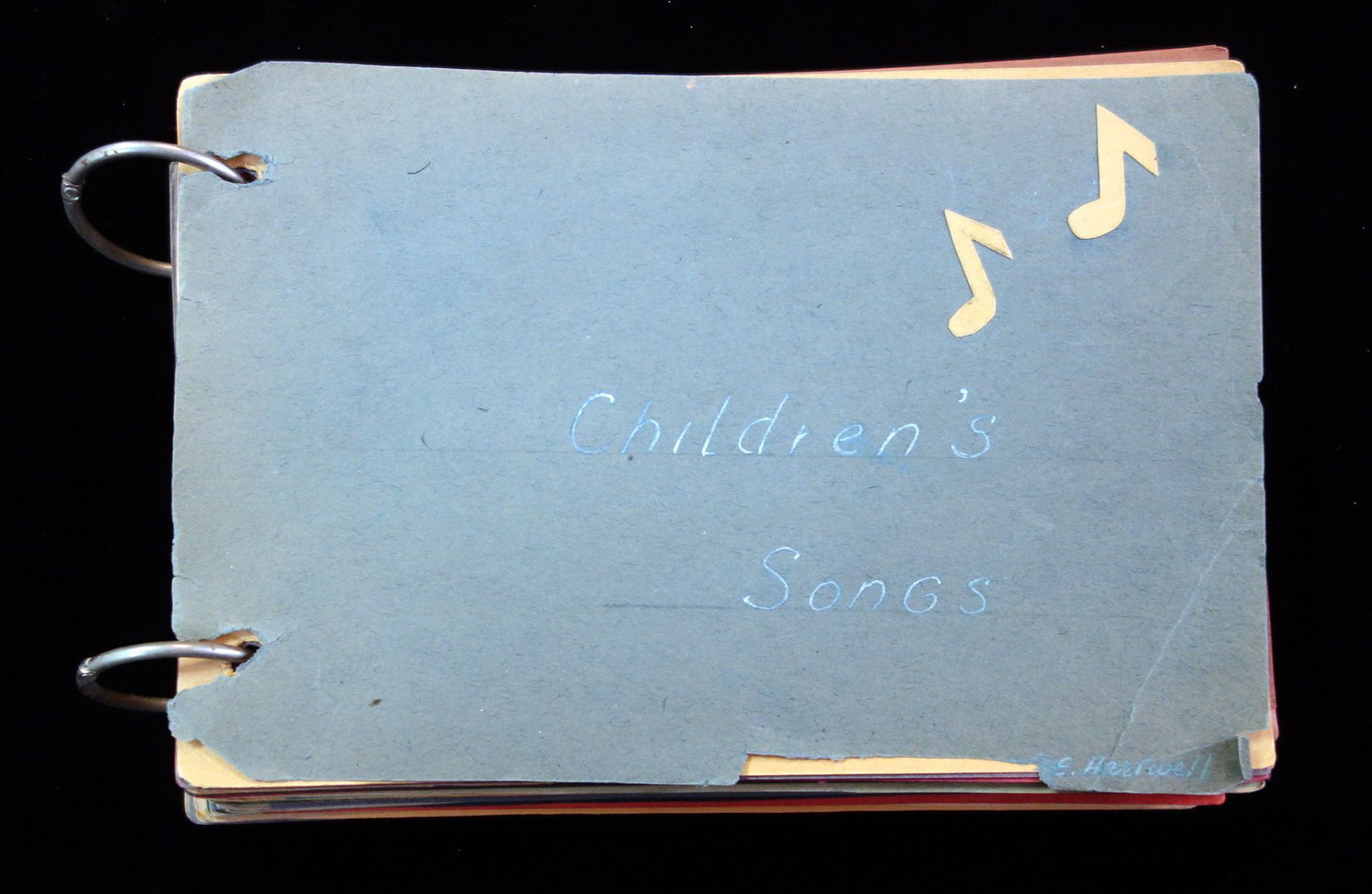 1940. A handmade song book with over 50 songs. The book has been divided up into seven categories: Traditional, Autumn, Winter, Spring, Animals, Special Occasions, People, and Games . The majority of the songs in this book are short nursery songs, such as 'Twinkle, Twinkle, Little Star', 'Rock-a-bye Baby', and 'Rain, Rain, Go Away'. The book is made from construction paper which each page a different color. Pasted onto the page is the handwritten song, with the music and lyrics. Additionally, on the top right, the author has written the origin of the song. Adding even more charm to this book, relevant pictures or cutouts are added to each page. For example, a cut out of an umbrella on the page with the 'Rain Song' or an image of a church's steeple on the page for 'Glad Easter is Here'. At the front of the book is a page that lists all the songs found within. The book is bound together with two metal rings. Measures 9" x 6".