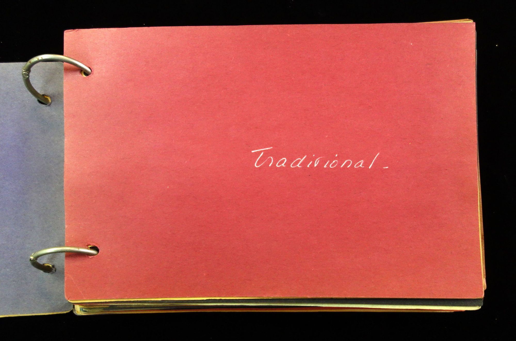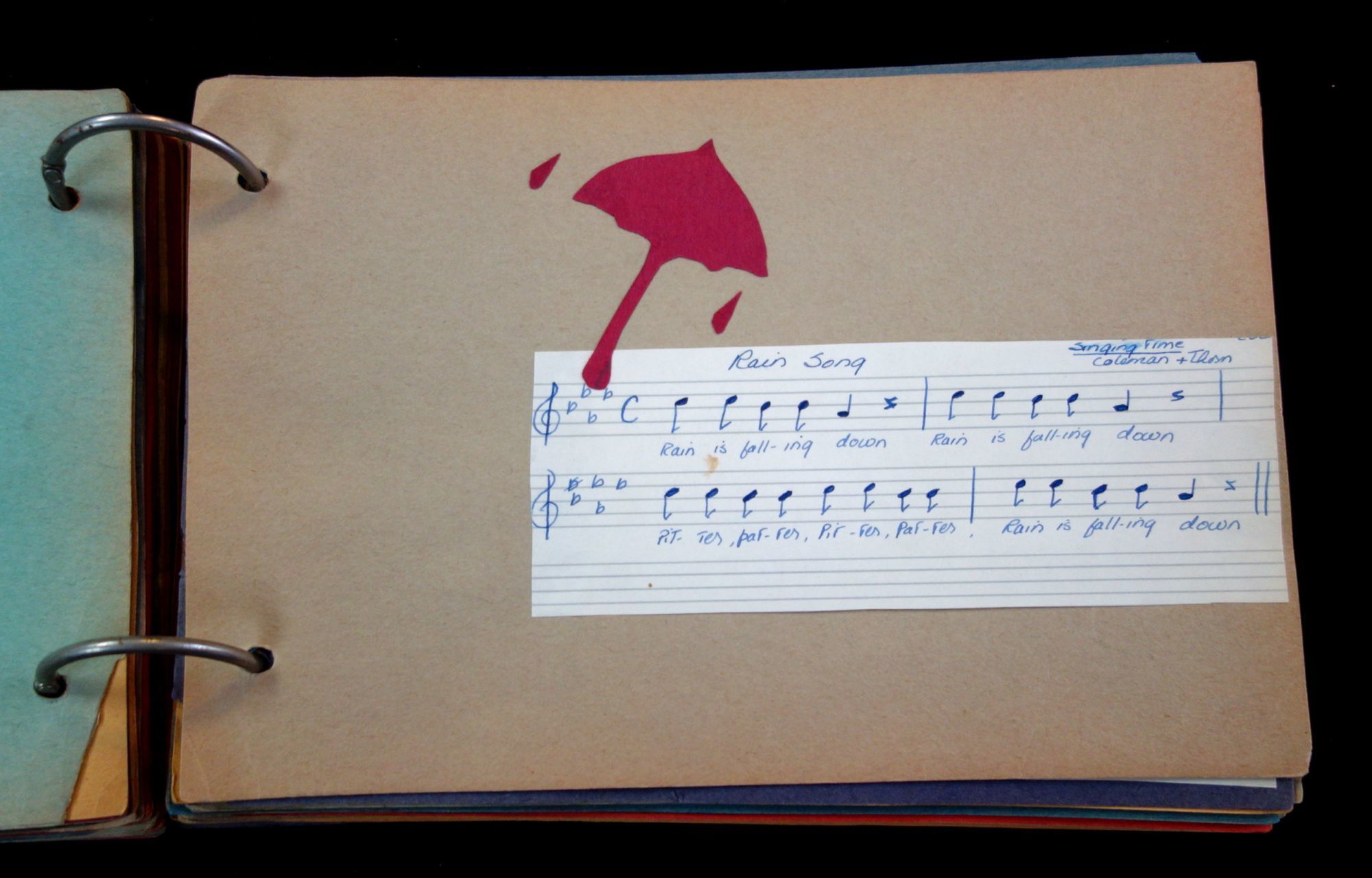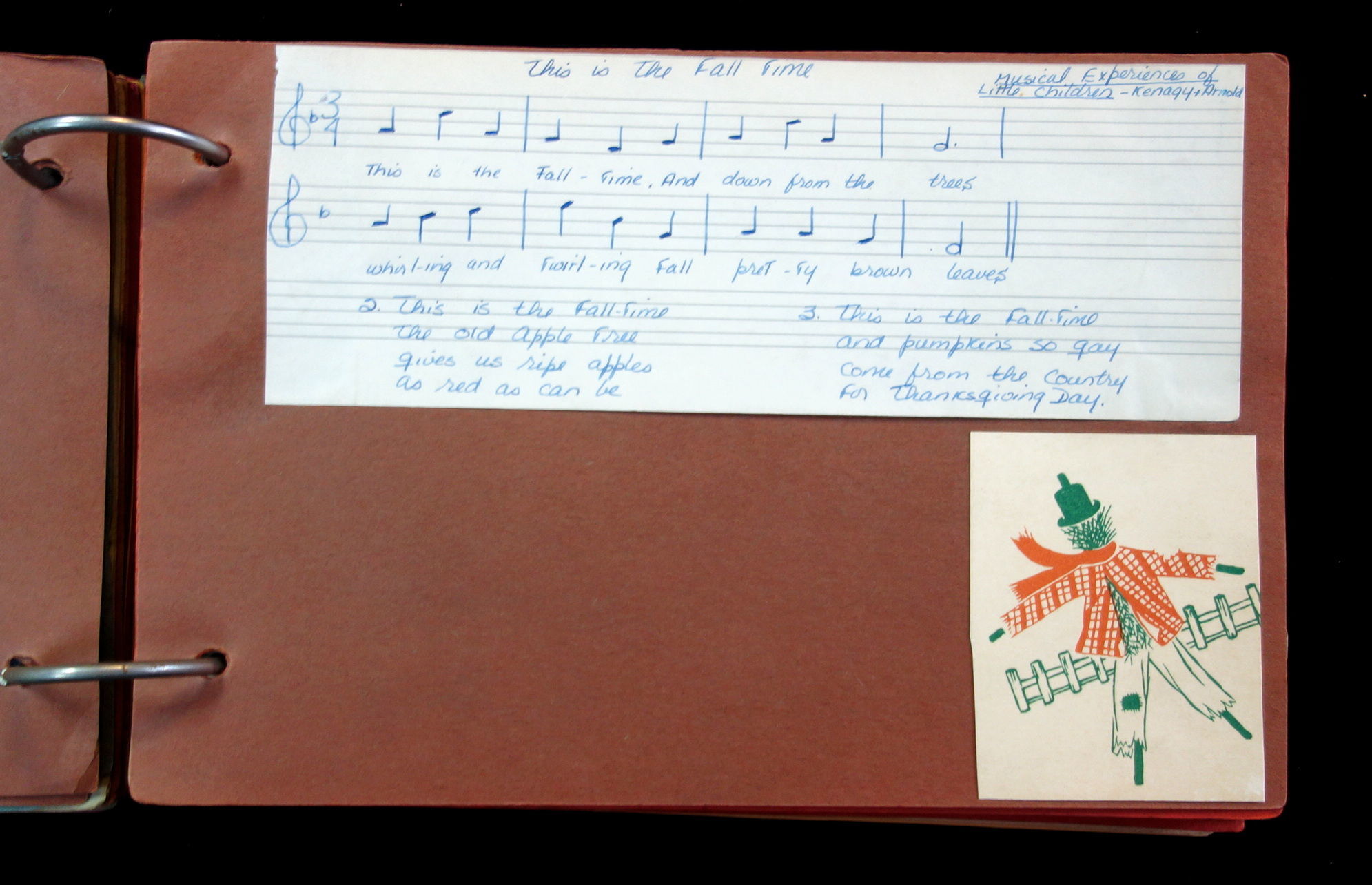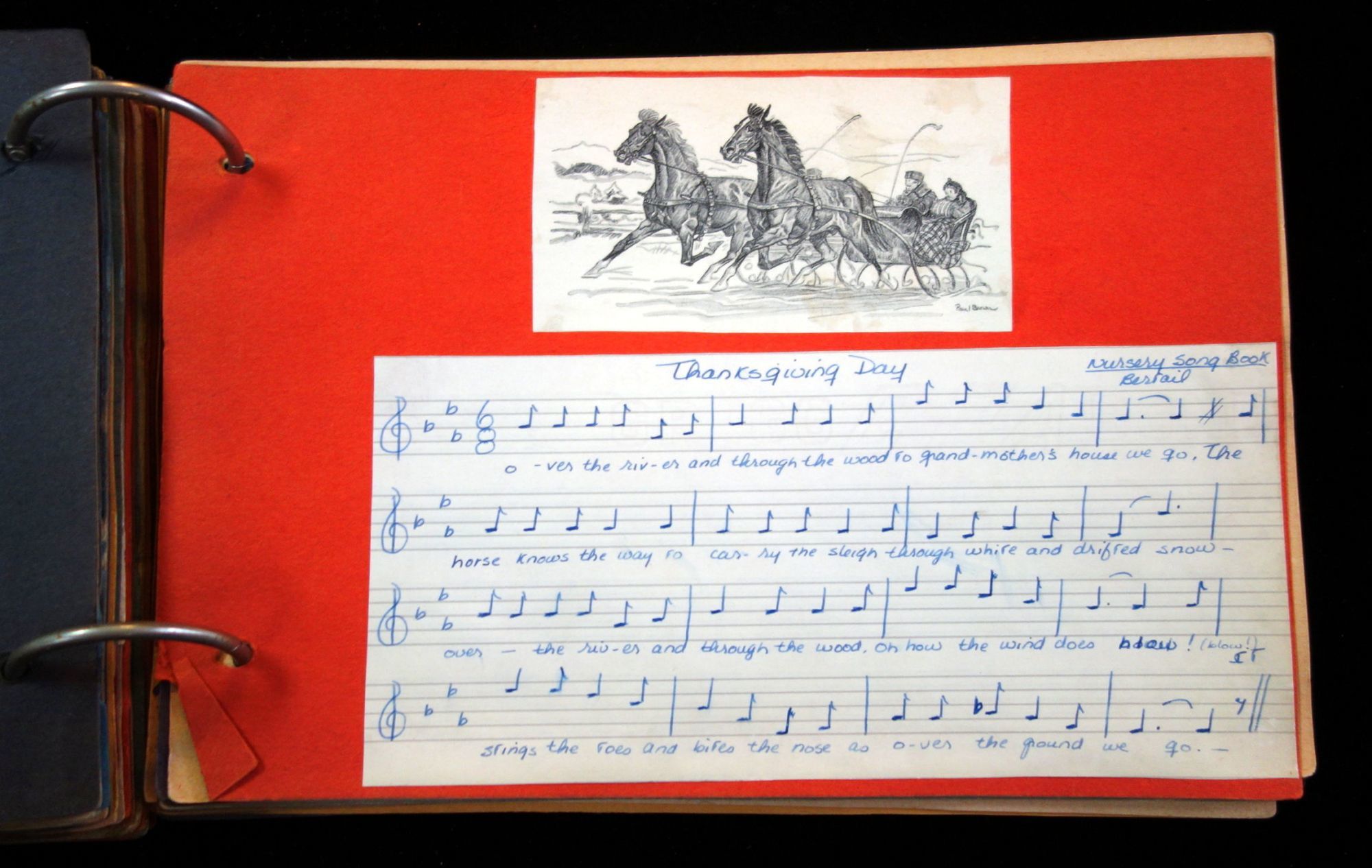 1940. A handmade song book with over 50 songs. The book has been divided up into seven categories: Traditional, Autumn, Winter, Spring, Animals, Special Occasions, People, and Games . The majority of the songs in this book are short nursery songs, such as 'Twinkle, Twinkle, Little Star', 'Rock-a-bye Baby', and 'Rain, Rain, Go Away'. The book is made from construction paper which each page a different color. Pasted onto the page is the handwritten song, with the music and lyrics. Additionally, on the top right, the author has written the origin of the song. Adding even more charm to this book, relevant pictures or cutouts are added to each page. For example, a cut out of an umbrella on the page with the 'Rain Song' or an image of a church's steeple on the page for 'Glad Easter is Here'. At the front of the book is a page that lists all the songs found within. The book is bound together with two metal rings. Measures 9" x 6".