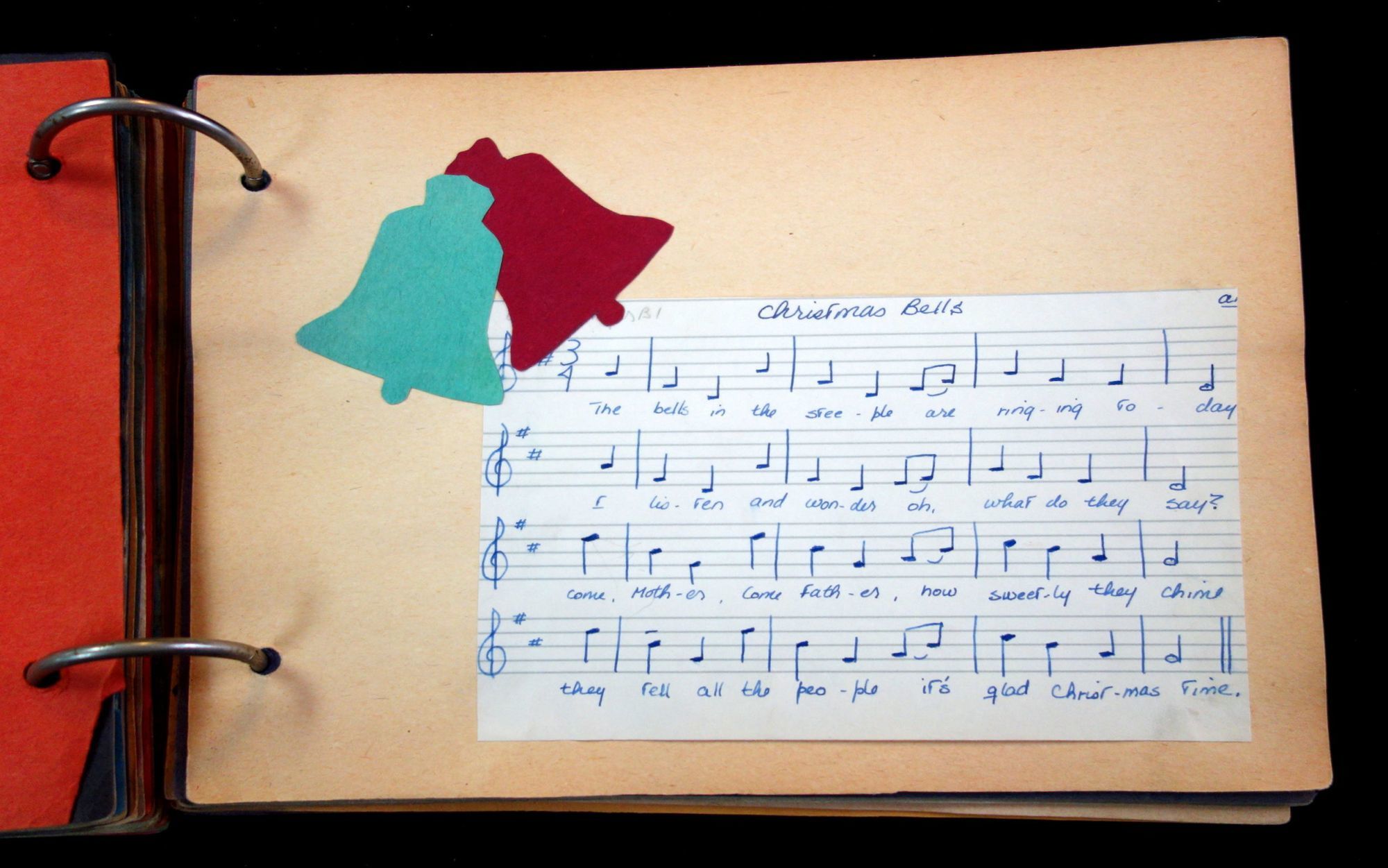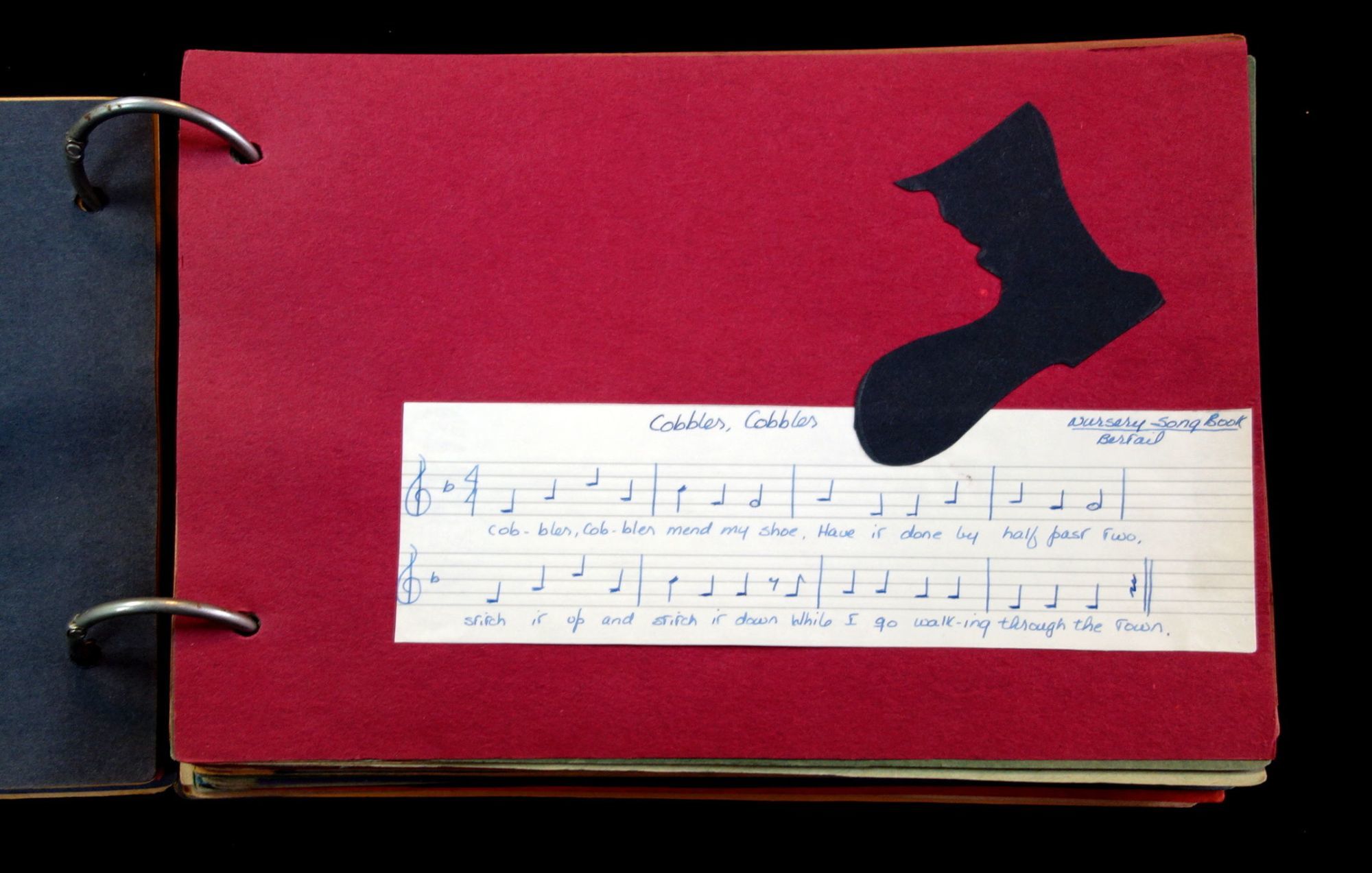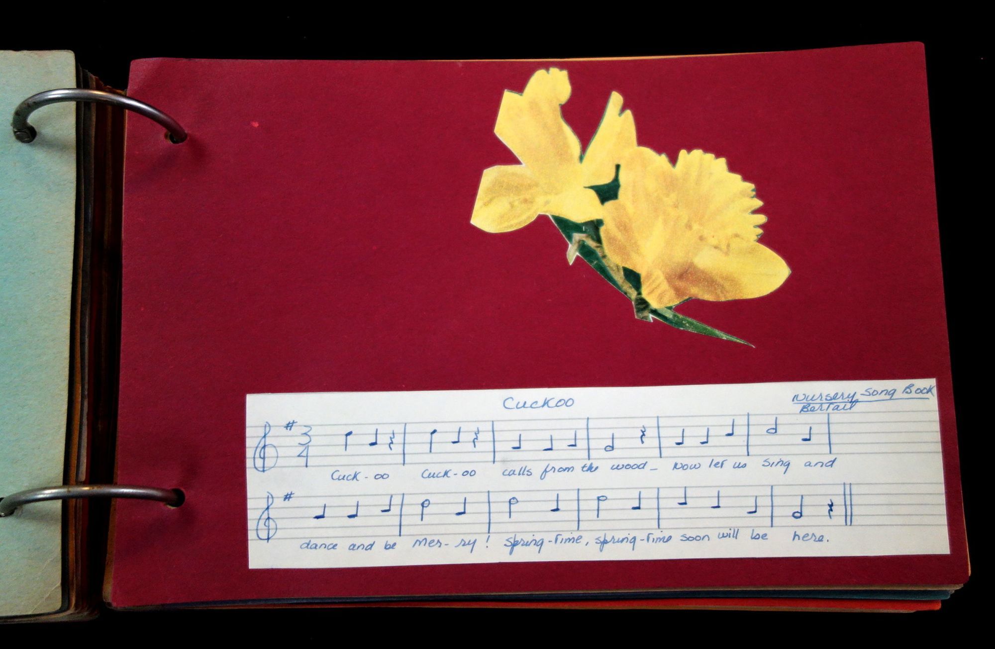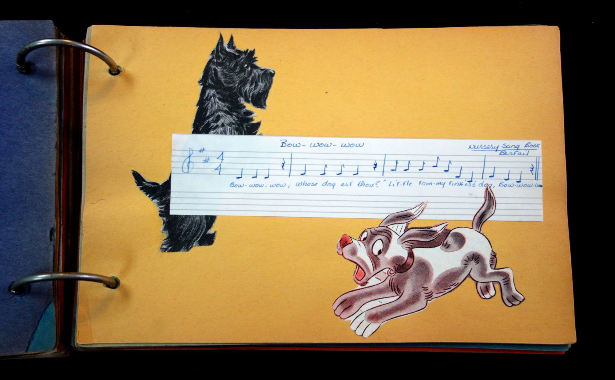 1940. A handmade song book with over 50 songs. The book has been divided up into seven categories: Traditional, Autumn, Winter, Spring, Animals, Special Occasions, People, and Games . The majority of the songs in this book are short nursery songs, such as 'Twinkle, Twinkle, Little Star', 'Rock-a-bye Baby', and 'Rain, Rain, Go Away'. The book is made from construction paper which each page a different color. Pasted onto the page is the handwritten song, with the music and lyrics. Additionally, on the top right, the author has written the origin of the song. Adding even more charm to this book, relevant pictures or cutouts are added to each page. For example, a cut out of an umbrella on the page with the 'Rain Song' or an image of a church's steeple on the page for 'Glad Easter is Here'. At the front of the book is a page that lists all the songs found within. The book is bound together with two metal rings. Measures 9" x 6".