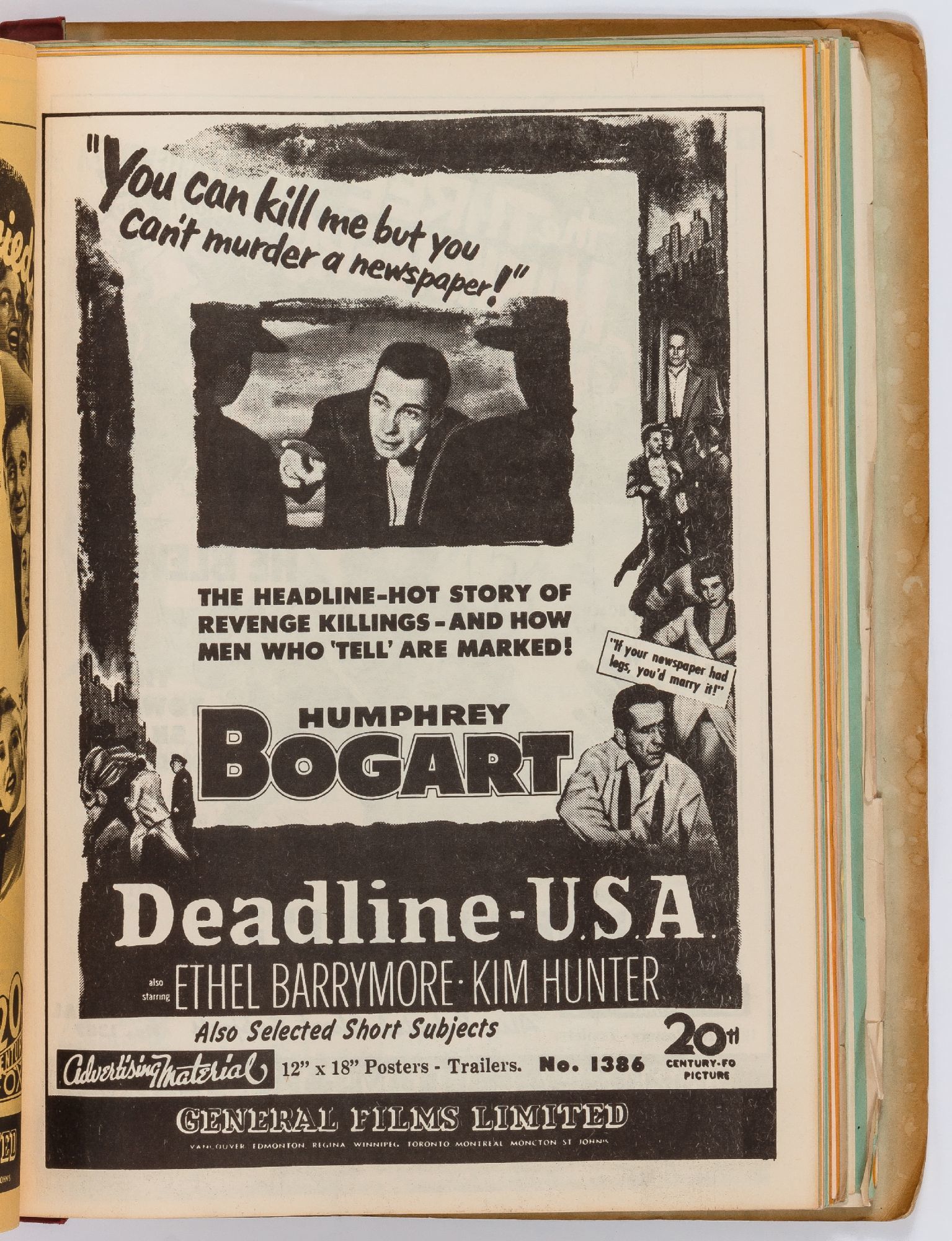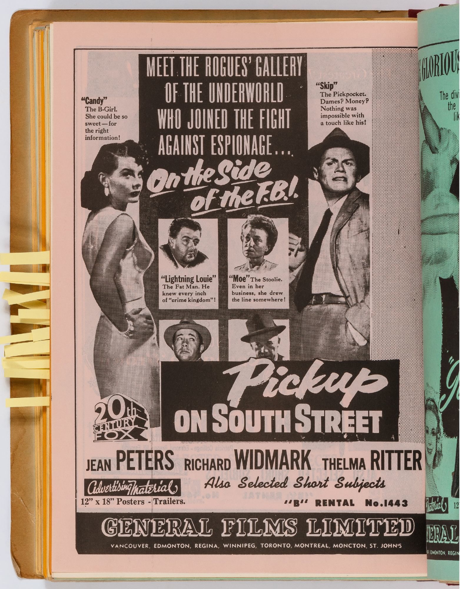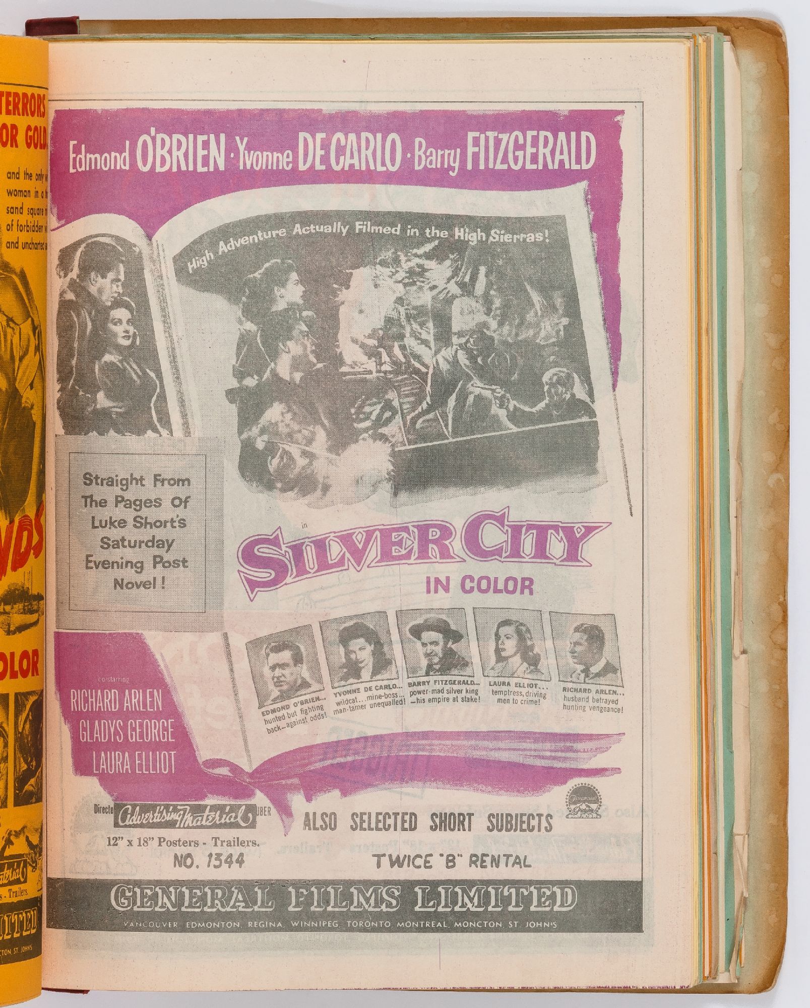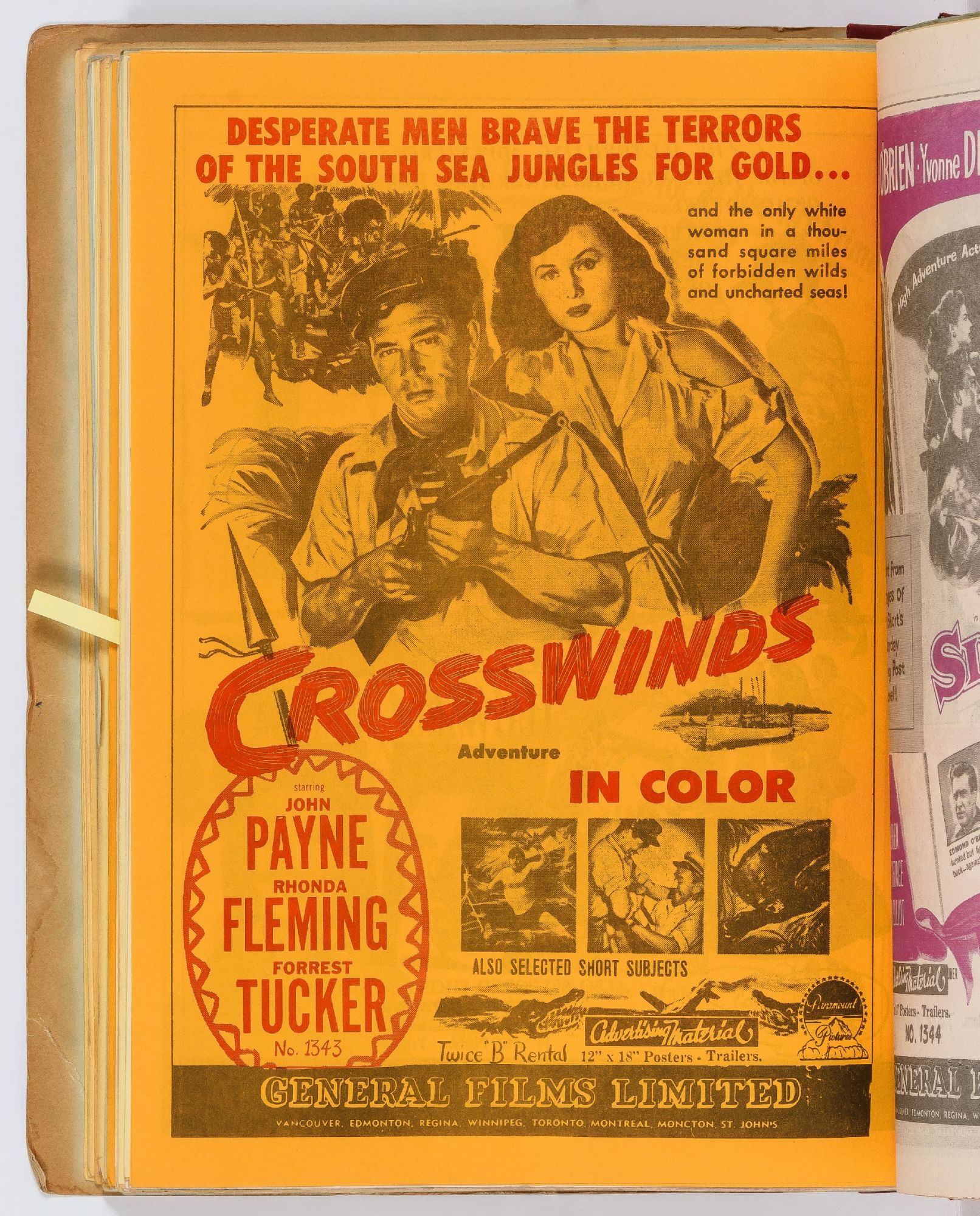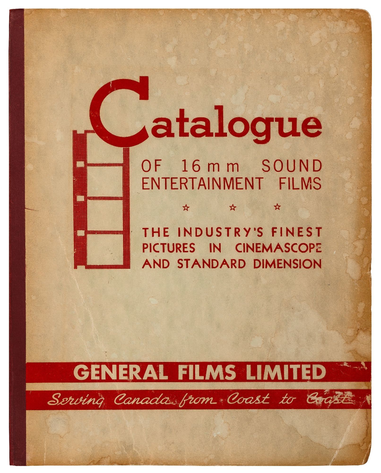 Toronto: General Films Limited, 1954. Softcover. Very Good. Quarter. Prong bound quarter canvas and printed oak tag wrappers. [8]pp. of Legion of Decency ratings, followed by [548]pp. (274 leaves printed both sides) of flyers or advertisements for individual films. A few stains on the wrappers, very good; internally one page is detached, trimmed, and written on, else fine.