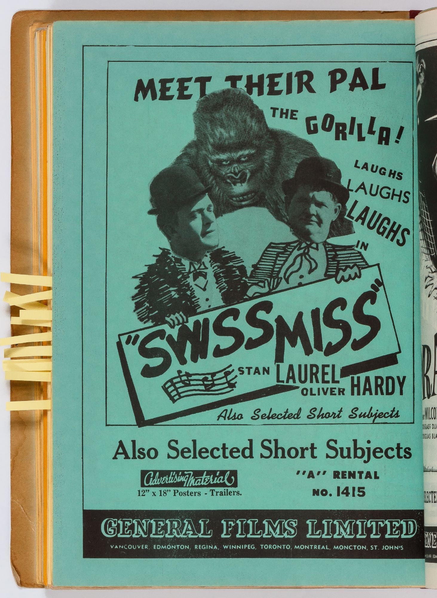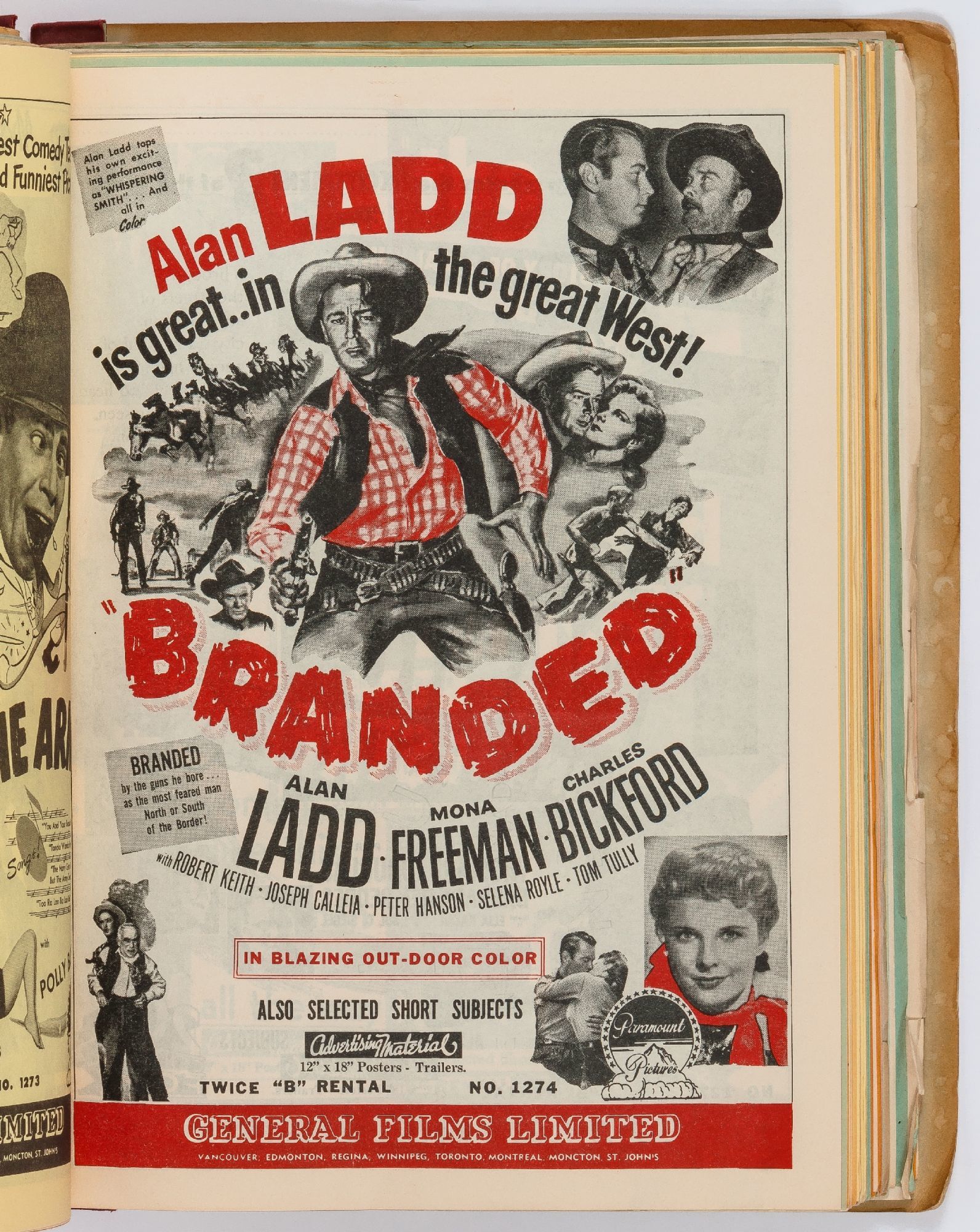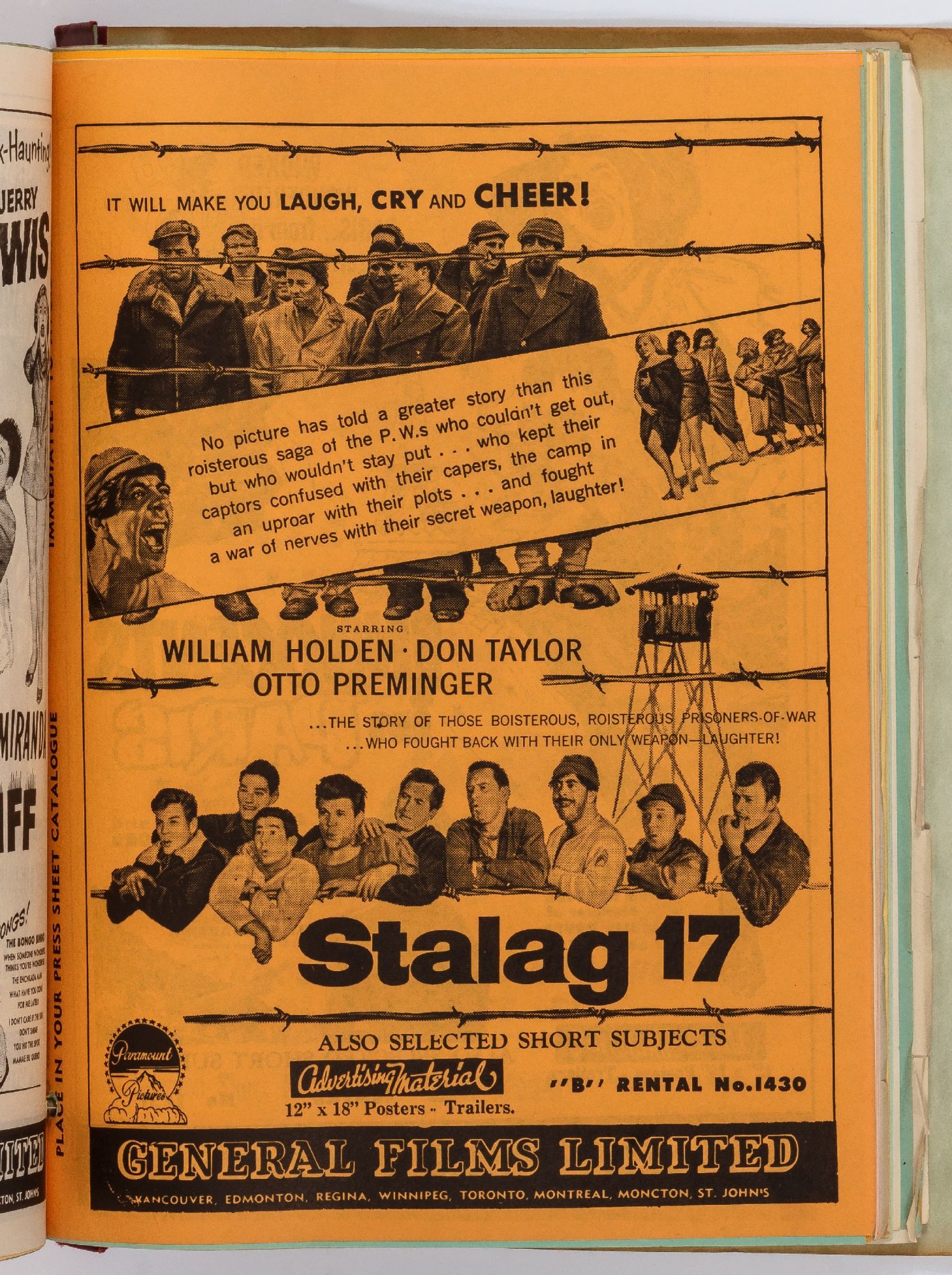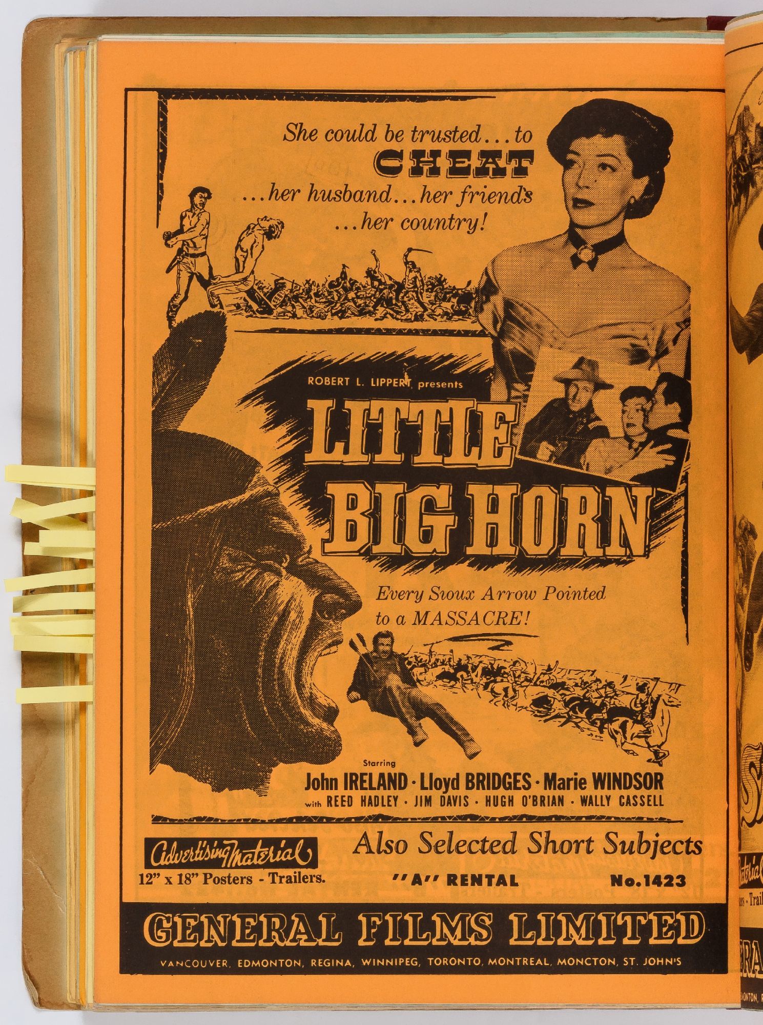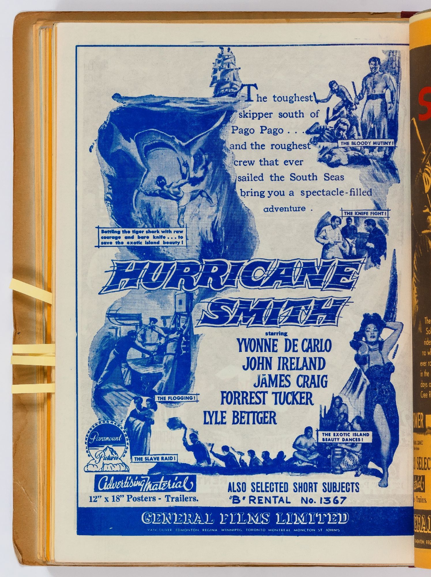 Toronto: General Films Limited, 1954. Softcover. Very Good. Quarter. Prong bound quarter canvas and printed oak tag wrappers. [8]pp. of Legion of Decency ratings, followed by [548]pp. (274 leaves printed both sides) of flyers or advertisements for individual films. A few stains on the wrappers, very good; internally one page is detached, trimmed, and written on, else fine.