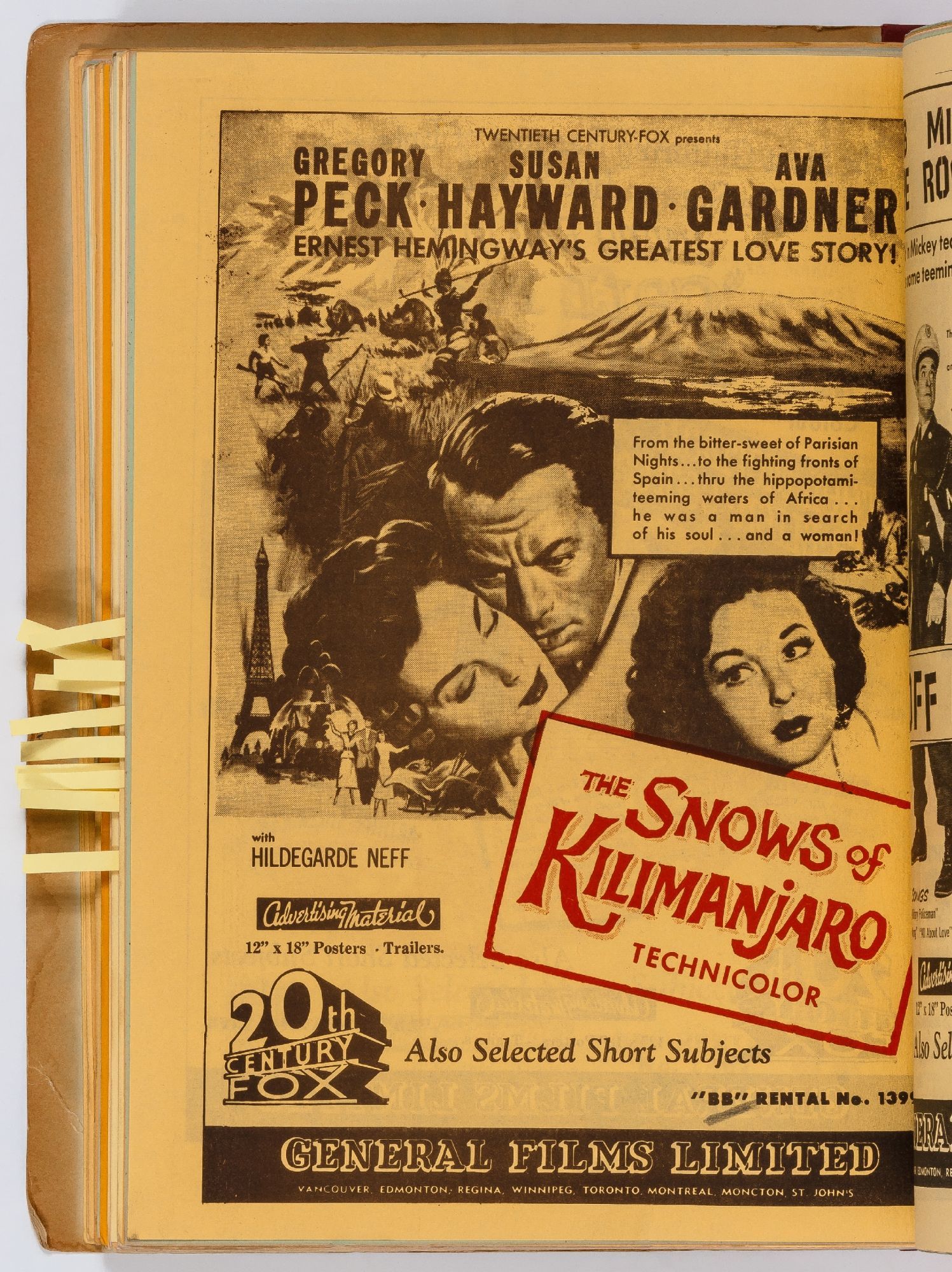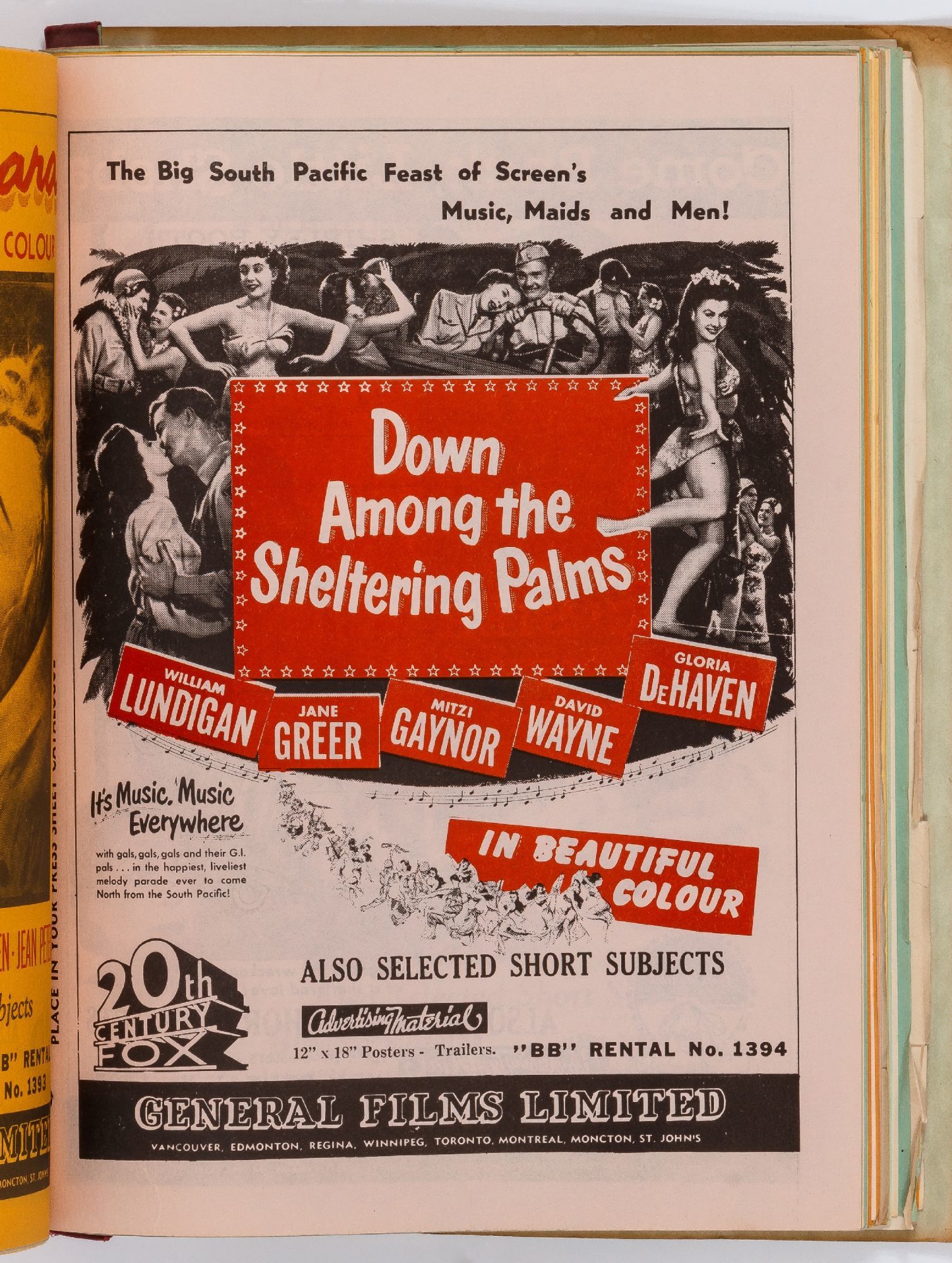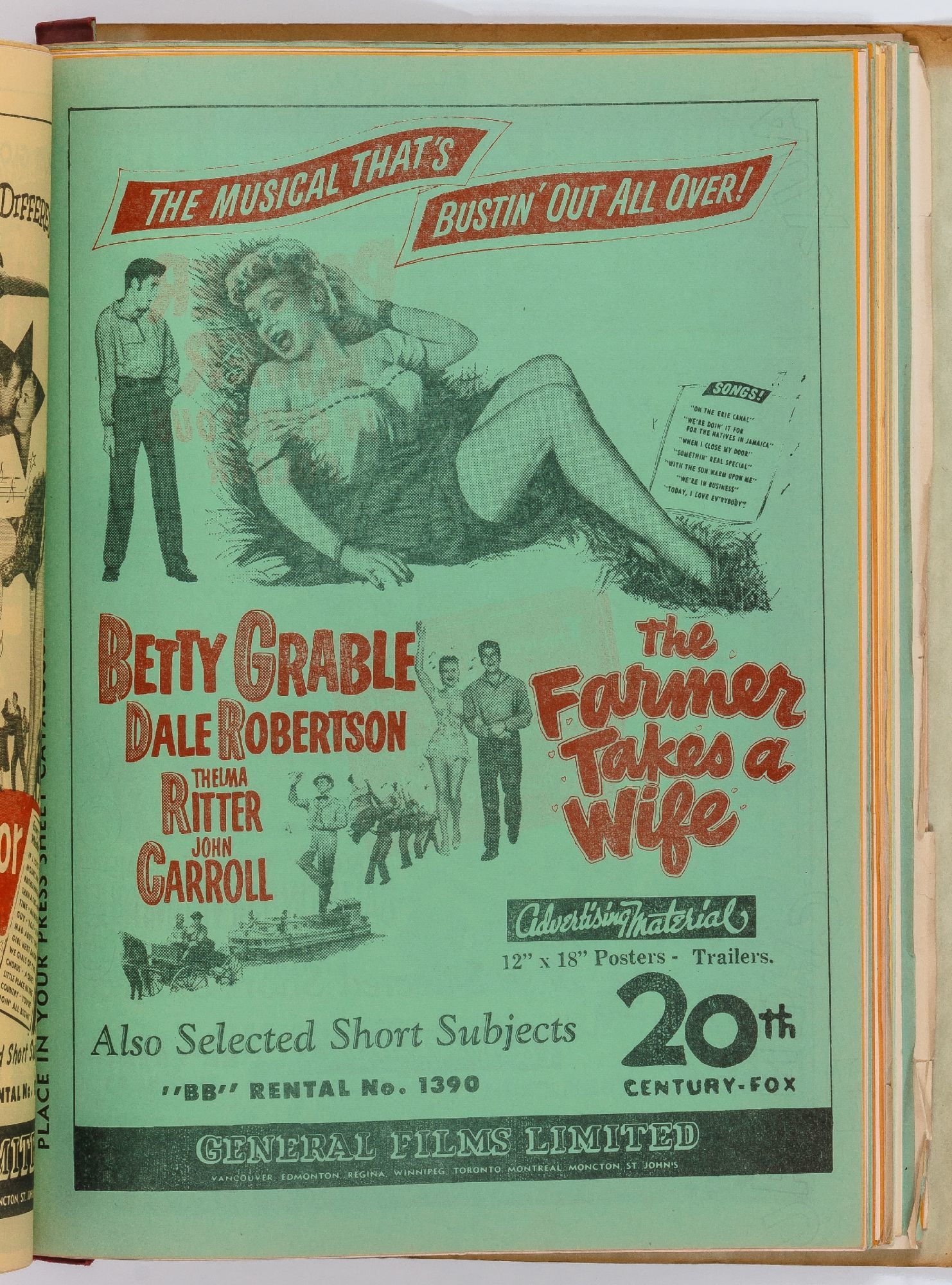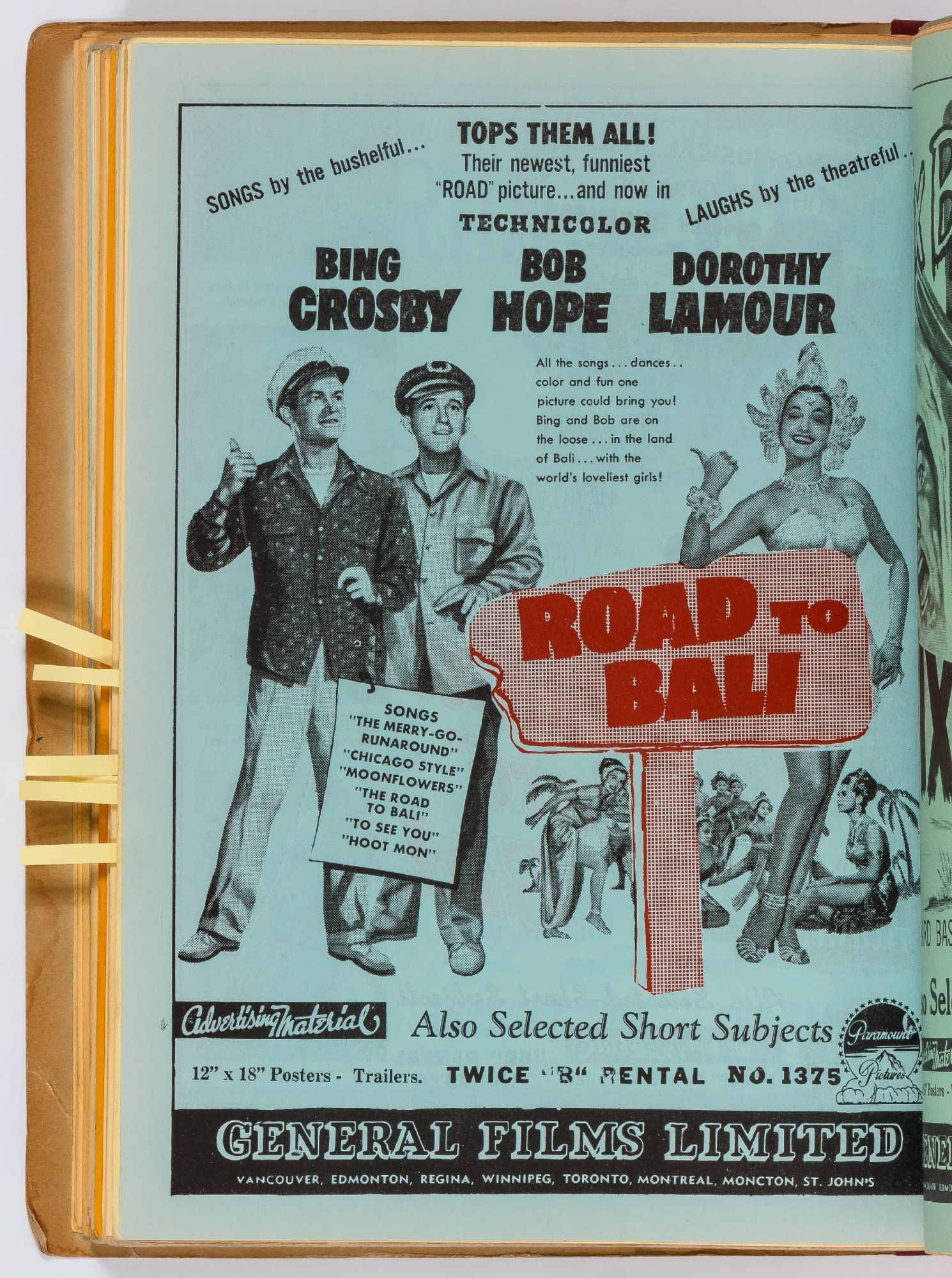 Toronto: General Films Limited, 1954. Softcover. Very Good. Quarter. Prong bound quarter canvas and printed oak tag wrappers. [8]pp. of Legion of Decency ratings, followed by [548]pp. (274 leaves printed both sides) of flyers or advertisements for individual films. A few stains on the wrappers, very good; internally one page is detached, trimmed, and written on, else fine.