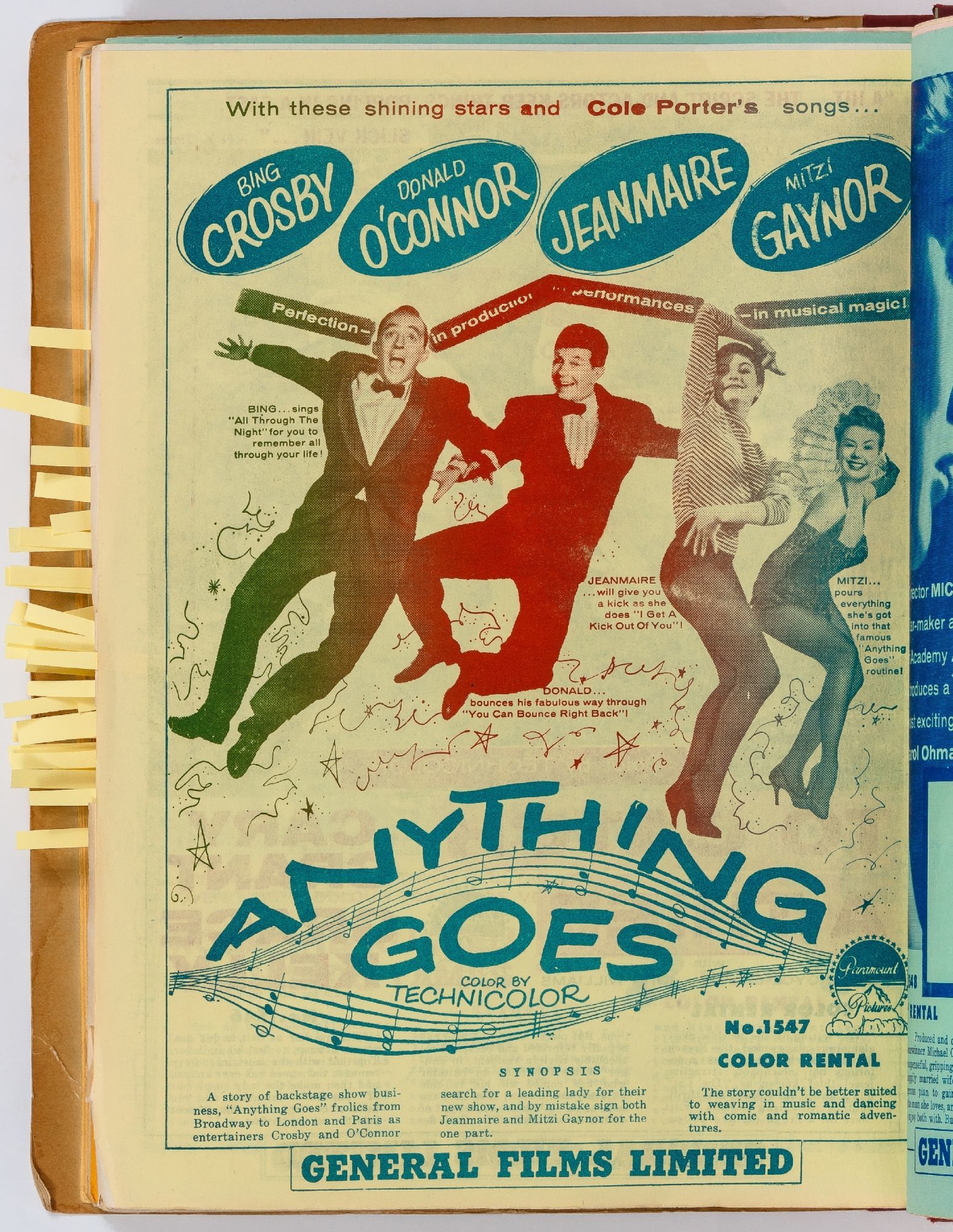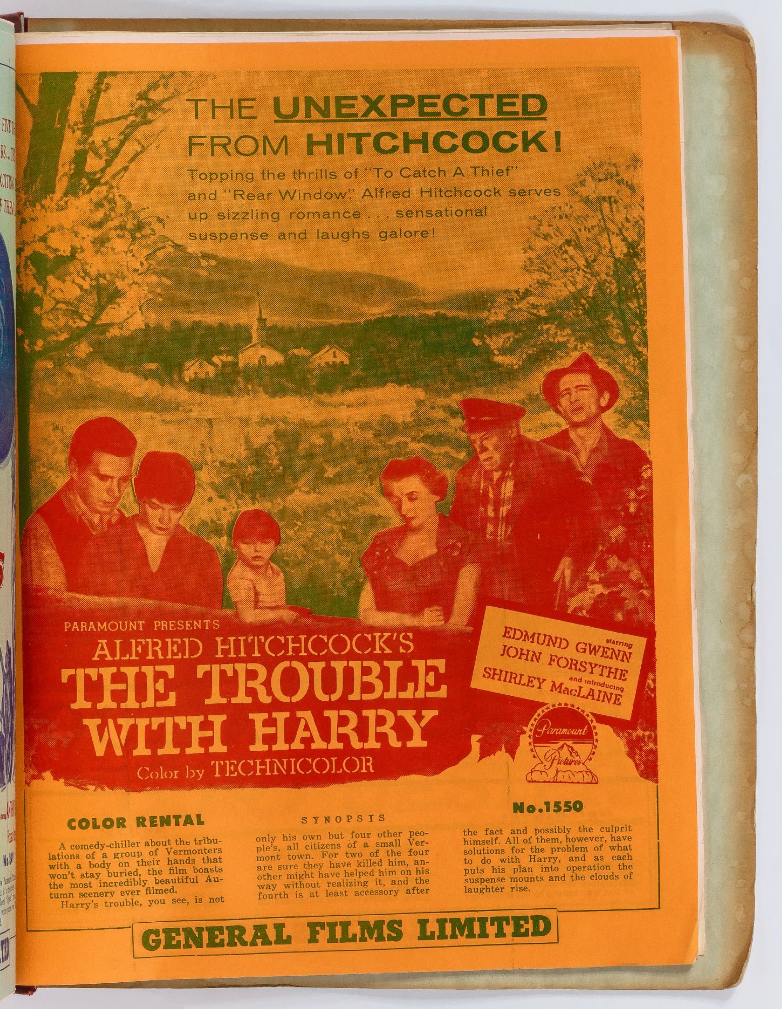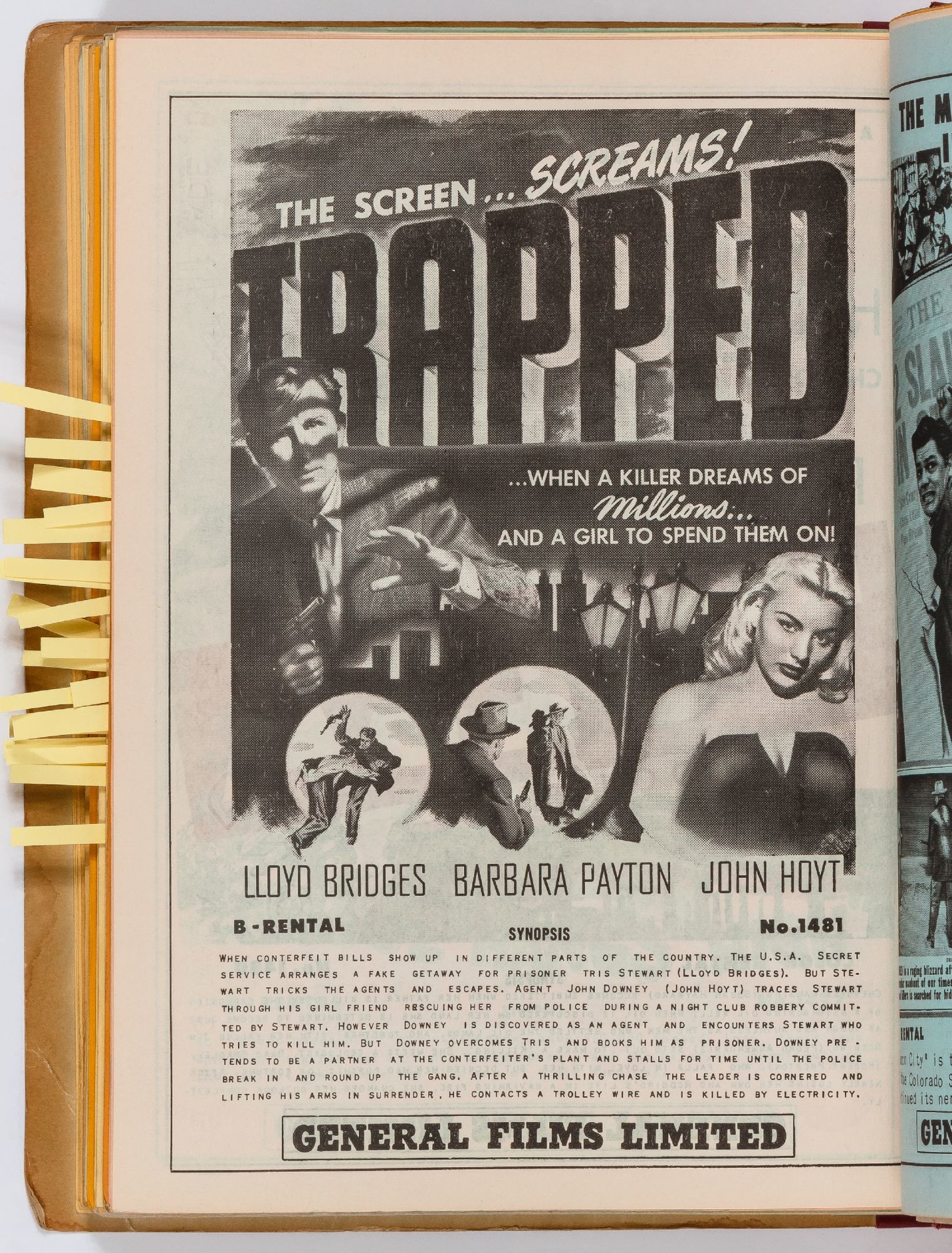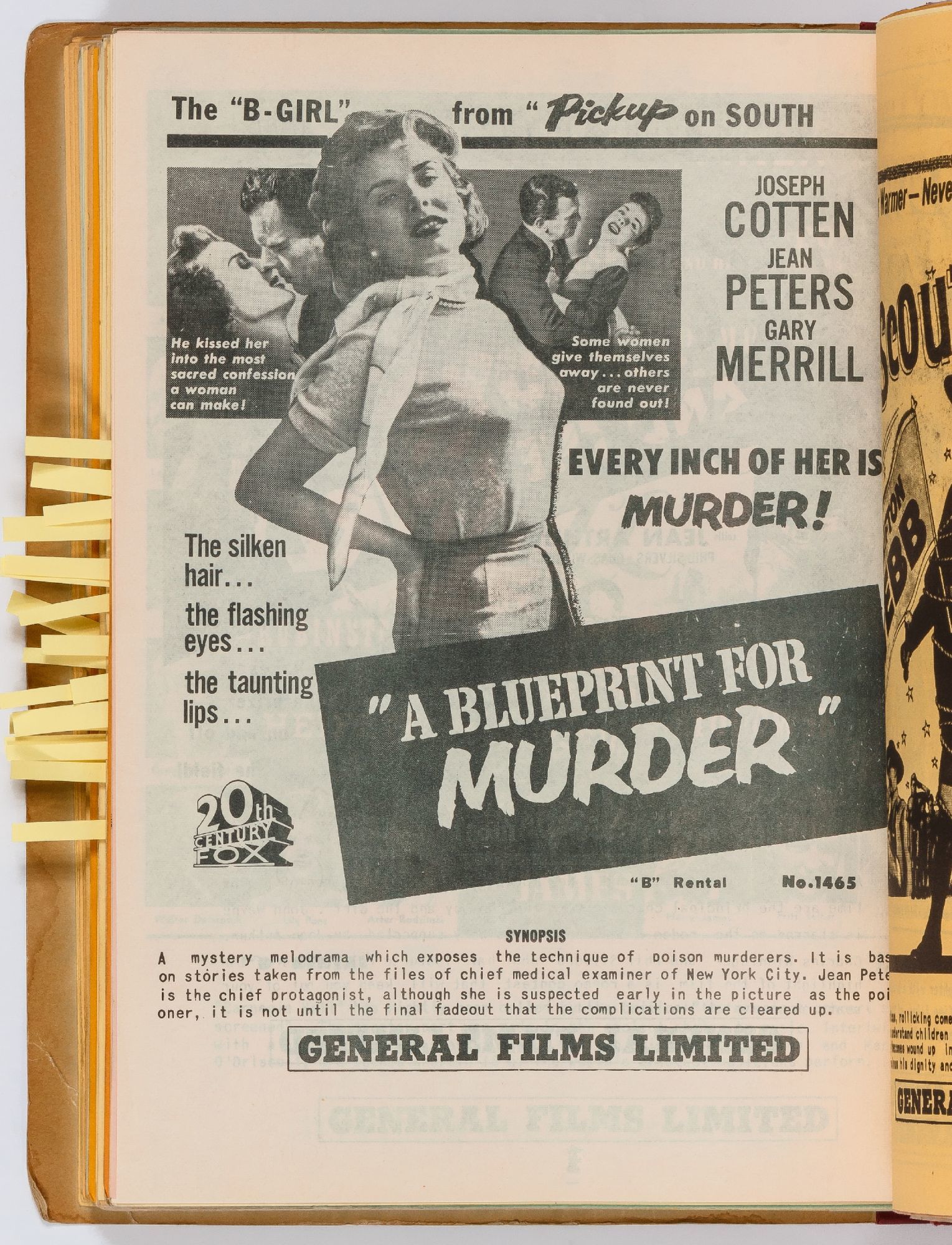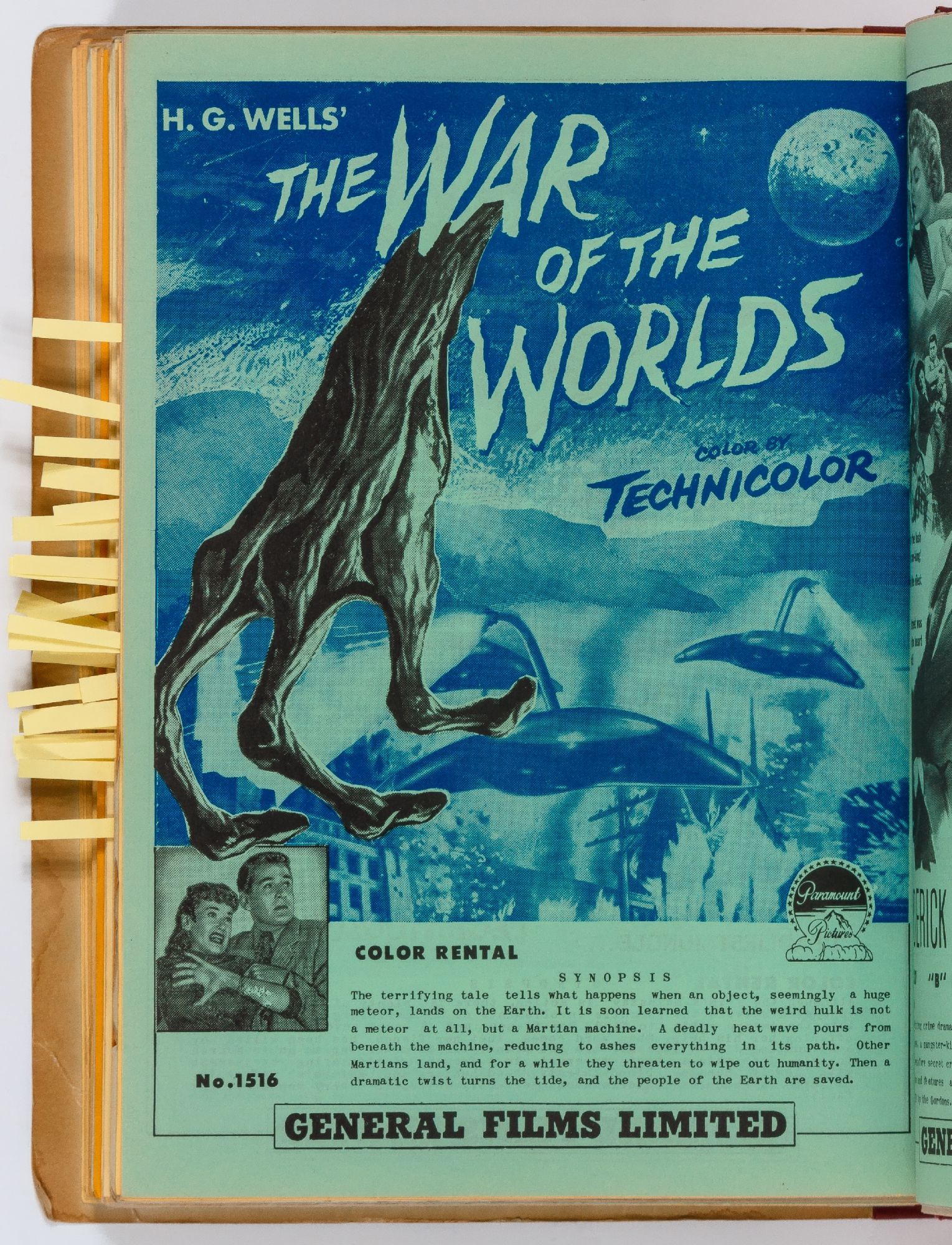 Toronto: General Films Limited, 1954. Softcover. Very Good. Quarter. Prong bound quarter canvas and printed oak tag wrappers. [8]pp. of Legion of Decency ratings, followed by [548]pp. (274 leaves printed both sides) of flyers or advertisements for individual films. A few stains on the wrappers, very good; internally one page is detached, trimmed, and written on, else fine.