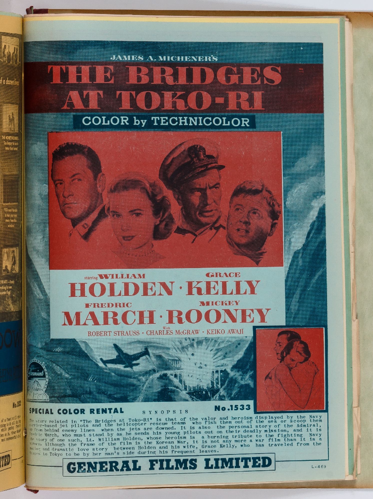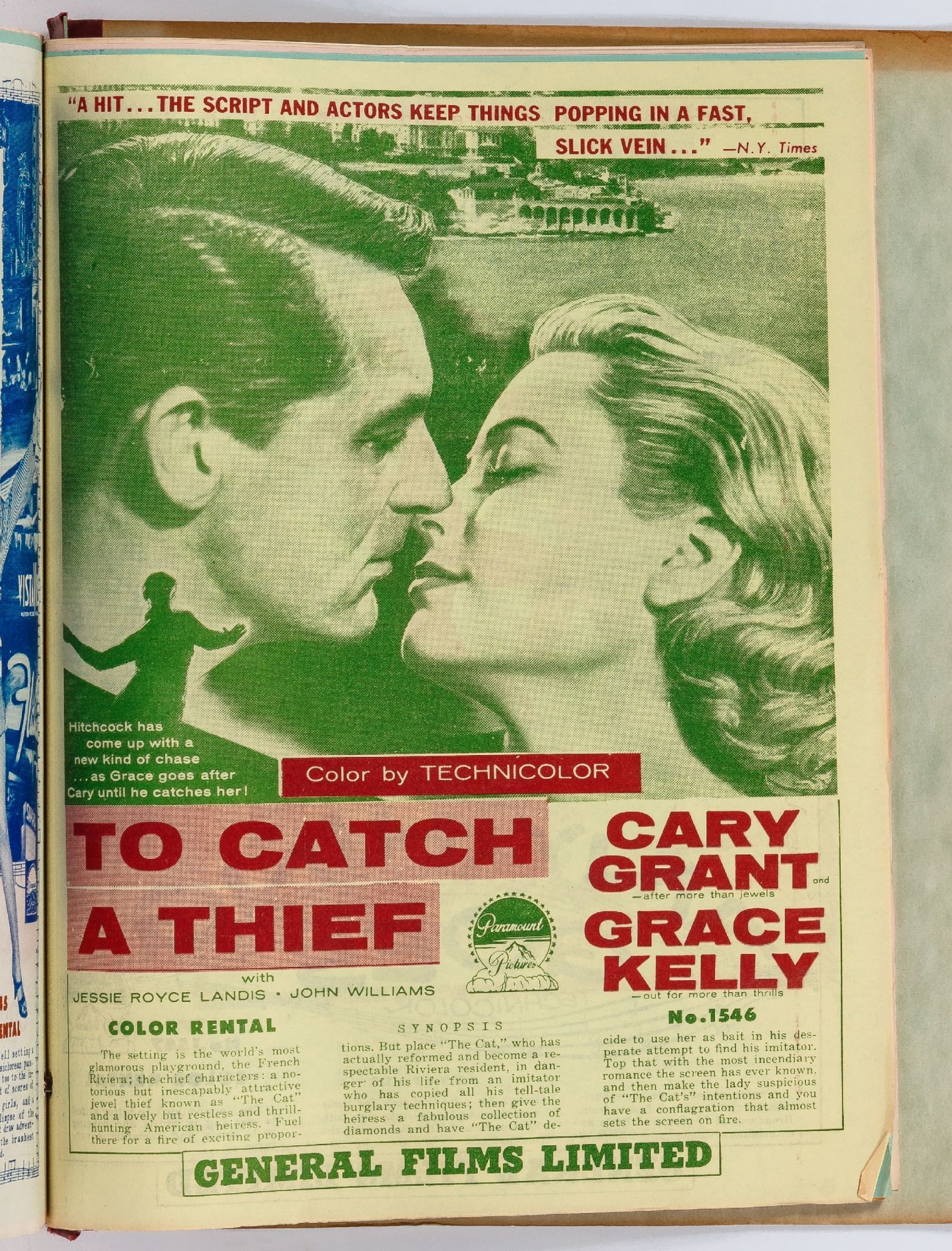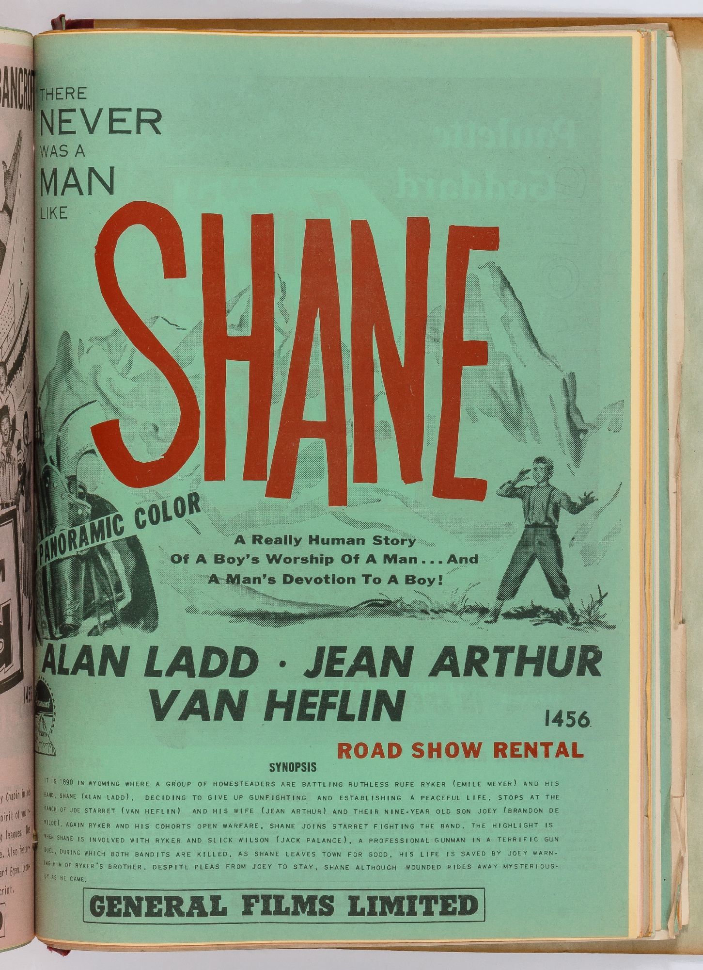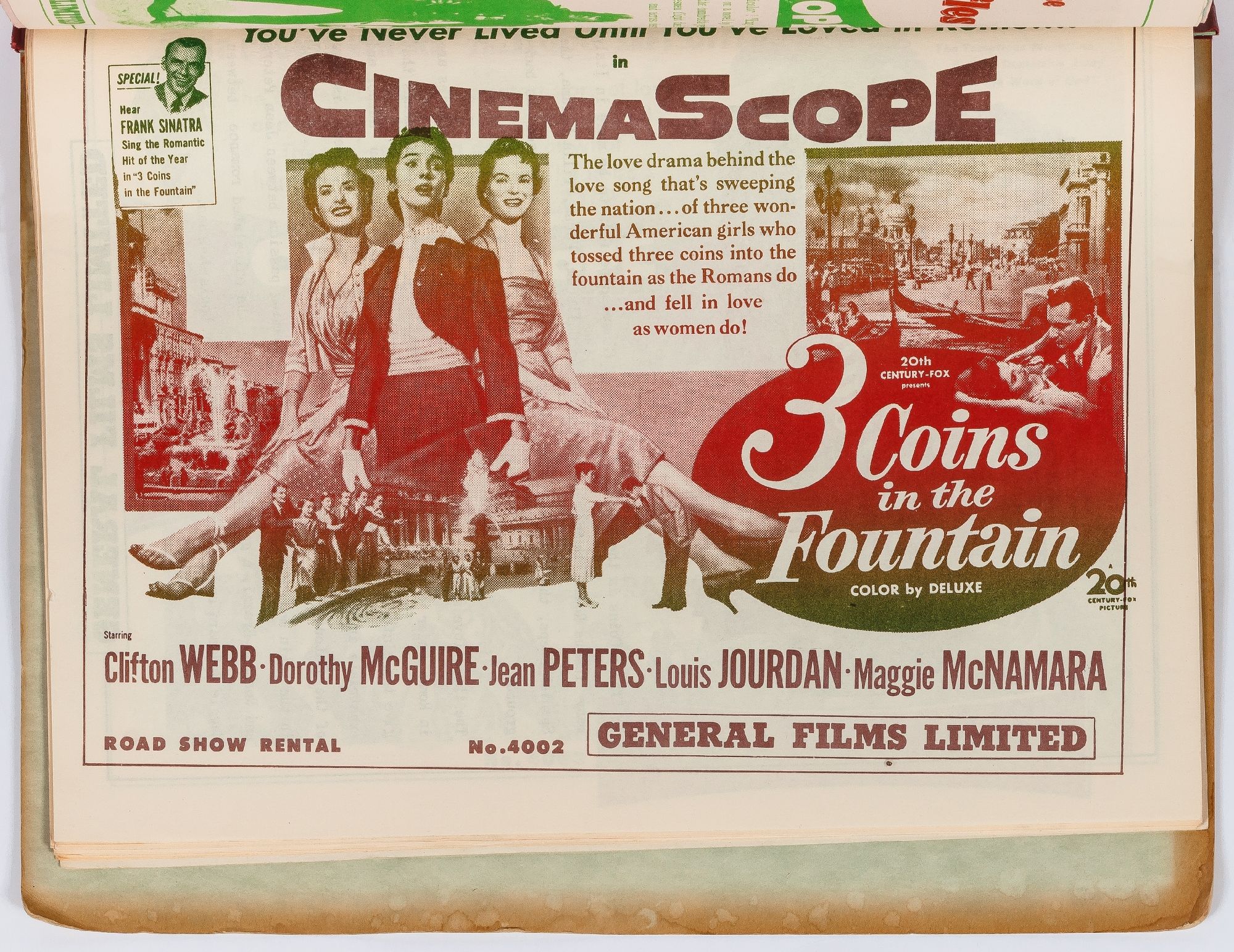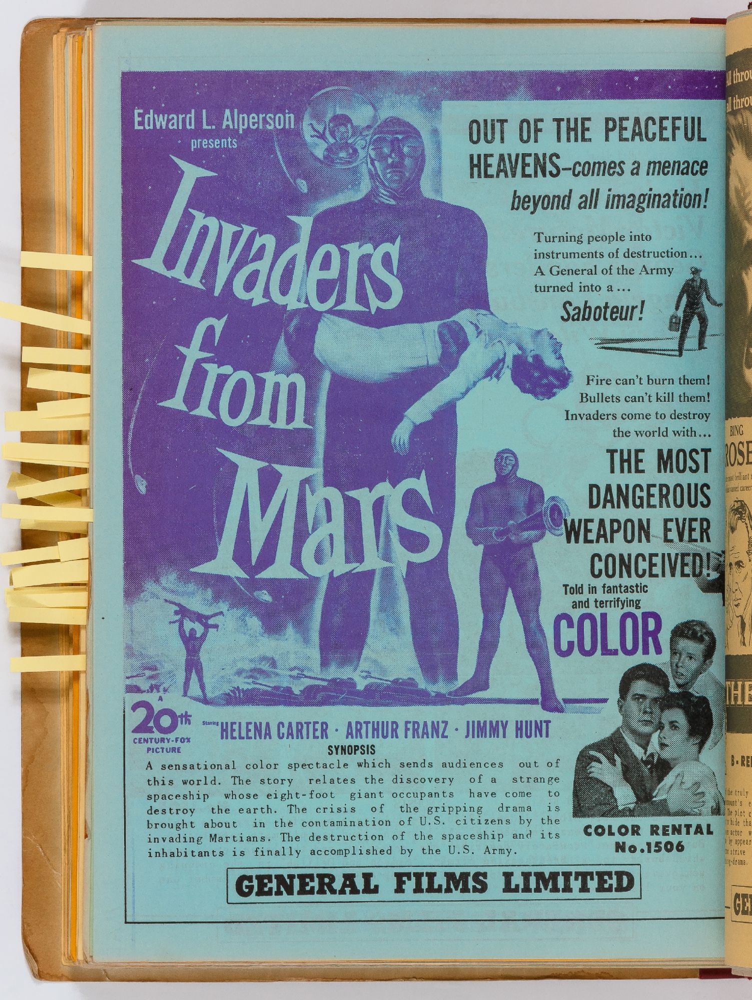 Toronto: General Films Limited, 1954. Softcover. Very Good. Quarter. Prong bound quarter canvas and printed oak tag wrappers. [8]pp. of Legion of Decency ratings, followed by [548]pp. (274 leaves printed both sides) of flyers or advertisements for individual films. A few stains on the wrappers, very good; internally one page is detached, trimmed, and written on, else fine.