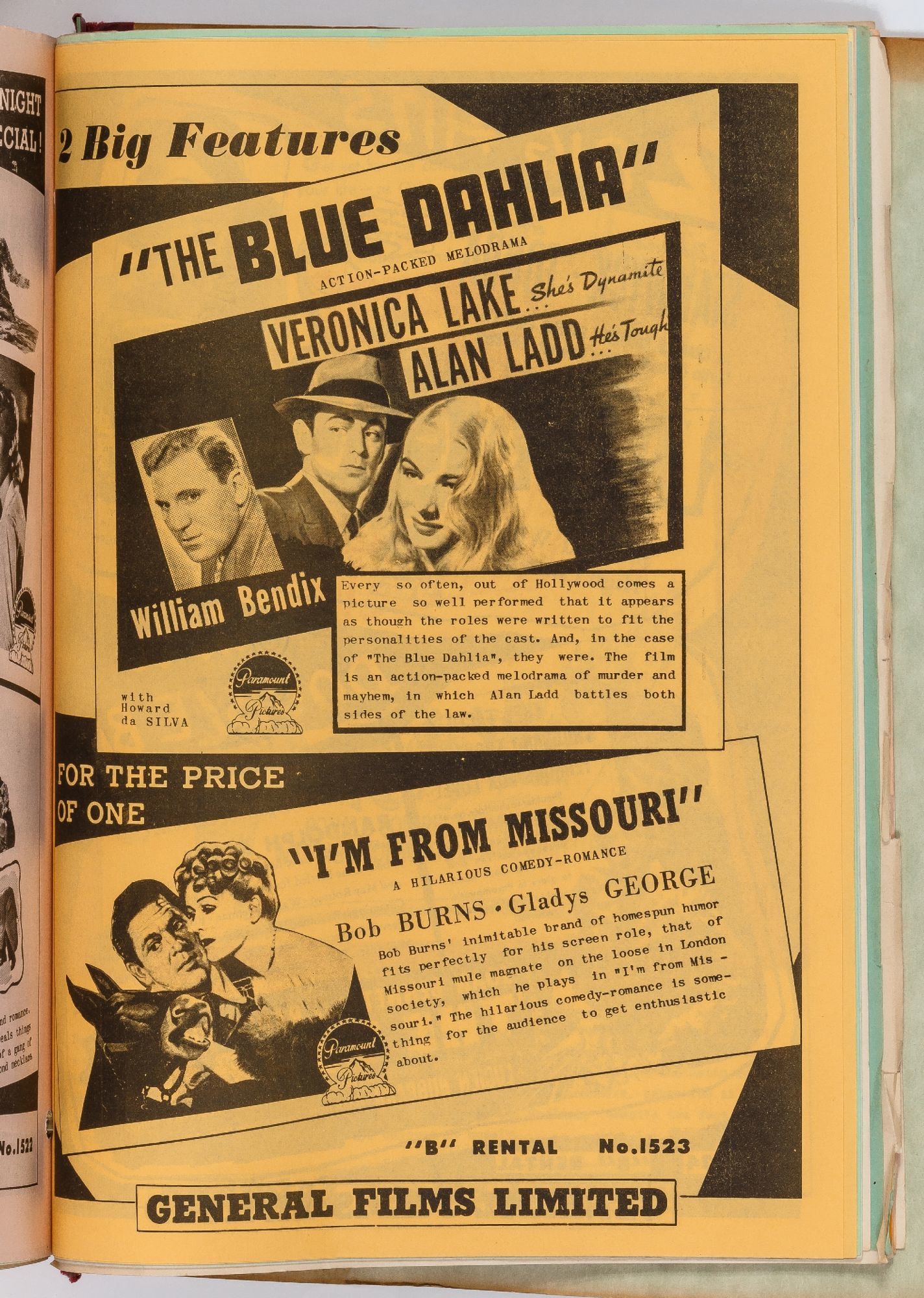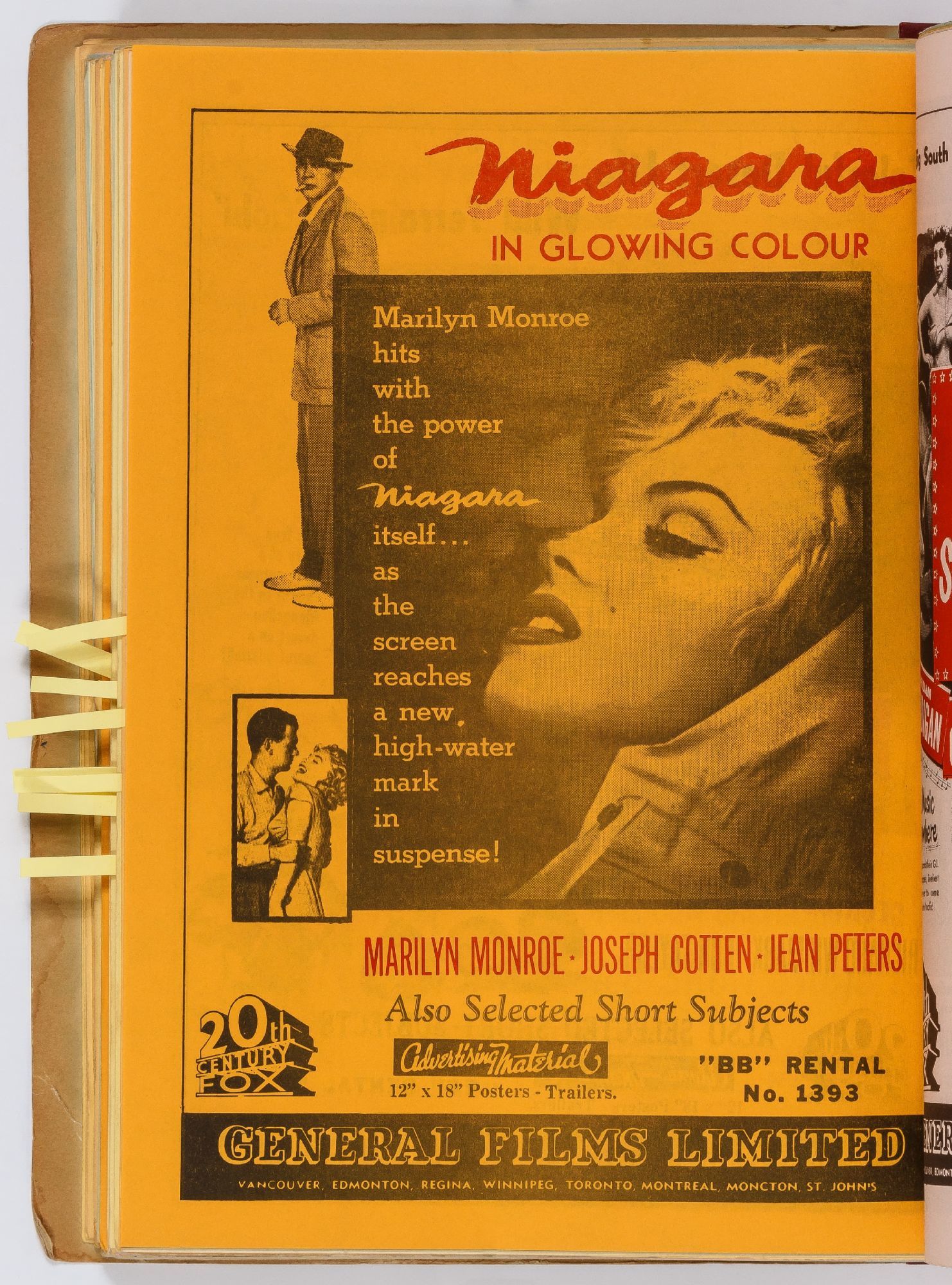 A catalog from a Canadian film distributor intended for movie theater operators, advertising nearly 500 films that were available for lease, including a modest number of serials or short films. While some of the flyers advertise a single film on both sides, a large majority advertise different films on each side of the flyer. The vast majority of the films on offer here where released in 1953 and 1954, with a small number of earlier re-releases, and perhaps a handful that were produced later. There are perhaps two or three duplicates. The flyers are printed on different color paper and occasionally printed in two or more colors. The films represent a wide landscape of cinema of the time, ranging from blockbusters to long forgotten fluff, screwball comedies (many starring Martin and Lewis or Laurel and Hardy), westerns and hardboiled film noire. A large number of flyers meant for theater owners and an important resource.