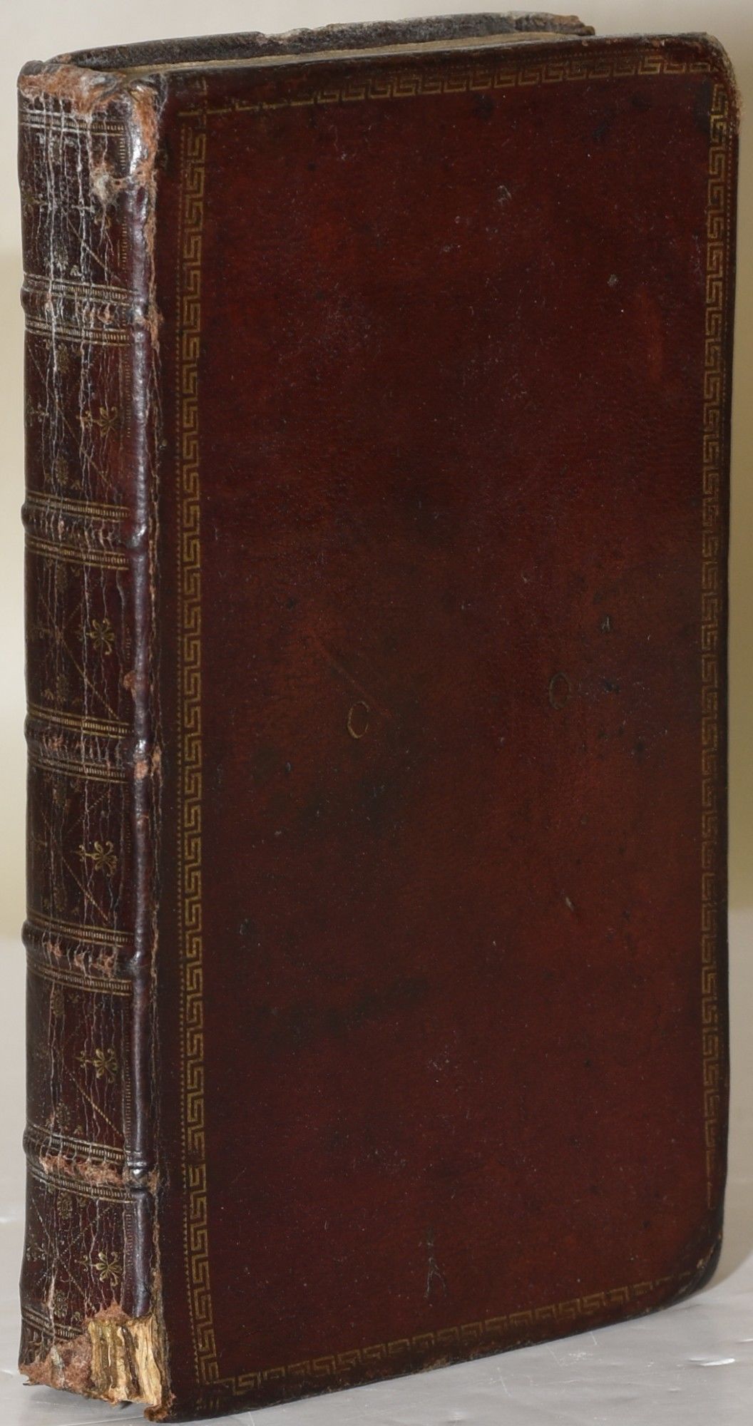 Oxford: Printed by T. Wright and W. Gill, Printers to the University, 1777. Full Leather. Very Good binding. Two volumes bound together for Clarissa Oliver, with her initials stamped at the center of the boards, and her nameplate, with chipping to the edges, on the front pastedown. First volume is the Book of Common Prayer, and the second is the Book of Psalms. Bound in red calf, with a Greek Key rule tolled at the perimeters of the boards, and decorations and decorative rules stamped in gilt in compartments on the spine. Some loss to the bottom of the spine. Marbled endpapers. Creasing to the spine. Very Good binding.