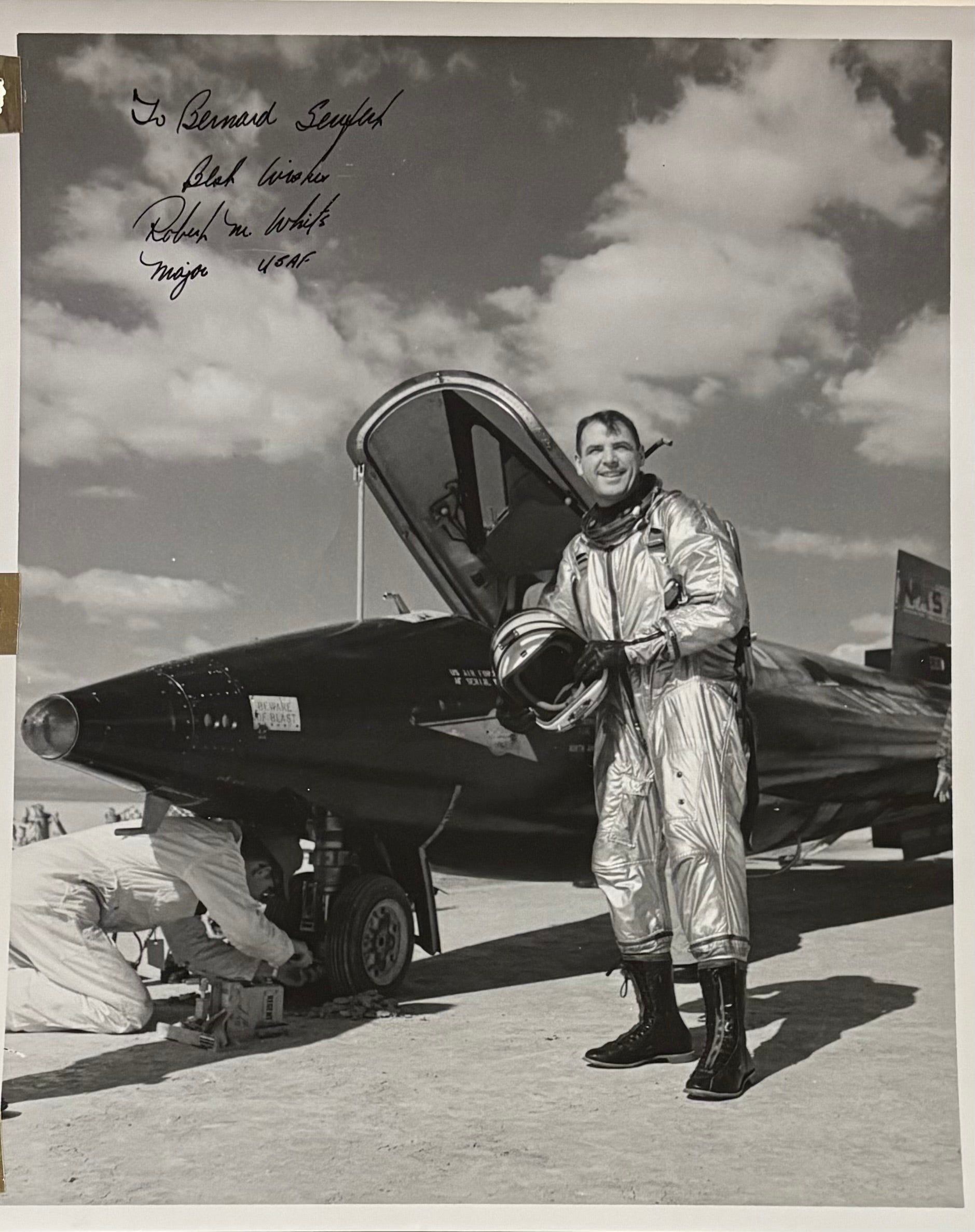 unbound. fine. Black and white glossy photograph, 8" X 10", depicting White in his flight suit holding his helmet while standing next to an X-15 aircraft as it is being serviced by a mechanic. Signed "To Bernard Senfert - Best Wishes - Robert M. White Major USAF." Fine.