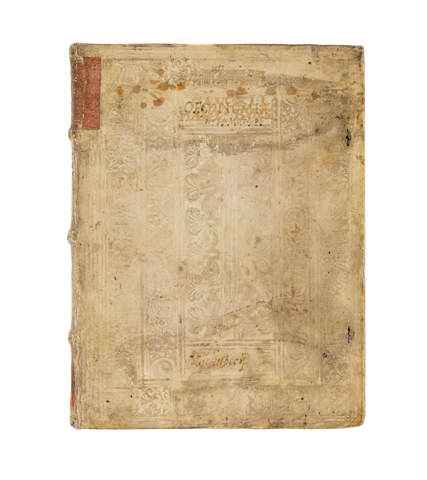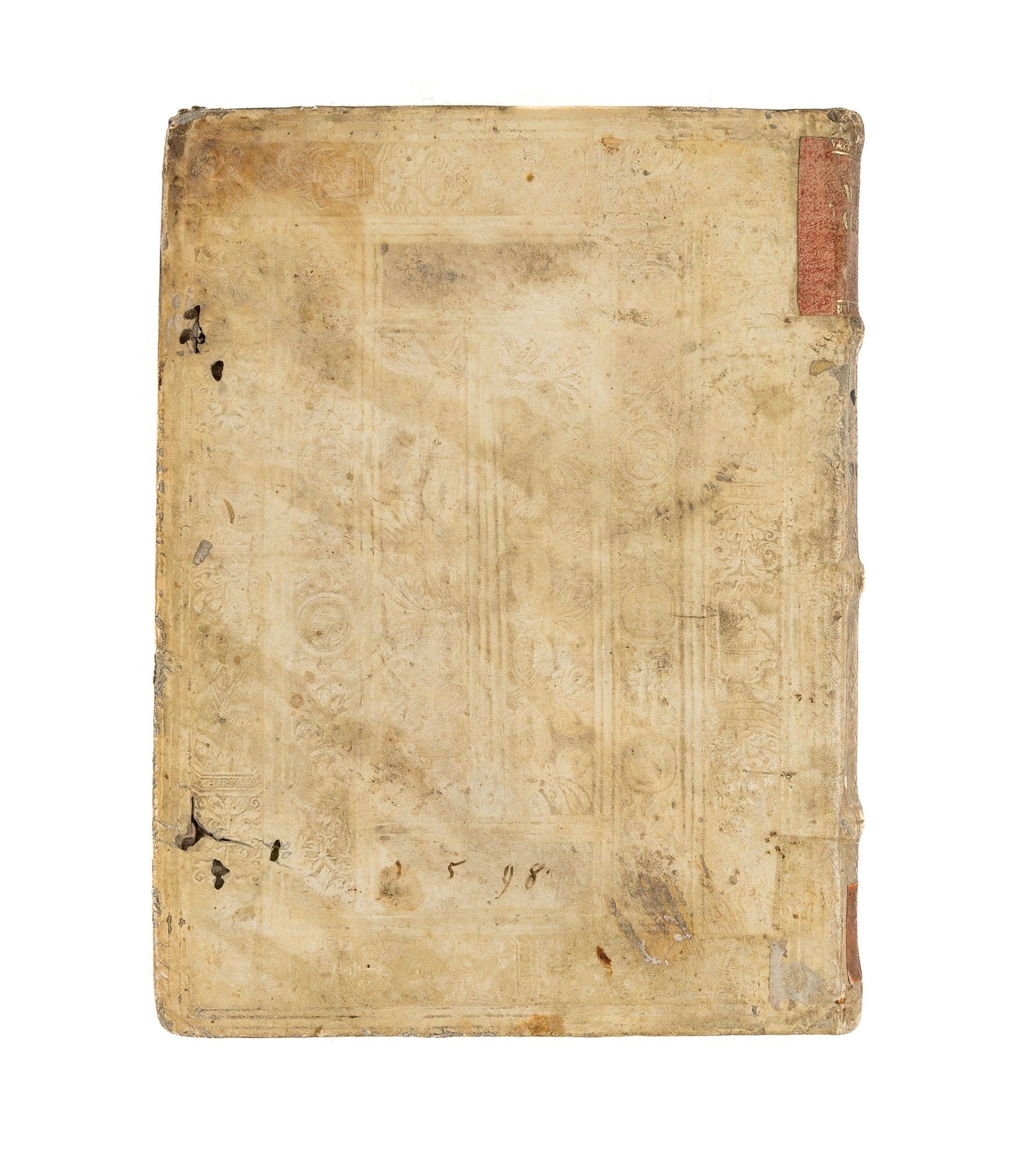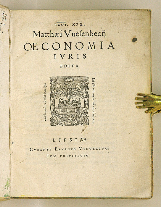 1571. A Sixteenth-Century "Nutshell" of Roman, Feudal and Canon Law Wesenbeck (Wesembeke), Matthaeus [1531-1586]. Oeconomia Iuris. Leipzig: Curante Ernesto Voegelino [Imprimebatur per Andream Schneider, Typis Vogelianis, 1571]. [ii], 383, [21] pp. Quarto (7-1/2" x 5-1/2"; 19.05 x 13.97 cm). Contemporary paneled vellum, gilt-stamped early owner name (Cancell: Mari: Burg:/ 1681) and faint tiny early signature to front board, raised bands, later calf lettering and small paper shelf label to spine, ties lacking. Light soiling, moderate rubbing to extremities, a few minor worm holes to rear board, corners bumped, front free endpaper lacking, front hinge cracked, a few cracks to text block. Moderate toning to text, light soiling and a small inkspot to title page, early ink annotation (shelfmark?) to front pastedown. $1,250. * First edition. Wesenbeck, a leading Belgian humanist jurist who taught at the Universities of Jena and Wittenberg, was a distinguished and prolific scholar of Roman law with a pan-European reputation. A posthumous eight-volume collection of his consilia was published from 1611 to 1624. First published in 1571, Oeconomia Iuris is summary of the Corpus Juris Civilis, the Libri Feudorum and the Corpus Juris Canonici with notes and correspondences. Its final edition was published in 1625. Verzeichnissen der im Deutschen Sprachbereich Erschienenen Drucke des 16. Jahrhunderts W2131.