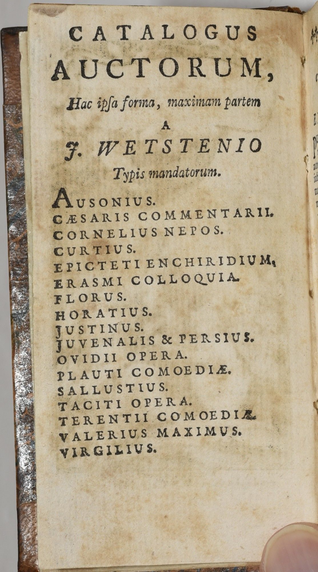 Amstelaedami: Jac. a Wetstein, 1755. First Edition. Half Leather. Very Good binding. A clean copy. Half bound in calf over marbled boards, with a chipped purple morocco label on the spine. Previous owner's name and a bookplate on the front pastedown. 4.75 x 2.75 in. Very Good binding.