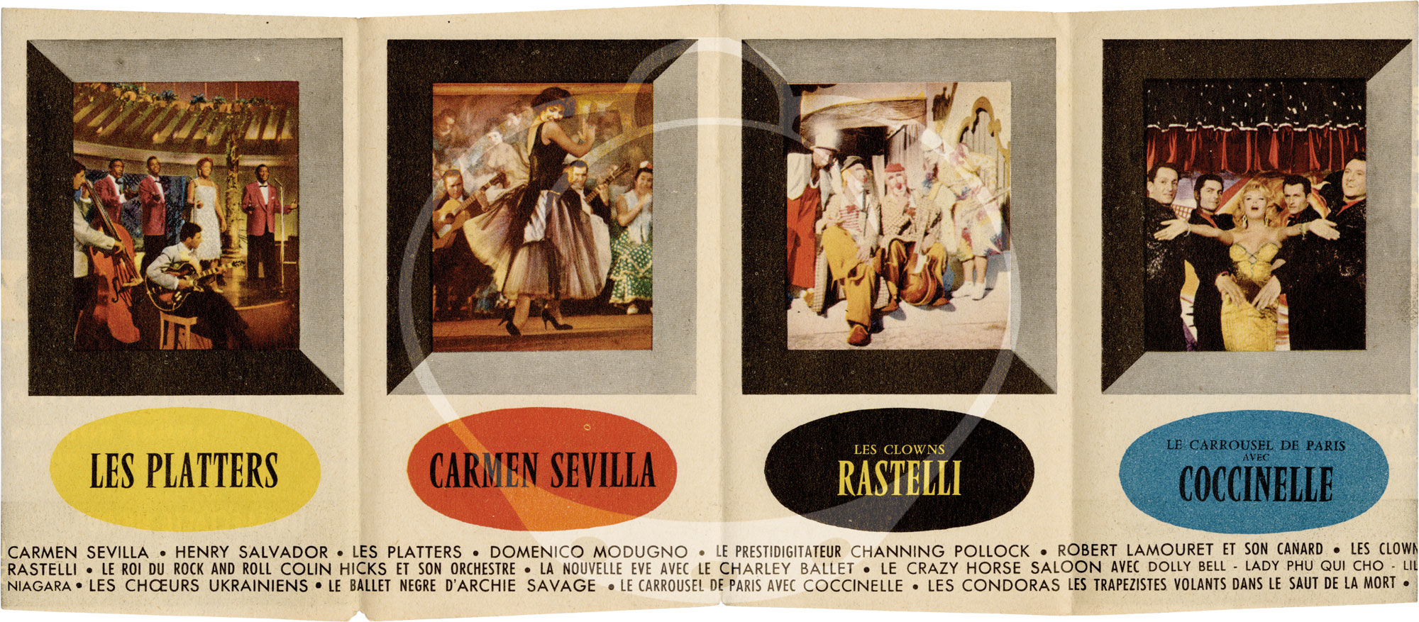 Paris: Cinémato, 1959. Original French program for the 1959 Italian-French film, here under the original French title, "Nuits d'Europe." Lavish and compact, the program fits in a shirt pocket and unfolds to reveal four panels of bright primary colors, showcasing various performers seen in the film.