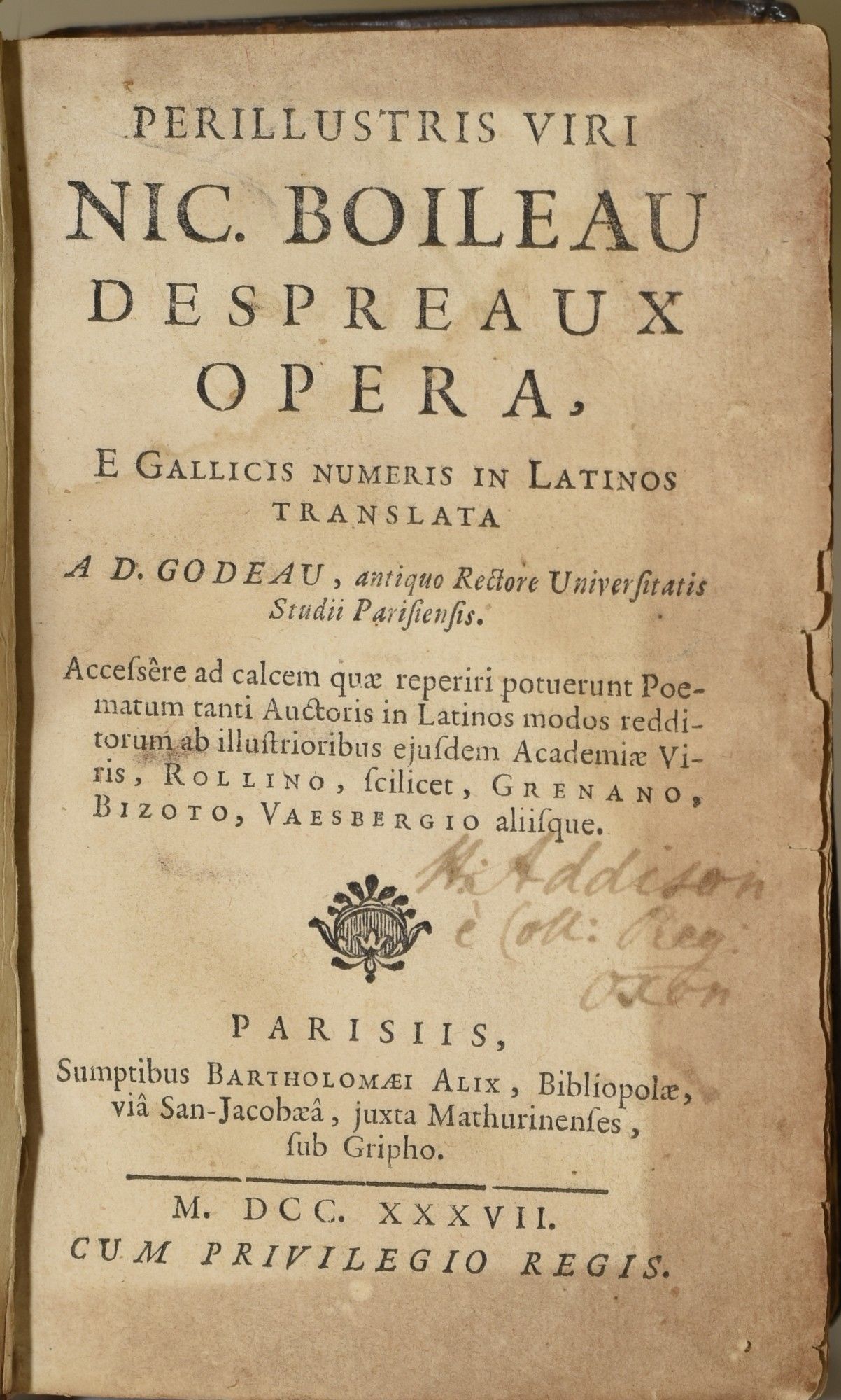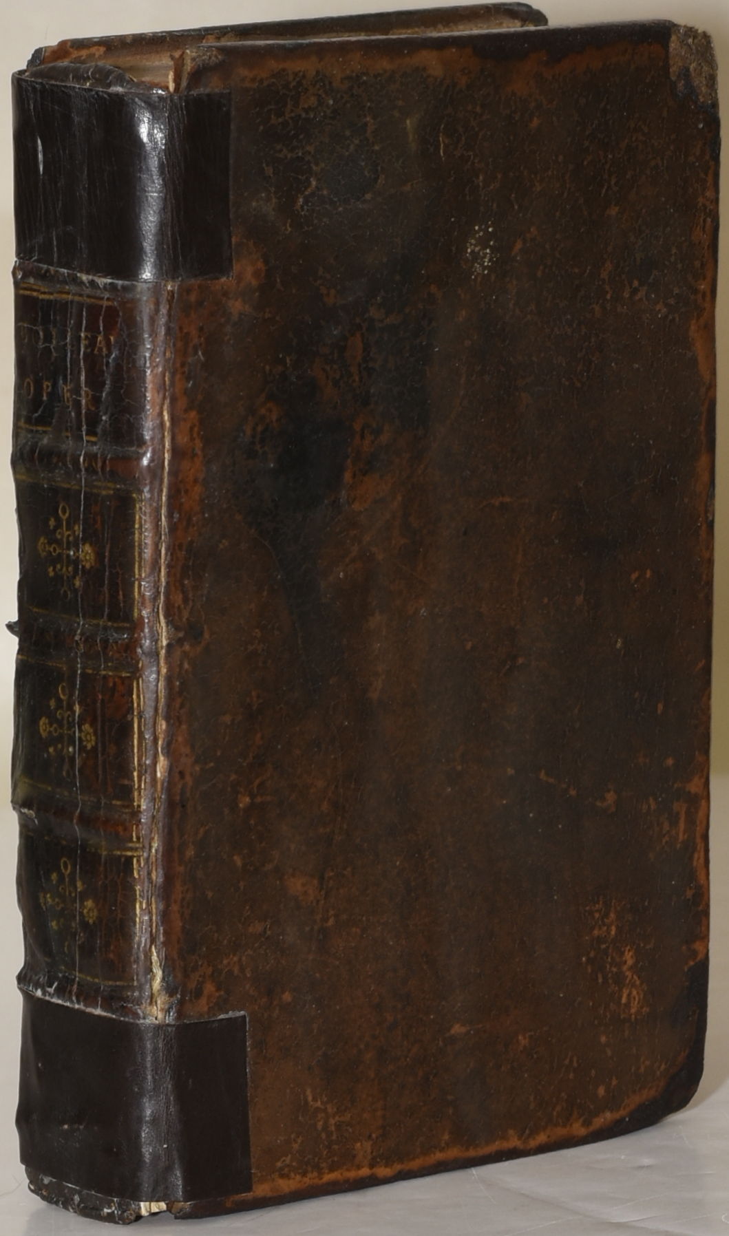 Parisiis: Sumptibus Bartholomaei Alix, 1737. Full Leather. Good binding. The works of Nicolas Boileaus Despreaux, translated into Latin. Bound in morocco with lettering and decoration stamped in gilt in compartments. Front board detached, and now reinforced with leather bands across the top and bottom of the spine. Wear to the spine. Toning and previous owner's names to the title page and pastedown. Lacking front endpaper. Good binding.