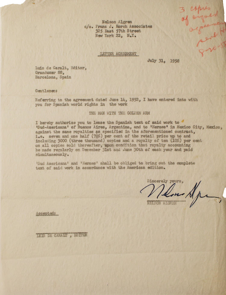 Typed agreement signed ("Nelson Algreen"), regarding rights for a Spanish language edition of The Man with the Golden Arm