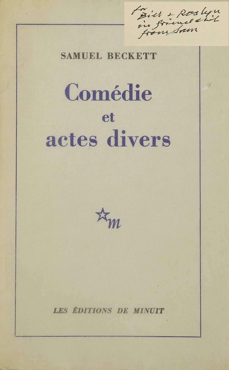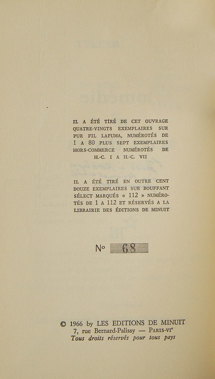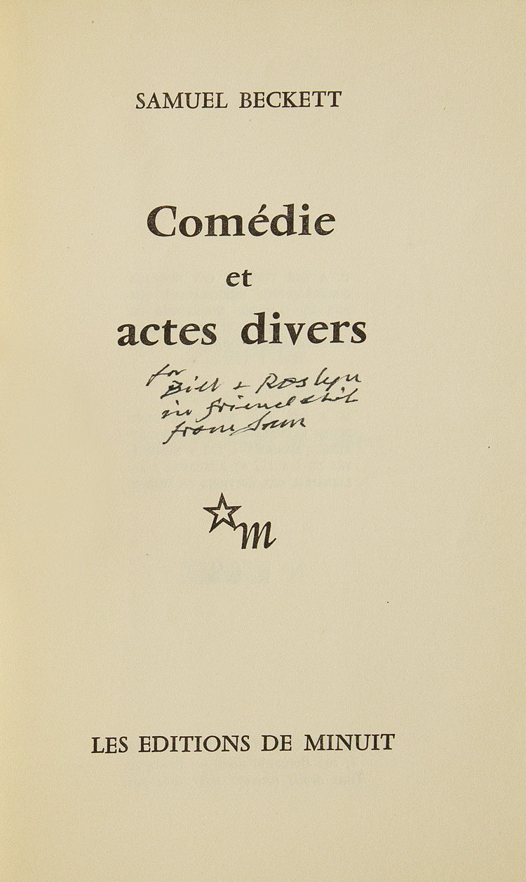 Paris: Les éditions de minuit, 1966. #68 of 80 copies printed on pur fil Lafuma. 99, [5] pp. 12mo. Original French wrappers, glassine; unopened. Fine. #68 of 80 copies printed on pur fil Lafuma. 99, [5] pp. 12mo. Inscribed on the title page: "for Bill & Roslyn in friendship from Sam". William Targ (1907-1999), was an editor and then head of Putnam's before founding his own imprint, Targ Editions; he was also a noted bibliophile and Beckett collector. His wife Roslyn Targ (1925-2017), was Beckett's literary agent.