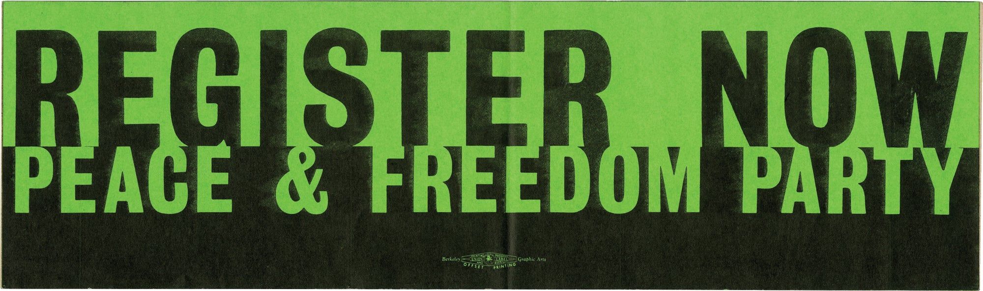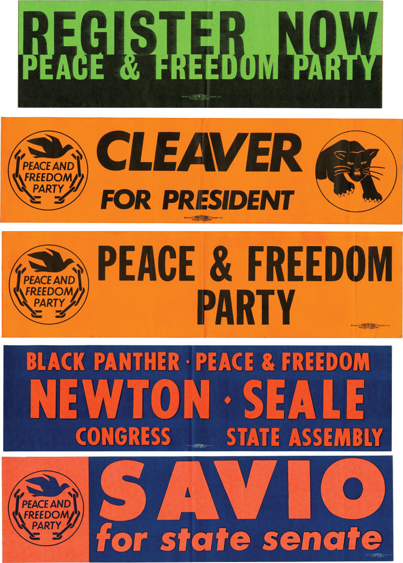 Berkeley: Berkley Graphics Arts, 1968. Collection of five vintage bumper stickers from the 1968 political campaigns run via a collaboration between the Black Panthers and the Peace and Freedom Party.