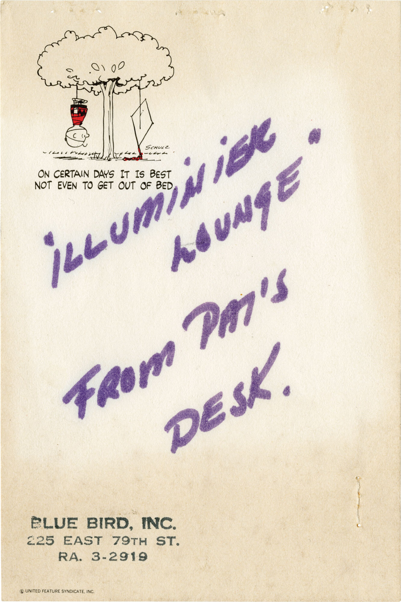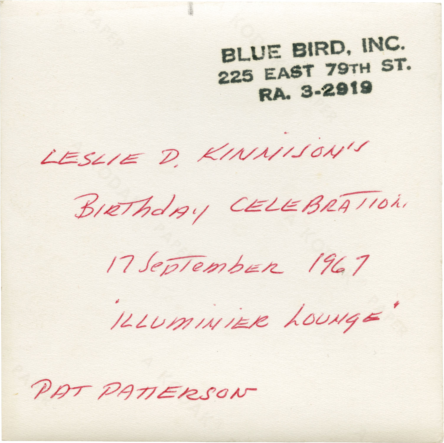 N.p.: N.p., 1967. Archive of four double weight, color vernacular photographs taken at the Illumineer Lounge, an African American club or bar in Chicago, 1967. Each photograph with manuscript annotations on the verso identifying the location, date ("17 September 1967"), and occasion ("Leslie D. Kinnison Birthday Celebration"), along with the stamp of Blue Bird, Inc, a jukebox rental company. Also included in a business card and note belonging to Blue Bird employee Pat Patterson.