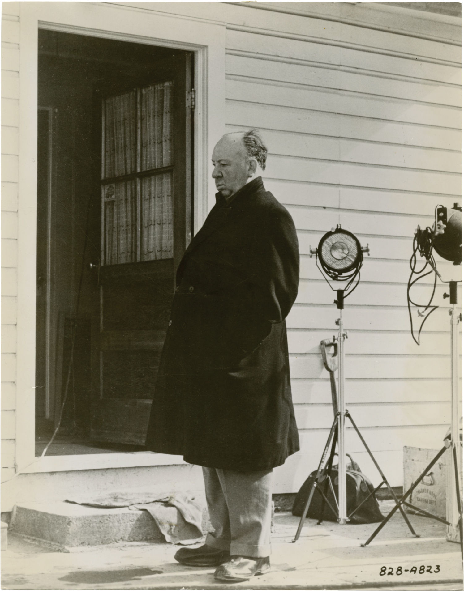 Burbank, CA: Warner Brothers, 1956. Vintage borderless photograph of a contemplative Alfred Hitchcock on the set of the 1956 film. With the stamp of Warner Brothers Netherlands on the verso.