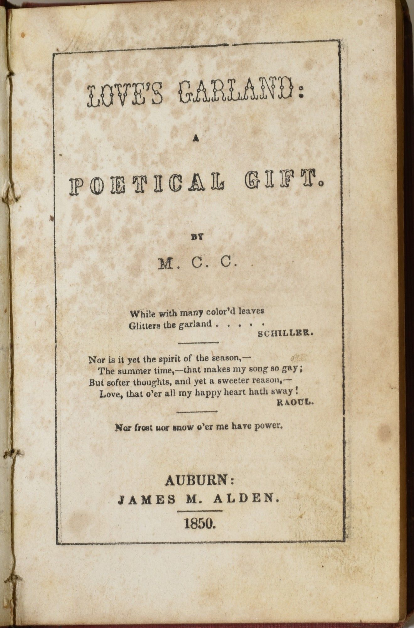 Auburn: James M. Alden, 1850. Hard Cover. Good binding. A collection of poetry. Bound in red embossed cloth with lettering and illustration stamped in gilt on the front board and spine. Wear to the corners of the boards and extremities of the spine. Writing in pencil on the endpapers and flyleaves. Foxed throughout. 32mo. Good binding.