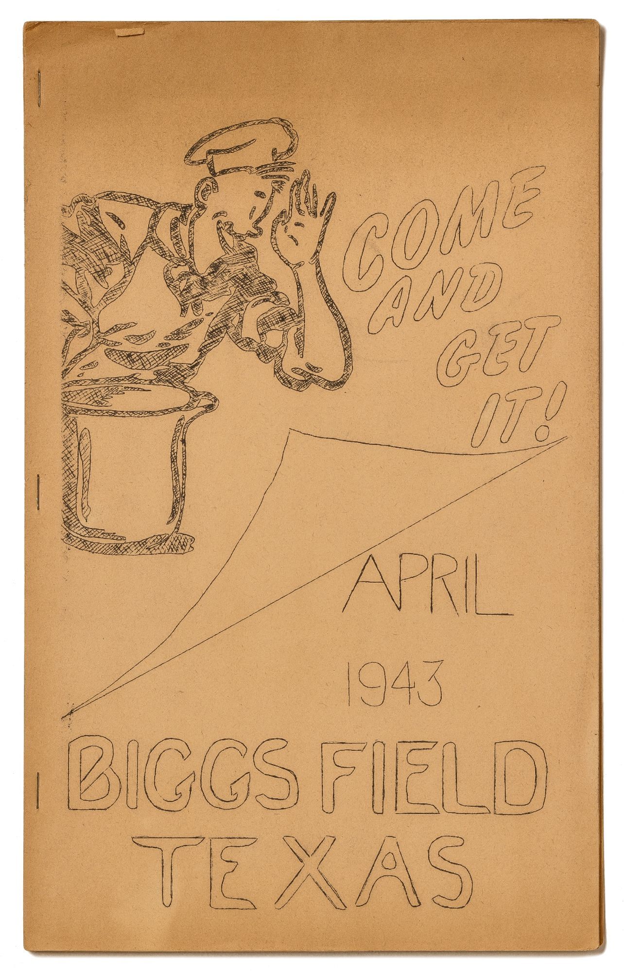 Fort Briggs, Texas, 1943. Softcover. Near Fine. Two volumes. Mimeographed leaves in stapled Illustrated mimeographed wrappers. Slight toning on the pages with some tiny tears else about near fine. A pair of menus for the mess hall at Biggs Field, Texas for the months of April and May, 1942. Each volume includes daily menus for each month, with the ingredients allocated to feed 100 people at a time. Such delicacies as cabbage and pineapple salad are featured here. Biggs Field is a military airport and part of Fort Bliss military base in El Paso, Texas. According to the Texas Historical Association, "in the summer of 1942 it became headquarters of the Twentieth Bomber Command and the Sixteenth Bombardment Operational Training Wing; B-17, B-24, and B-29 crews trained there.
