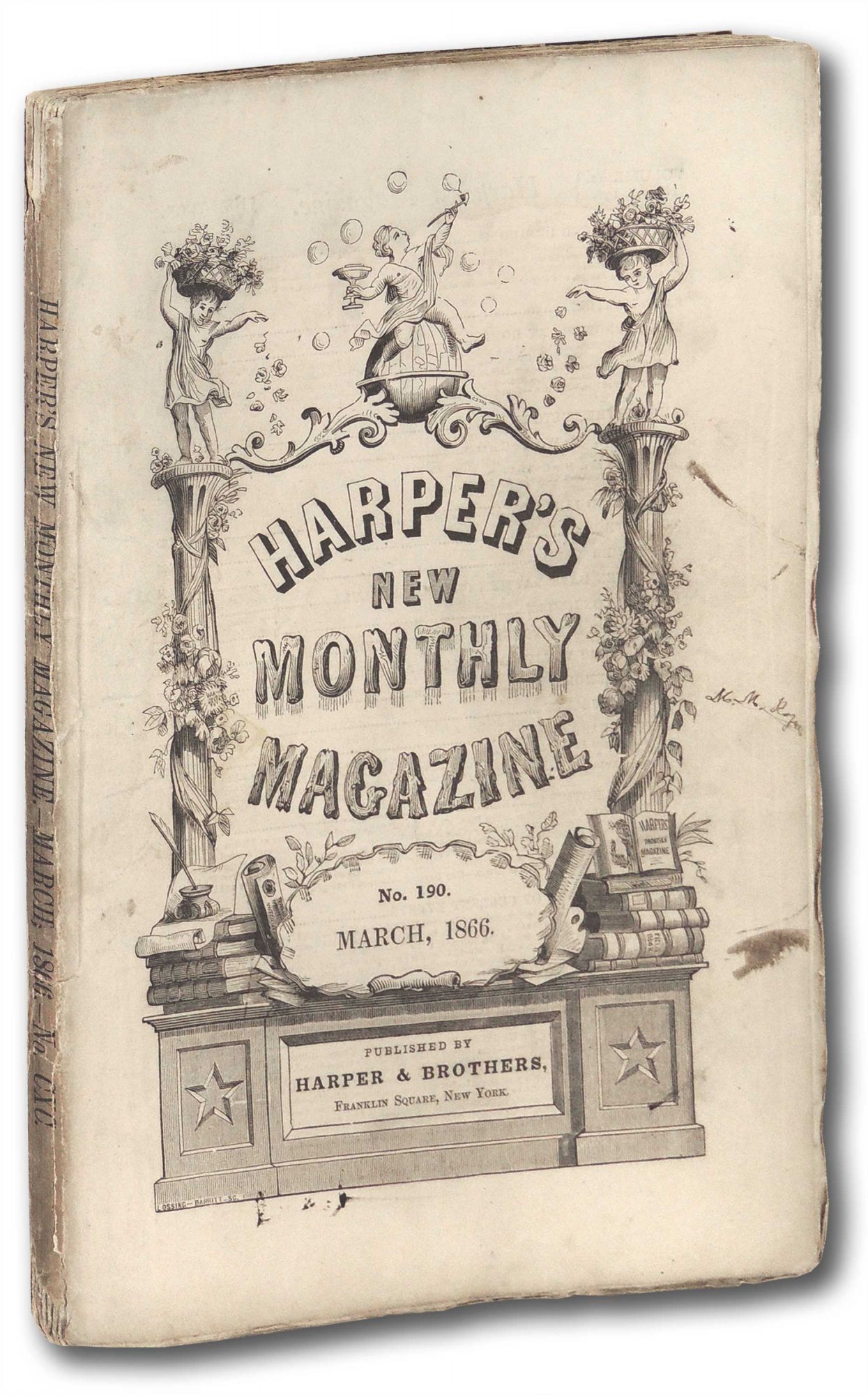 New York: Harper & Brothers, 1866. Hardcover. Very Good. Hardcover. Includes the first printing of Melville's poem "The Cumberland" on page 474. Also includes chapters from "Armadale" by Wilkie Collins. In the original paper wrappers with black title to spine and front cover. Heavy chipping / loss to paper on top and bottom of spine (about two inches of loss, not affecting the title). Rubbing and light soiling to covers. Occasional spots of foxing to interior. Illustrated. Pages 409 - 544 plus advertisements. PER/050718.