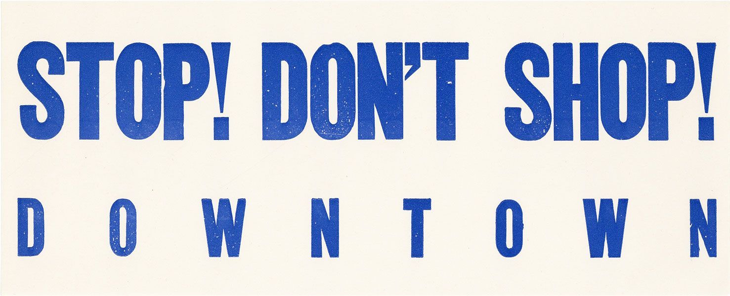 [Chicago: Chicago Area Friends of the Student Nonviolent Coordinating Committee, 1963]. Original window decal, with text silk-screened in blue on white gummed paper, measuring 31.5cm x 12.75cm (12.5" x 5"). A Fine example. Attractive, ephemeral relic of the 1963 "Stop! Don't Shop Downtown" Campaign, coordinated by the Chicago Area Friends of the Student Nonviolent Coordinating Committee (CAFSNCC) in conjunction with the Coordinating Council of Community Organizations (CCCO). The Campaign called for the ouster of Chicago School Superintendent Benjamin C. Willis, "and for the adoption of a positive policy for integration by the Chicago School Board. This action, supported by a growing number of community organizations, is the follow up to an Oct. 22nd FREEDOM DAY School Boycott, in which over 200,000 students and parents participated in the largest civil rights action in the country's history. The purpose odf the downtown boycott is to pressure business leaders, who have openly supported Willis" (The Student Voice, December 16, 1963, p.4). Not separately cataloged in OCLC, though we note an example held by Emory University.