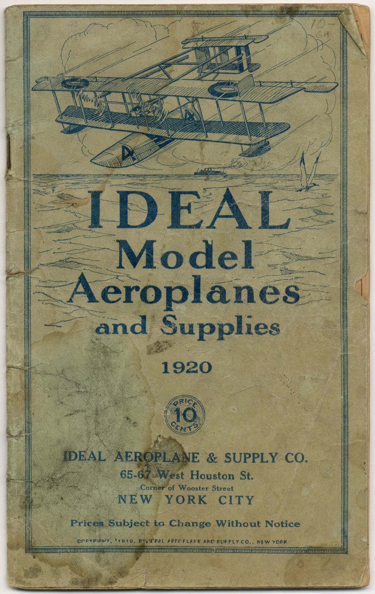 New York: Ideal Model Aeroplane and Supply Co, 1920. Softcover. Good. 24mo. 48pp. Illustrated. Stapled illustrated wrappers. Stain and small chips and tears on front wrap, else good. Well-used trade catalog for a model airplane maker.