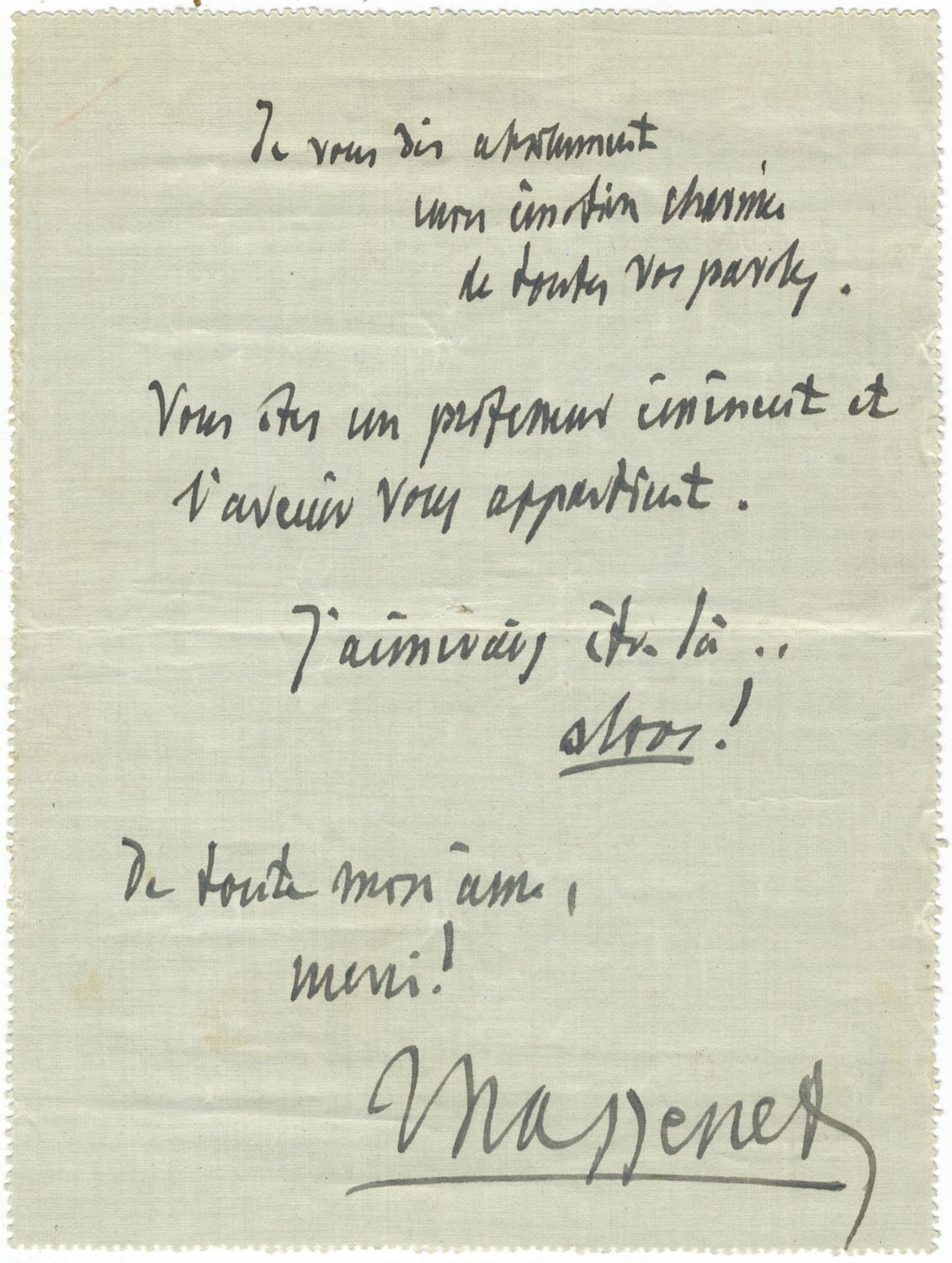 "Je vous dis absolument mon émotion charmée de toutes vos paroles. Vous êtes un professeur éminent et l'avenir vos appartient. J'aimerais être la... alors! De toute mon âme, merci! Massenet."