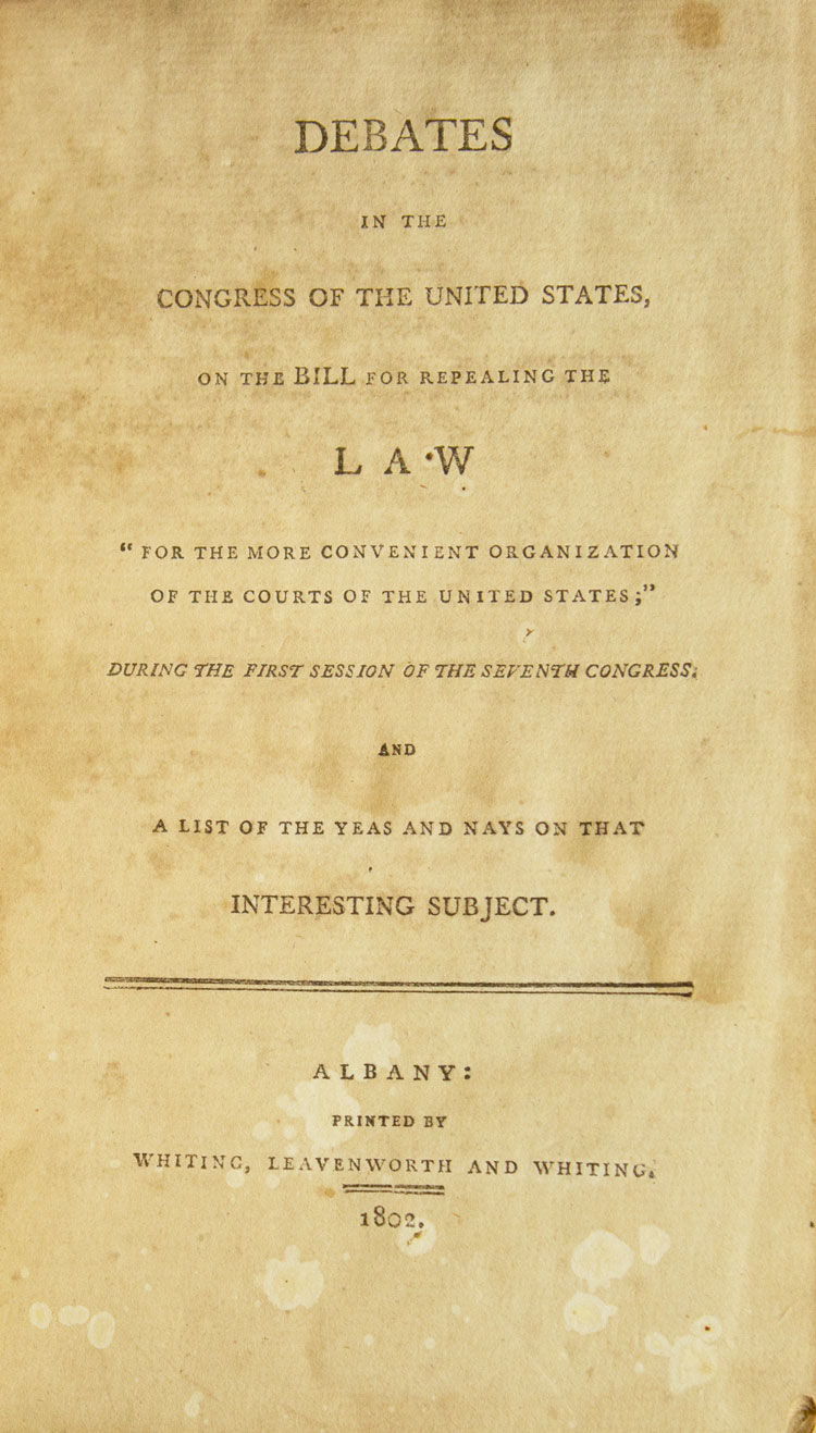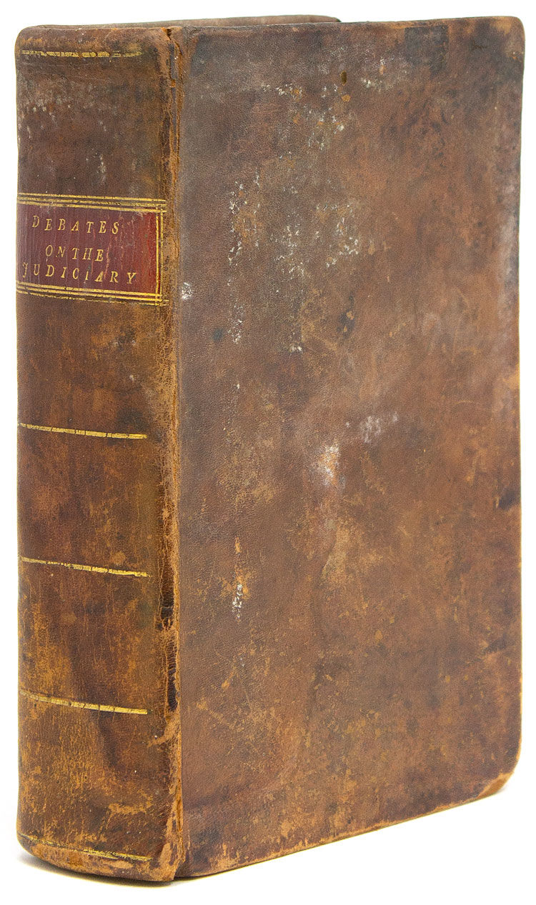 Albany, NY: Whiting, Leavenworth and Whiting, 1802. First edition. iv, [5]-796pp. 8vo. Contemporary mottled sheep, red leather title label. Minor foxing, else very nice copy. First edition. iv, [5]-796pp. 8vo. Debates on the repeal of the Judiciary Act of 1801, which was rushed through by the Federalists at the end of Adams' term. The act had been intended to strengthen the judiciary and had created new circuit judgeships, which were quickly filled by Adams in "midnight" appointments. It was opposed by the Jeffersonians, who wanted a weaker judicial branch